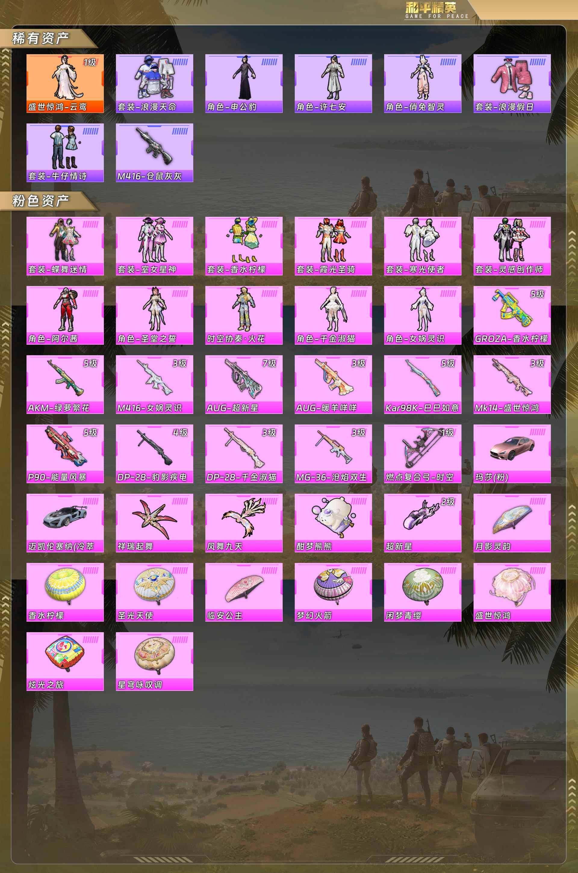 公主号-地铁满天赋/红装云鸾[1级]/粉熊背包/浪漫天命/浪漫假日/牛仔情诗/蝶舞迷情/套装-室女星神/香水柠檬/霞光圣骑/寒光使者/灵感创作师/阿尔茜/圣堂之誓/时空协奏·火花/千金淑猫/女娲灵识/GROZA香水柠檬[5级]/M4女娲灵识[3级]/AUG超新星[7级]/Mk14盛世惊鸿[3级]/P90能量风暴[5级]/玛莎拉蒂/迈凯伦塞纳/11粉装12粉枪2载具/没战神框 hp2677