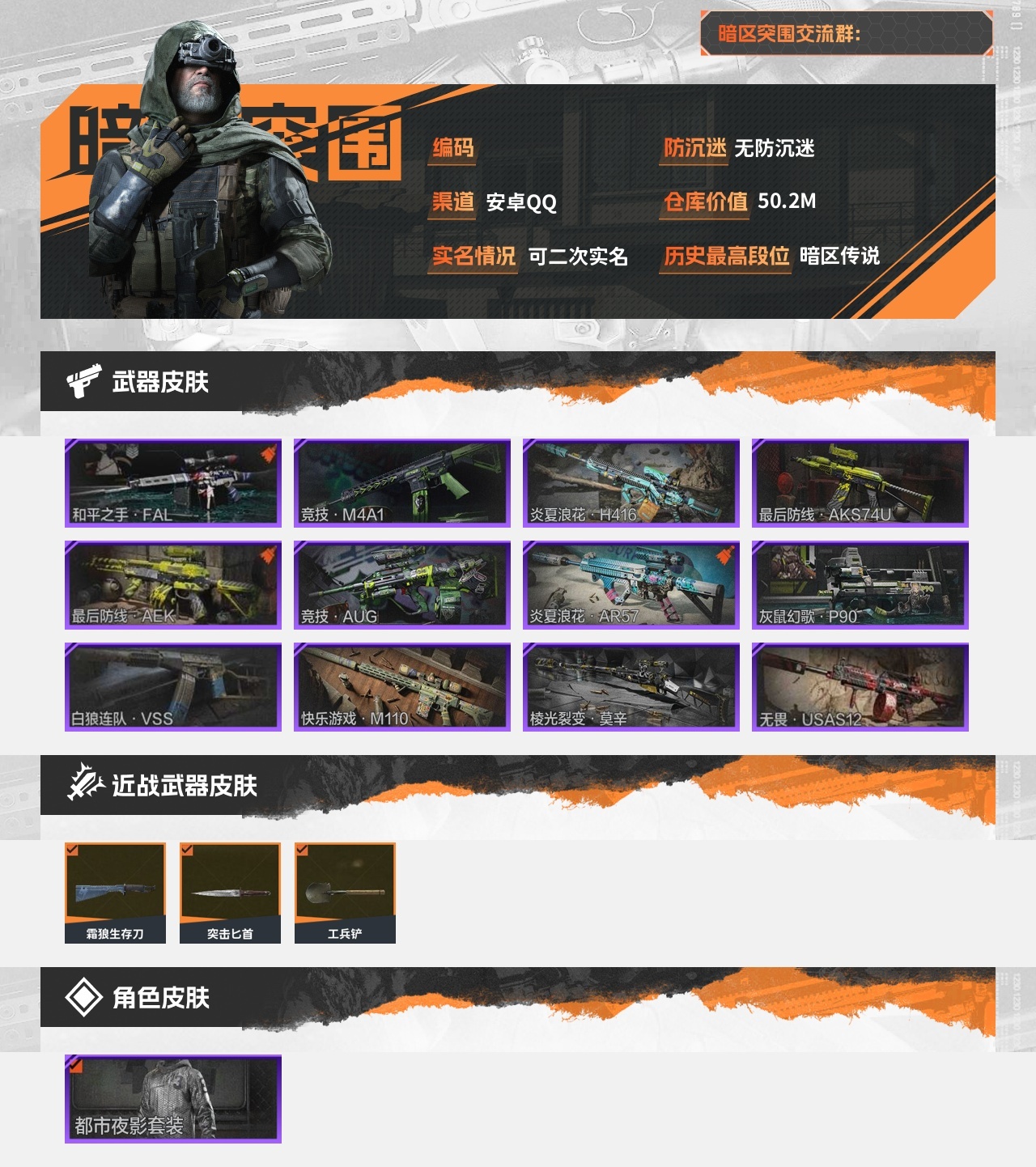 30级,刀皮3,紫枪皮12,历史最高段位:暗区传说,仓库价
