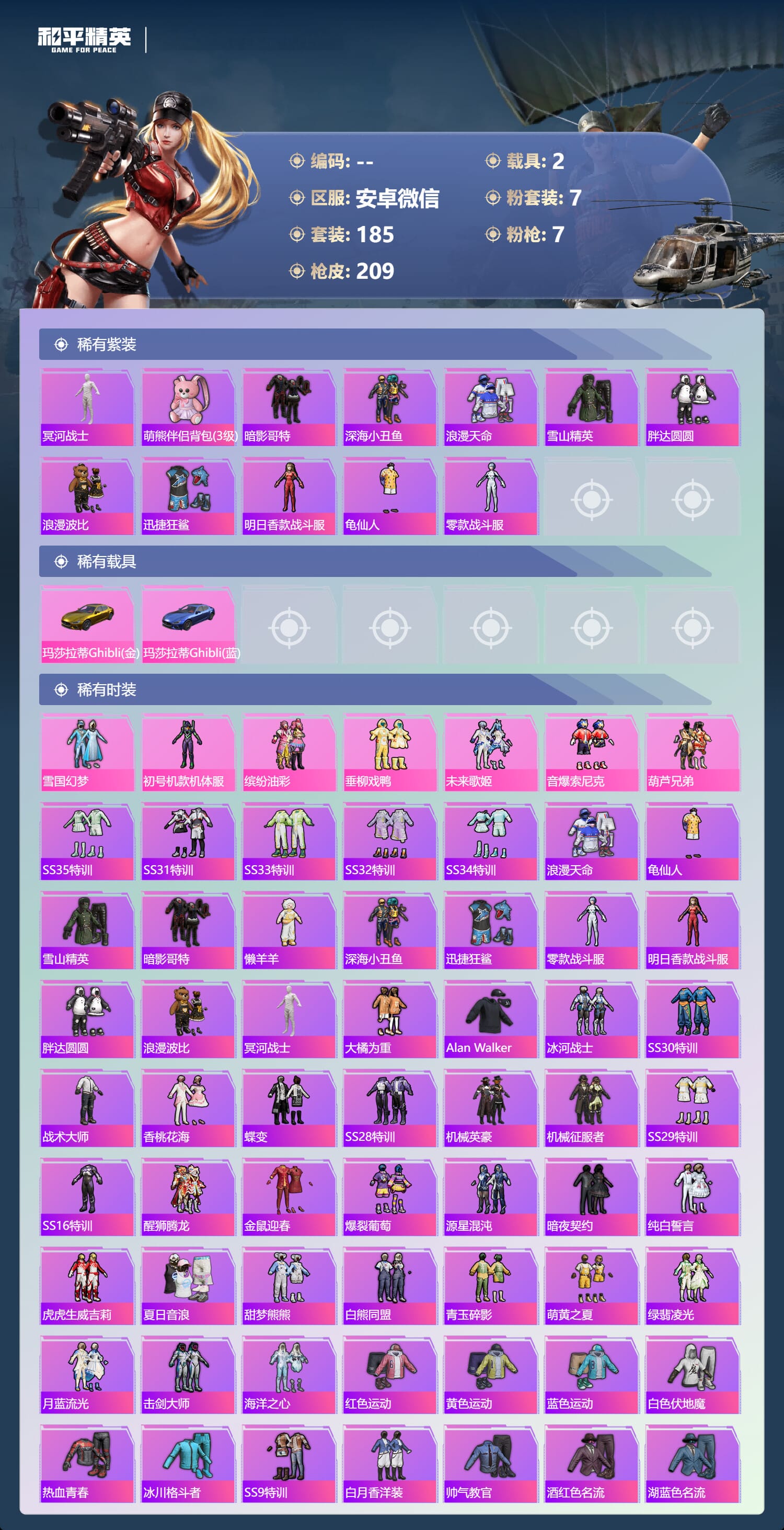 a4089/苹果微/-20王牌印记-7粉装-7特效枪-2载具-75152热力值-185套装-209