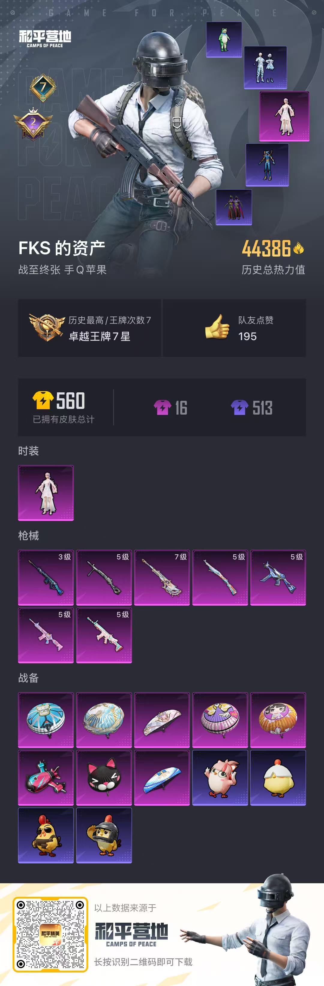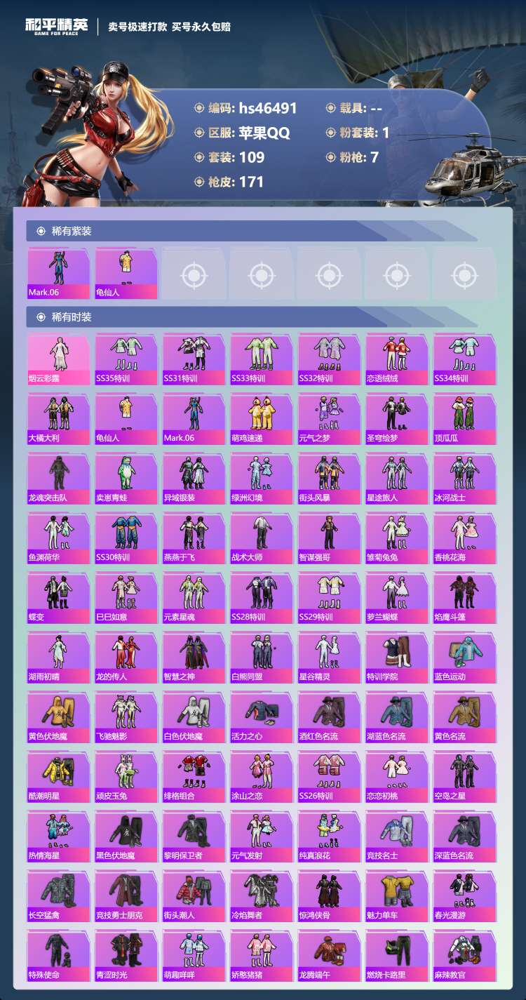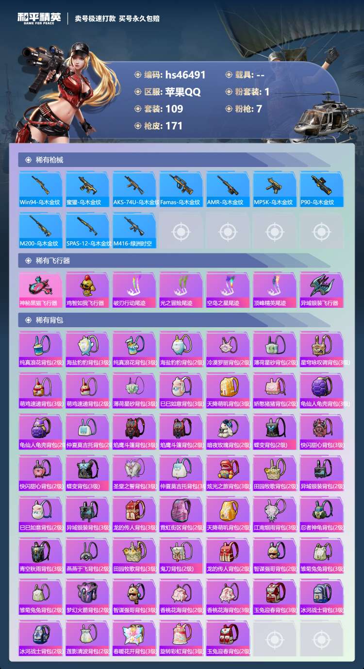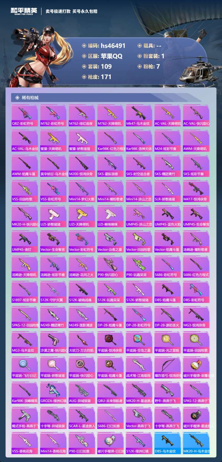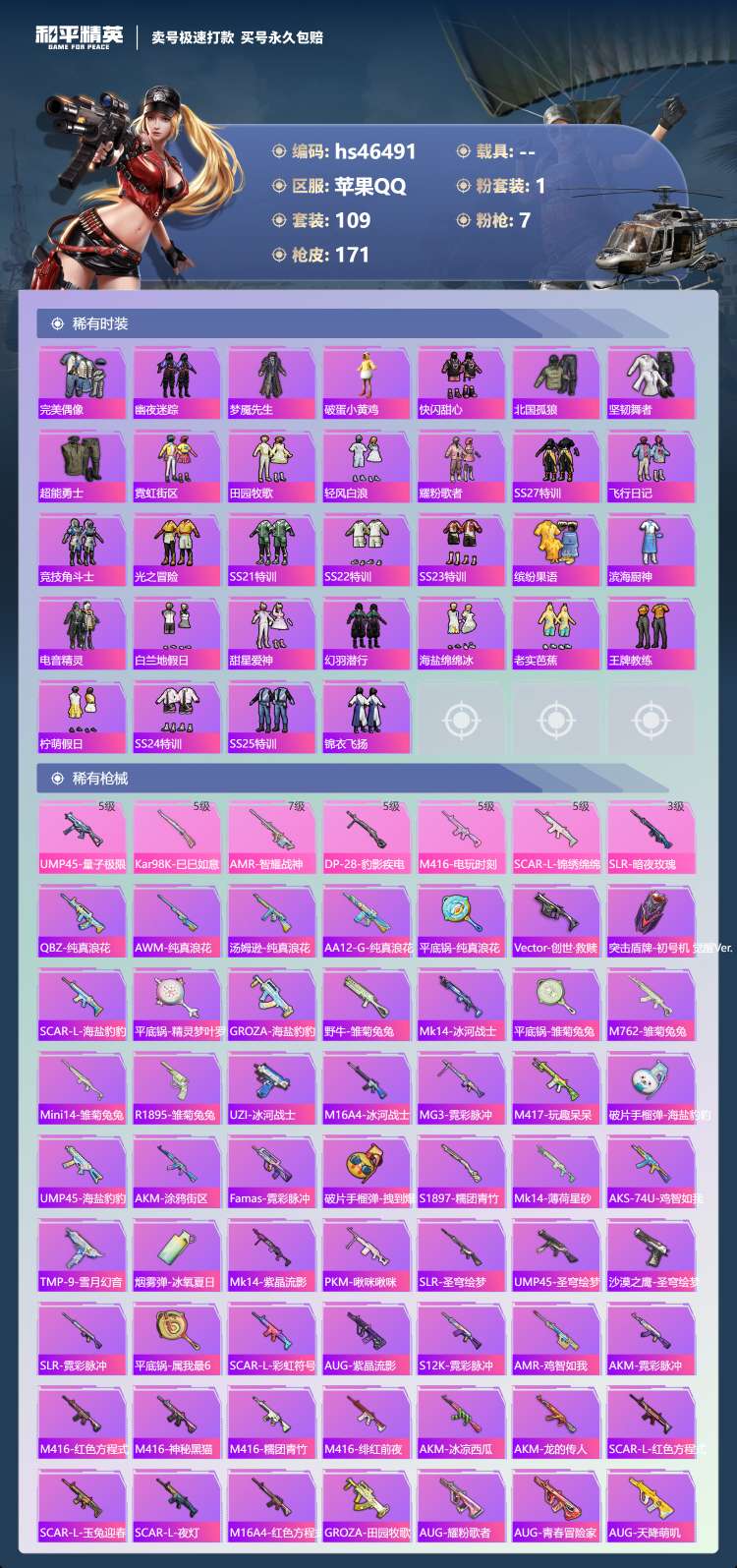 和平精英【苹果QQ】hs46491 苹果手Q-7王牌印记-1粉装-7特效枪-0载具-44646热力值-109套装-171