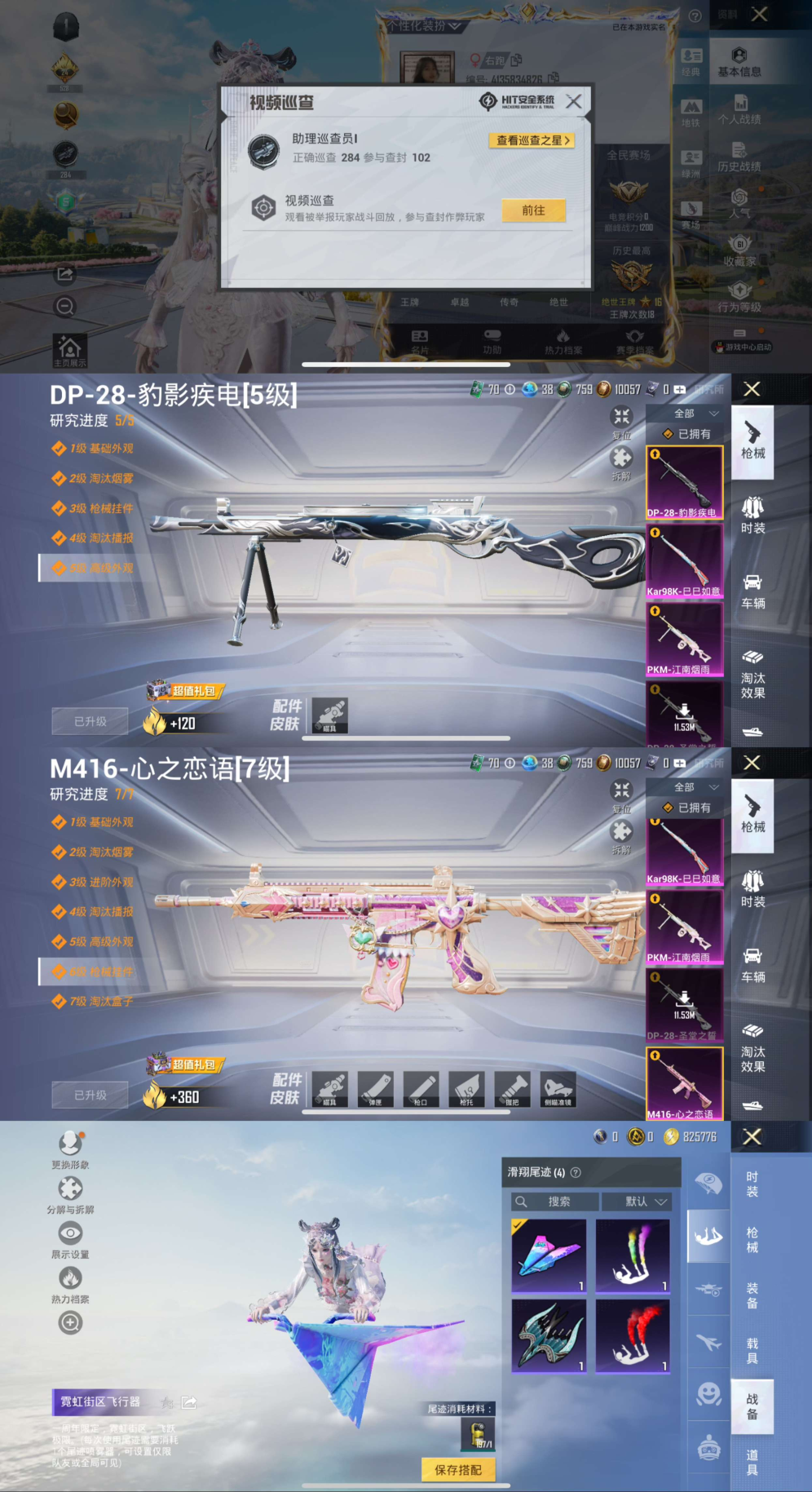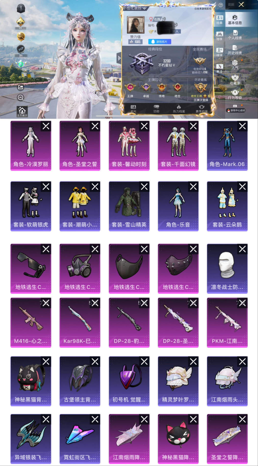 素材号 双字ID-右跑 可二次【18印记 助理巡查员 蓝螳螂 -3粉装-5特效枪-千面幻镜 圣堂之誓 馨动时刻 M416-心之恋语 Kar98K-巳巳如意 DP-28-圣堂之誓 PKM-江南烟雨】64904热力值-18王牌印记-164套装-210枪皮【优质套装】: 千面幻镜 圣堂之誓 馨动时刻【特效枪等级】:M416-心之恋语(七级- M416-心之恋语)Kar98K-巳巳如意