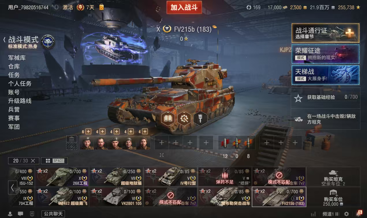z779坦克世界账号268工程183银2200万全局25万债券17000金币2500