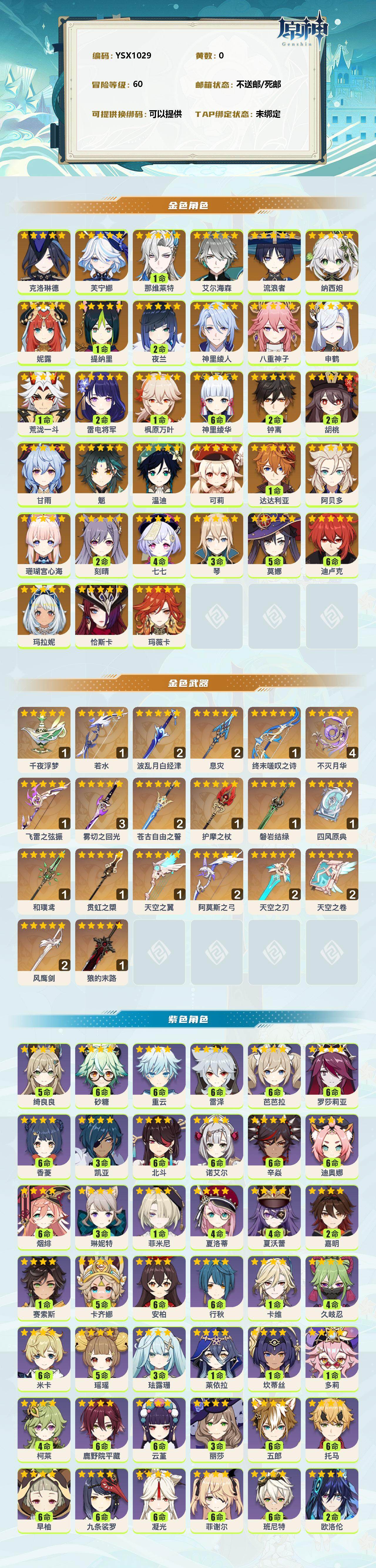 【YSX1029】60级/女主/36个五星角色/玛薇卡/恰斯卡/玛拉妮/克洛琳德/芙宁娜/1命那维莱特/艾尔海森/流浪者/纳西妲/妮露/1命提纳里/2命夜兰/神里绫人/八重神子/申鹤/1命荒泷一斗/珊瑚宫心海/2命雷电将军/满命神里绫华/1命枫原万叶/2命胡桃/魈/甘雨/阿贝多/2命钟离/1命达达利亚/可莉/温迪/3命琴/2命刻晴/满命迪卢克/5命莫娜/4命七七/千夜浮梦/若水/精2波乱月白经津/精2息灾/精4不灭月华/精3雾切之回光/飞雷之弦振/精2苍古自由之誓/终末嗟叹之诗/护摩之杖/磐岩结