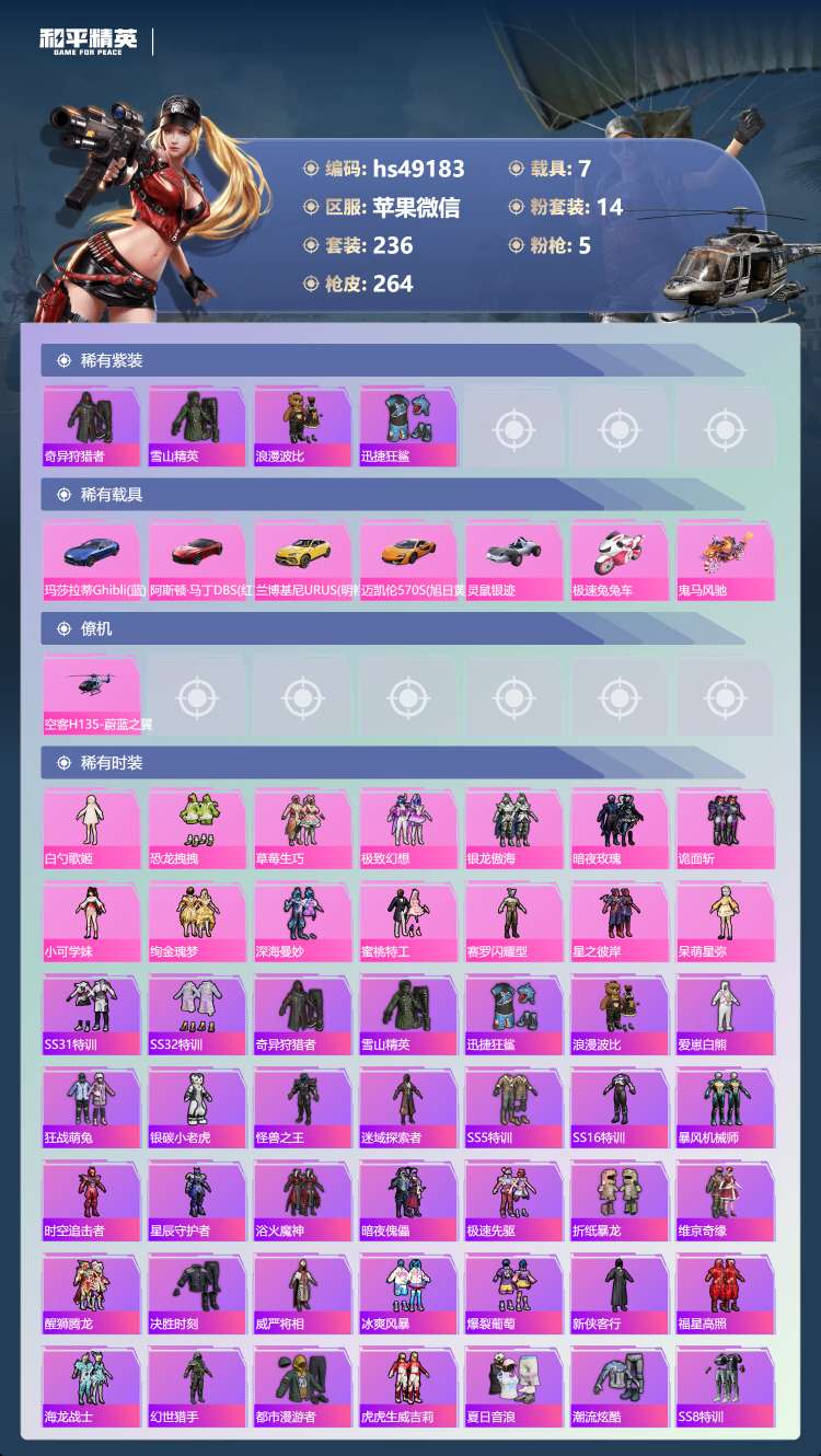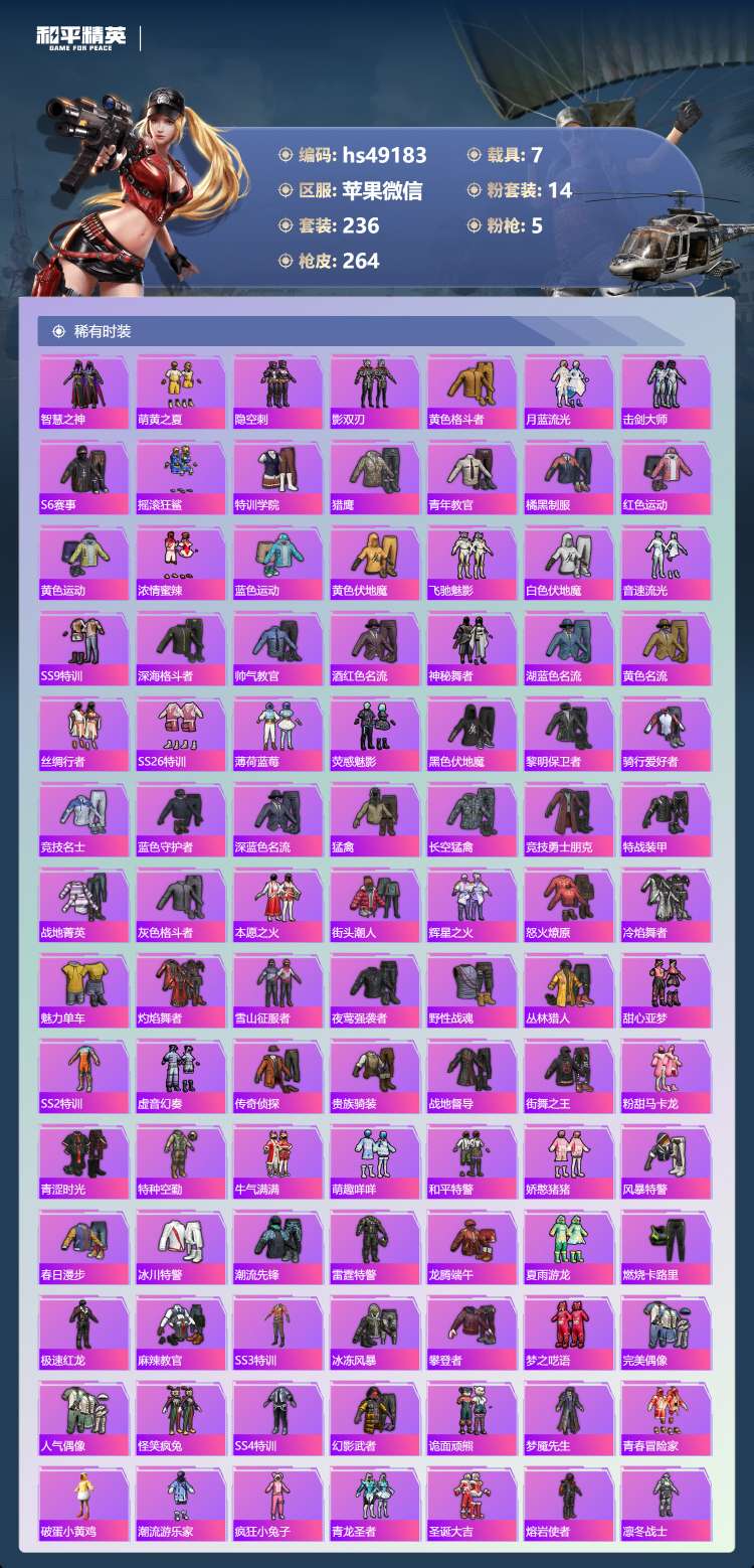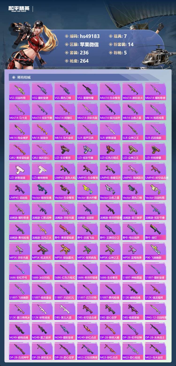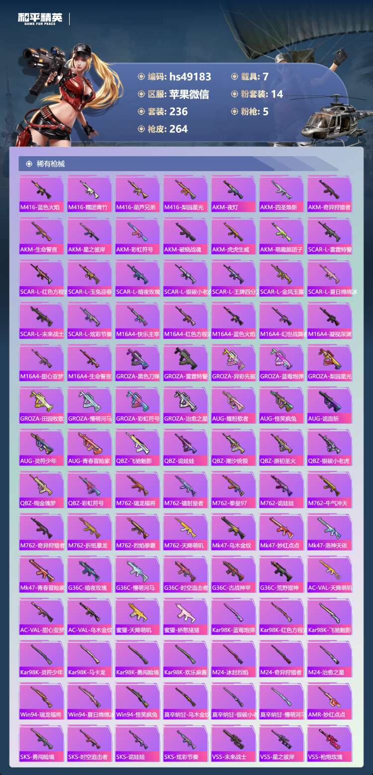 hs49183 苹果微-14王牌印记-14粉装-5特效枪-7载具-99953热力值-236套装-2