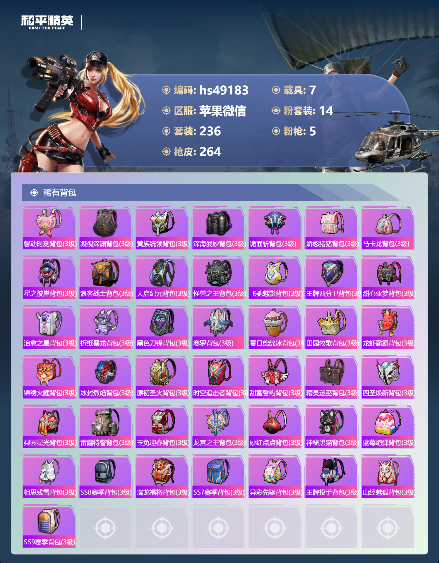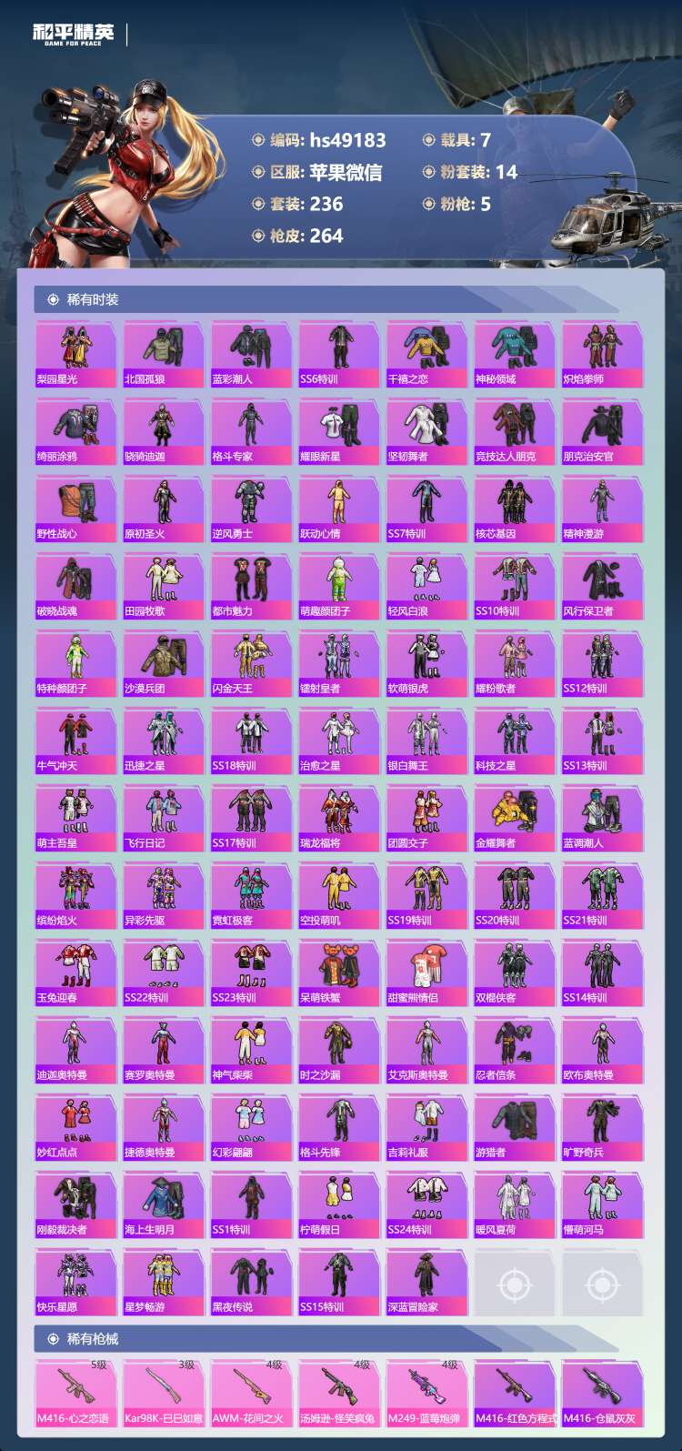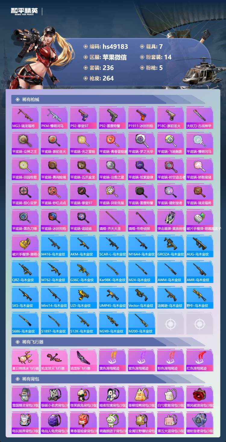hs49183 苹果微-14王牌印记-14粉装-5特效枪-7载具-99953热力值-236套装-2