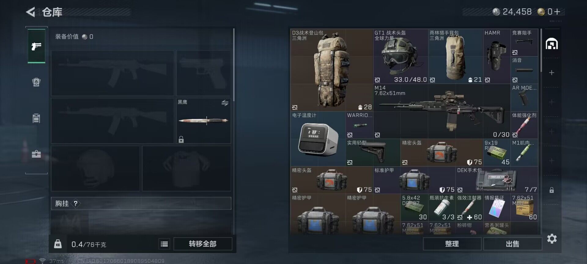 总资产(M):7M/哈夫币(K):24K/全面战场等级:36_段位:上等兵/烽火地带等级:60_段位:黄金/
