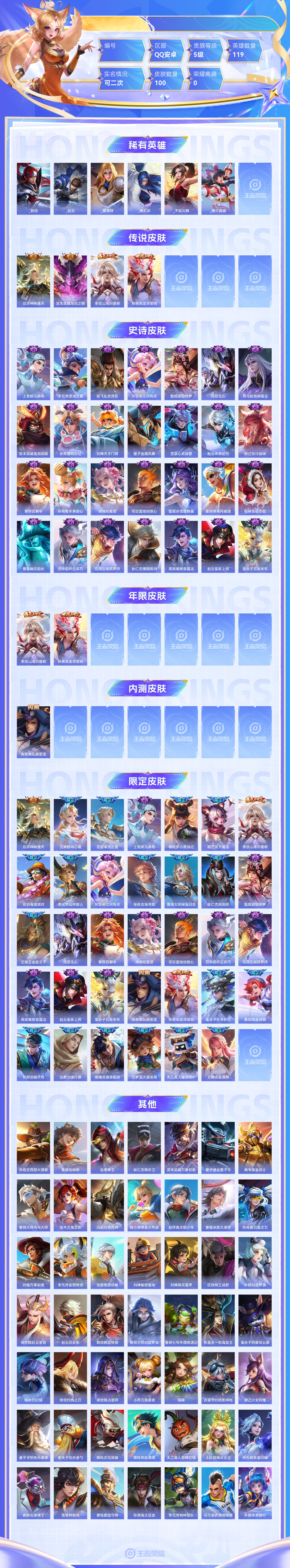 王者荣耀【安卓QQ】传说4 史诗28 限定34 英雄119 皮肤100