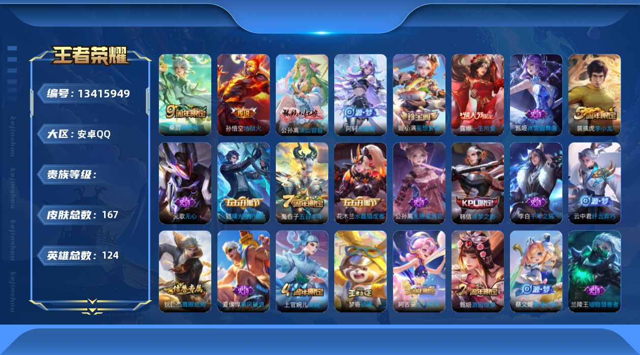 王者荣耀【安卓QQ】【13415949】[13415949]实名: 不可修改 英雄数: 124 皮