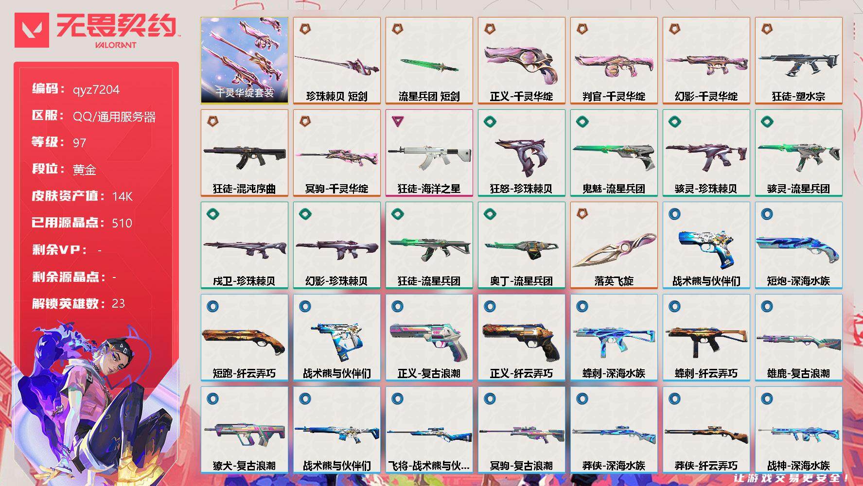 莲花套+混沌ak+塑水女号妹子号精品捡漏 qyz7204 套装: 千灵华绽套装 近战武器皮肤: 短剑-珍珠棘贝,落英飞旋,短剑-流星兵团 步枪皮肤: 狂徒-塑水宗,幻影-千灵华绽,狂徒-海洋之星,狂徒-混沌序曲 佩枪皮肤: 正义-千灵华绽 狙击枪皮肤: 冥驹-千灵华绽 霰弹枪皮肤: 判官-千灵华绽 亮点: 【qyz7204】【套装】:千灵华绽套装【英雄】:炼狱,暮蝶,壹决,铁臂,捷风,雷兹,幽影,不死鸟,贤者,猎枭,蝰蛇,零,芮娜,奇乐,尚勃勒,霓虹,斯凯,K/O,海神,盖可,黑梦,钢锁【近战