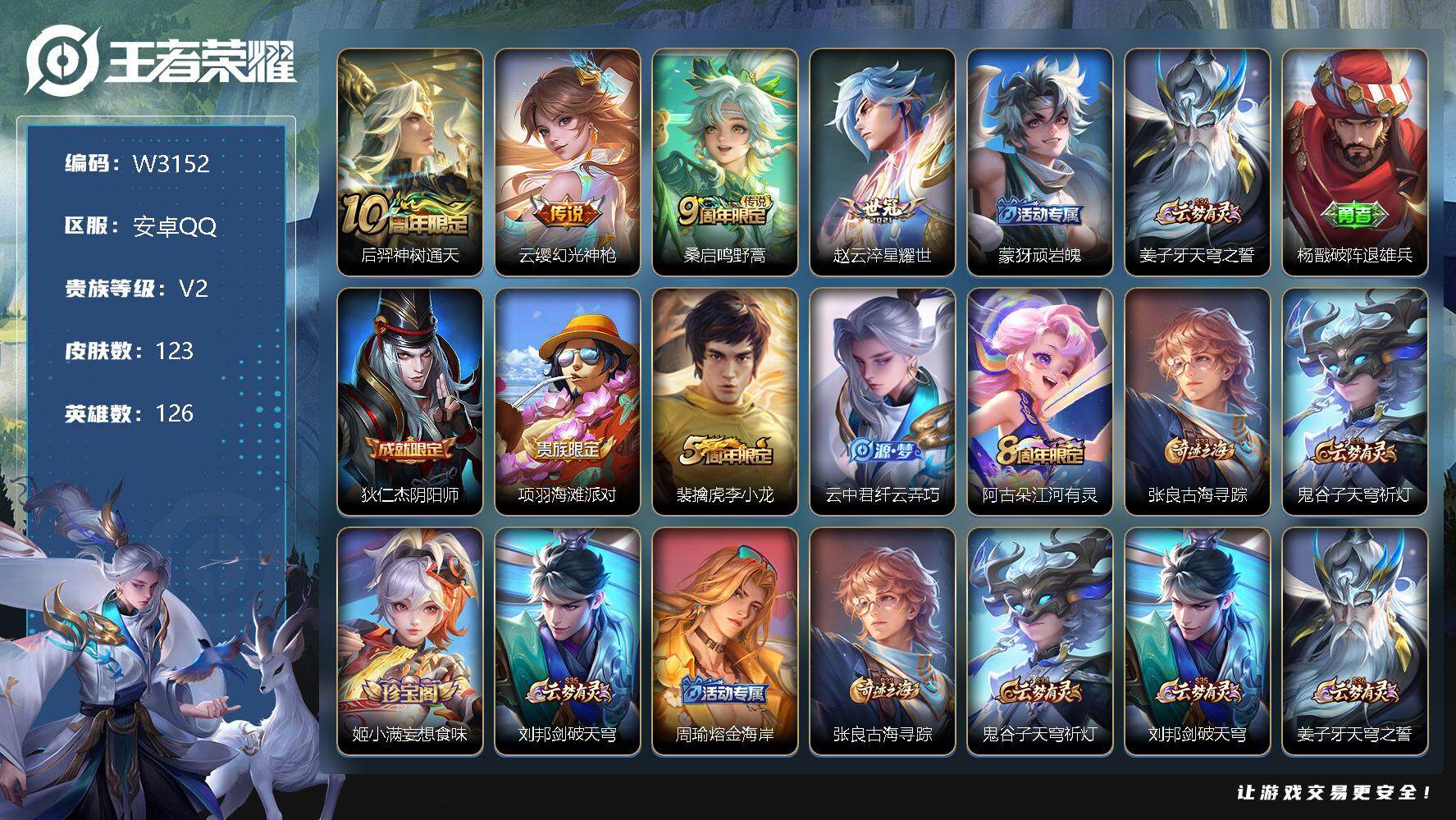 王者荣耀【安卓QQ】【W3152】安卓QQ-有二次-贵4-126英雄-123皮肤-4传说-33限定