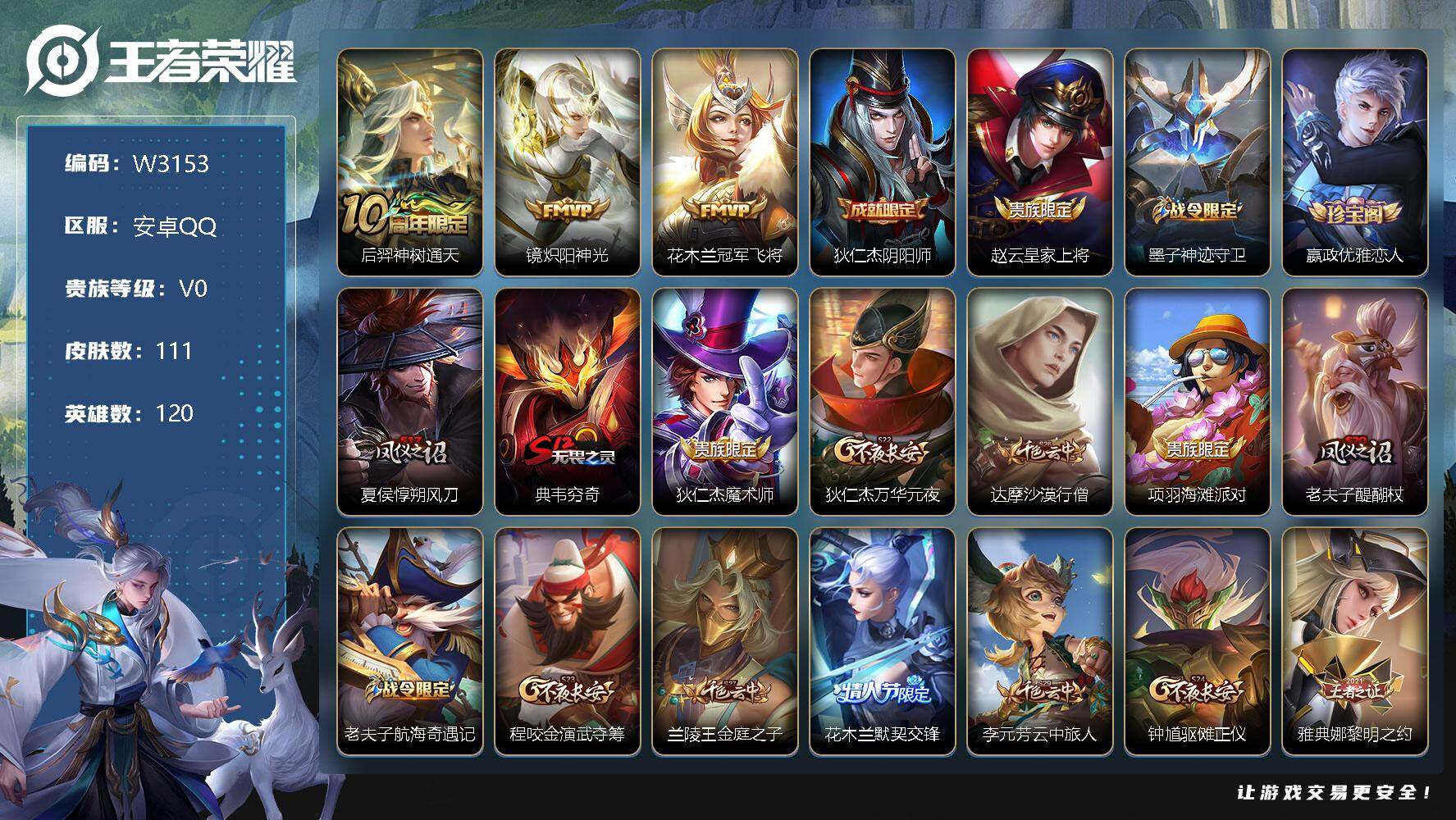 王者荣耀【安卓QQ】【W3153】安卓QQ-有二次-贵6-120英雄-111皮肤-3传说-43限定