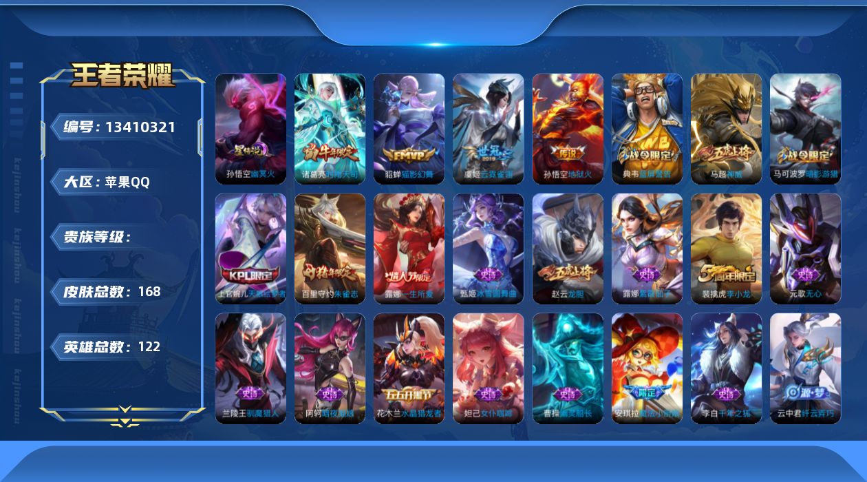 王者荣耀【苹果QQ】【13410321】[13410321]实名: 可修改 英雄数: 122 皮肤