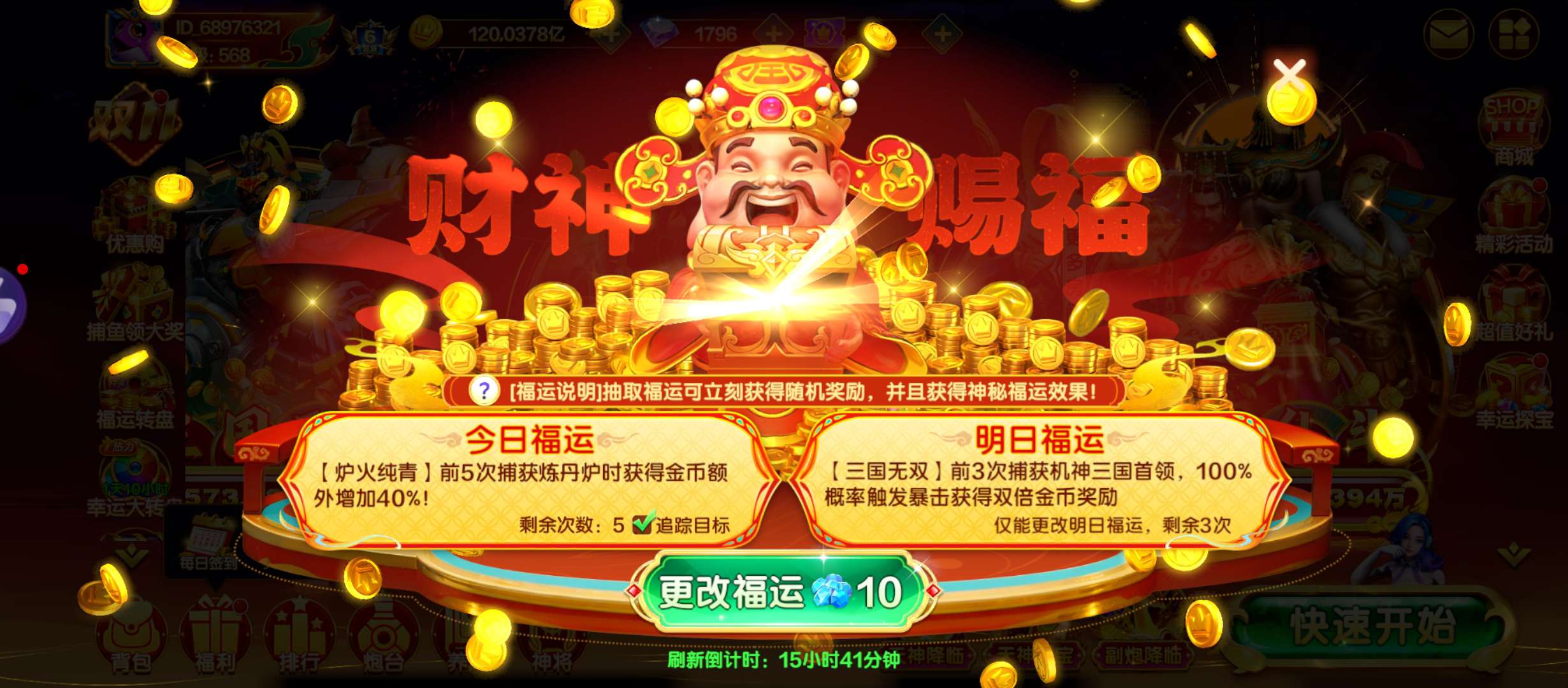 捕鱼大咖【安卓联想】捕鱼大咖联想版,100万亿正常号,4亿实炮,限时副炮,限时天神三级光。今天5次炼丹炉,明天三国。
