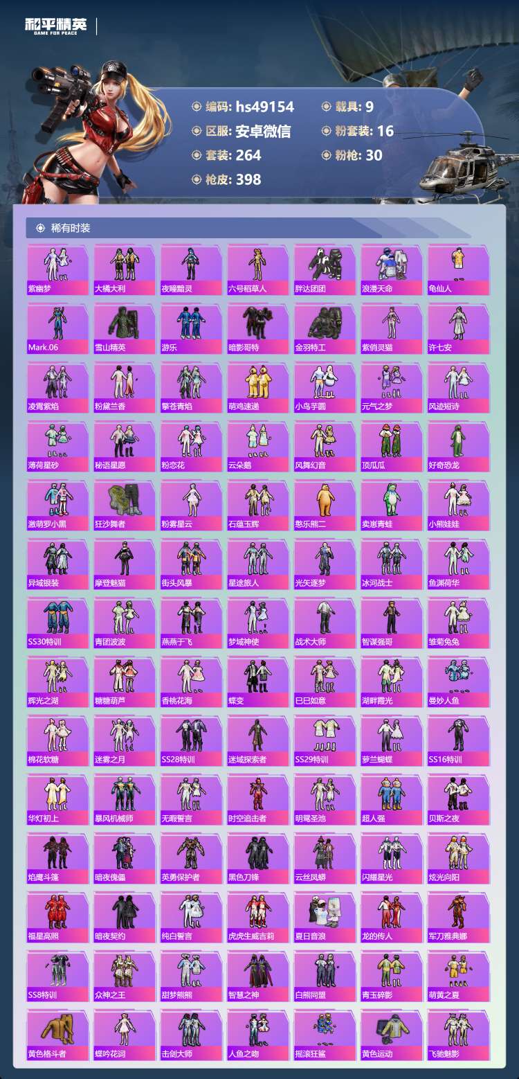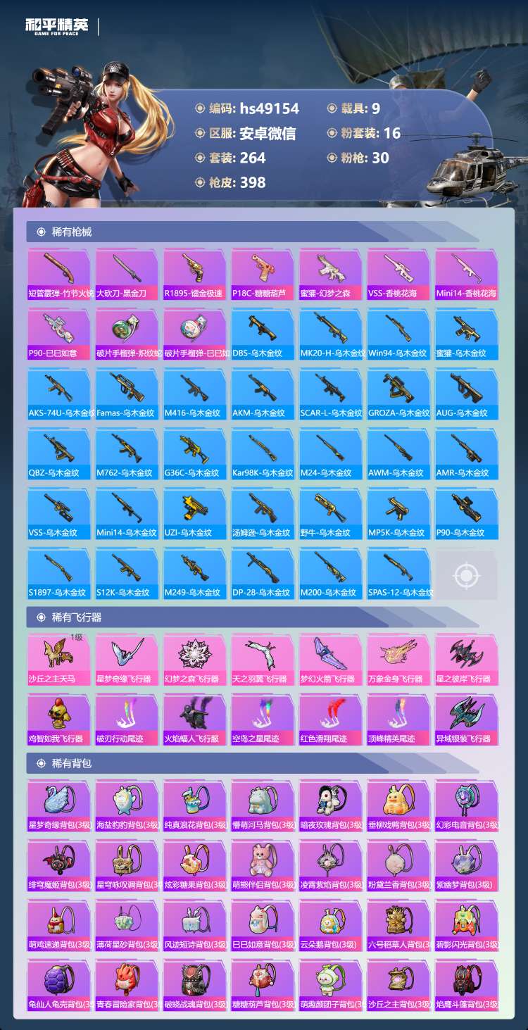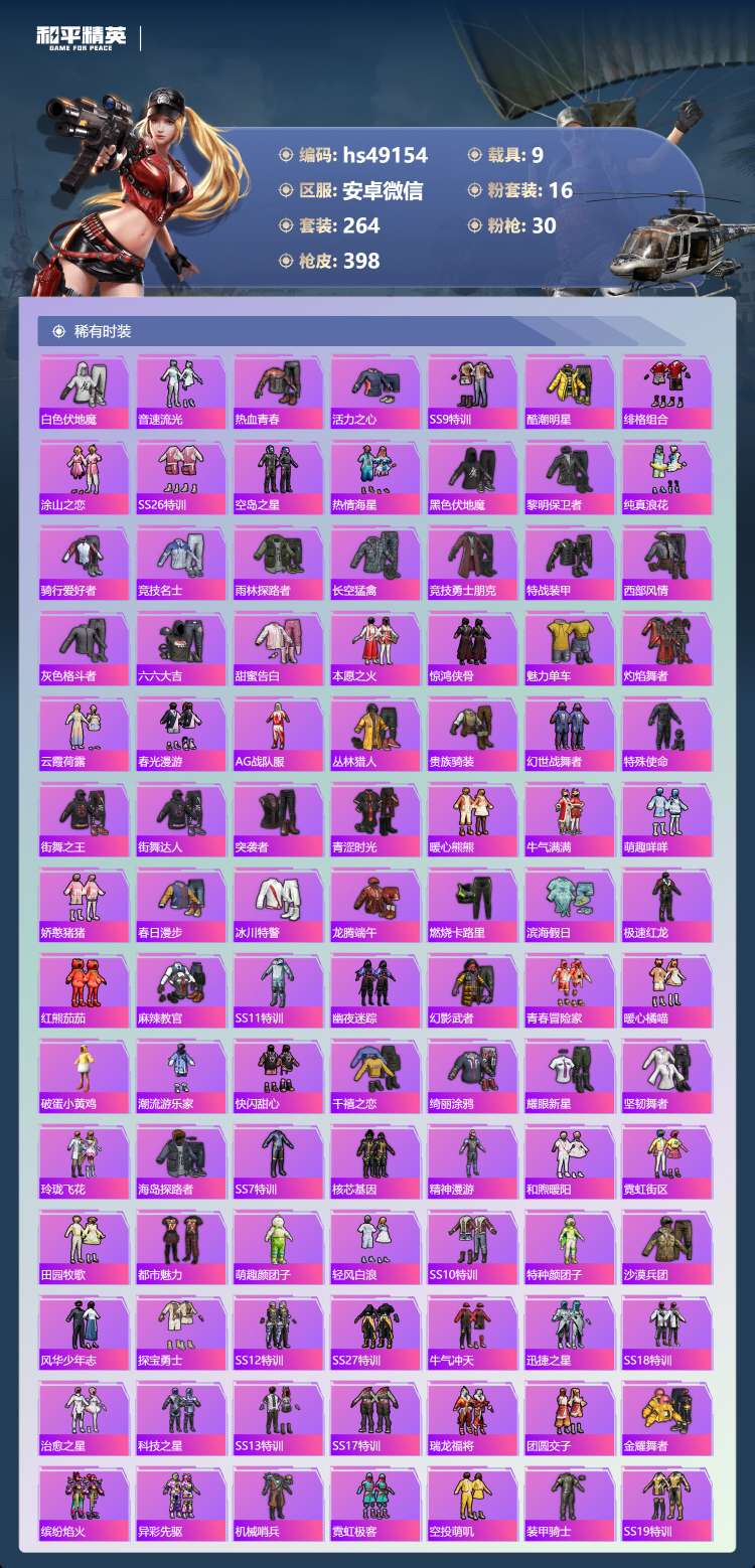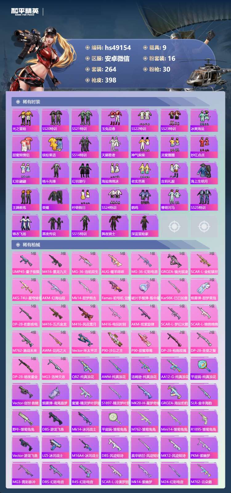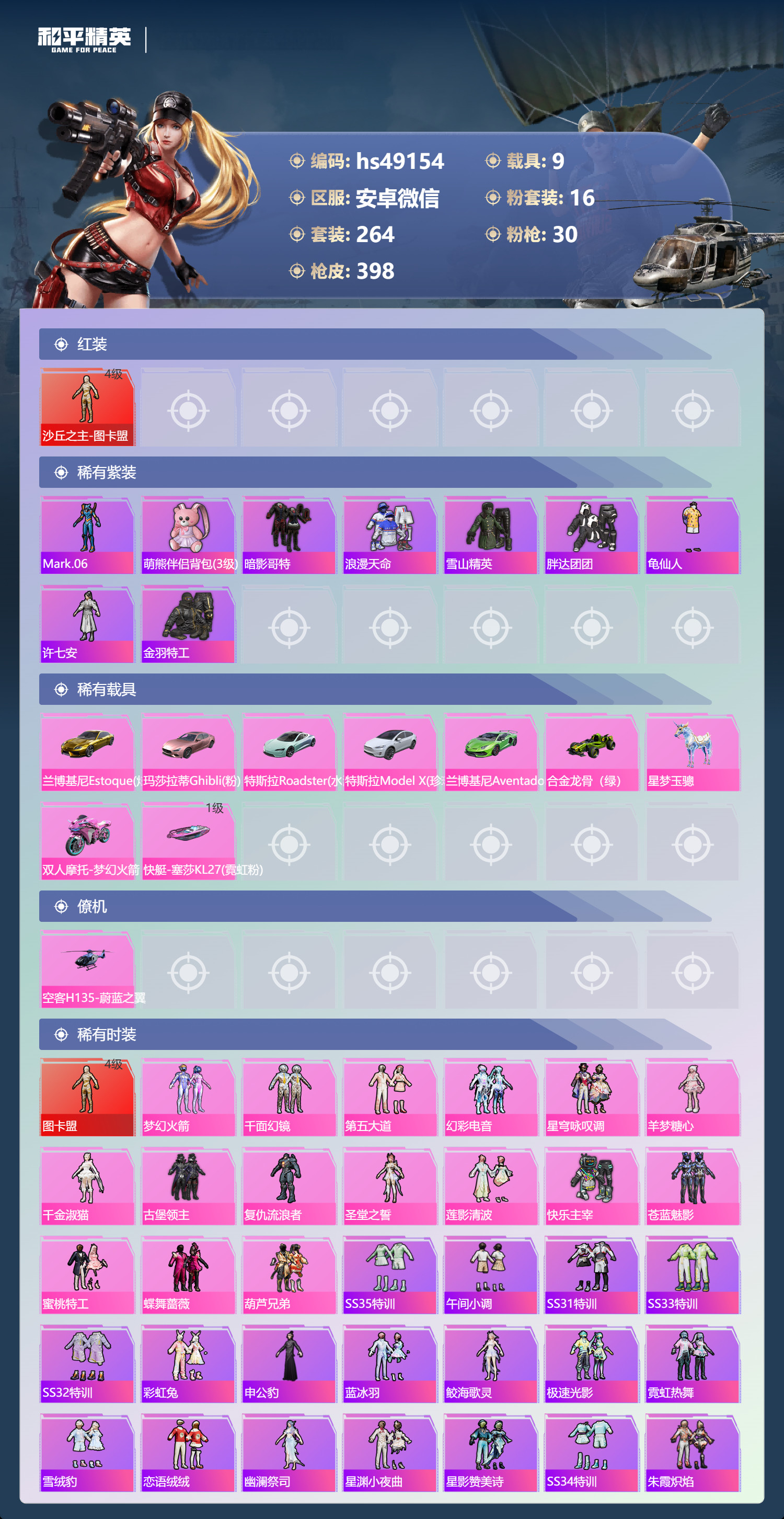 和平精英【安卓QQ】hs49154【1红装】沙丘之主-图卡盟/4级【16粉装】角色-复仇流浪者,套装-幻彩电音,套装-快