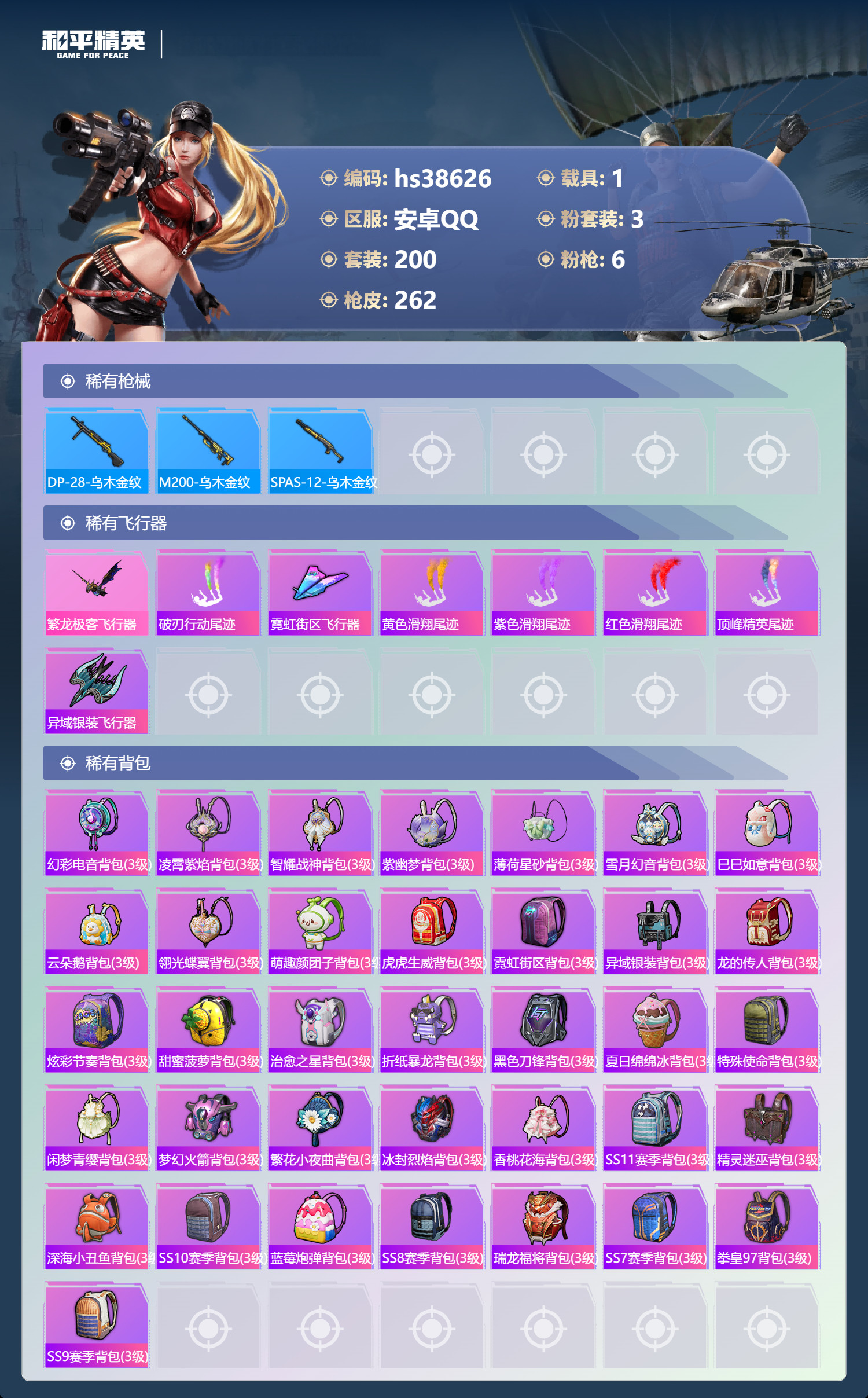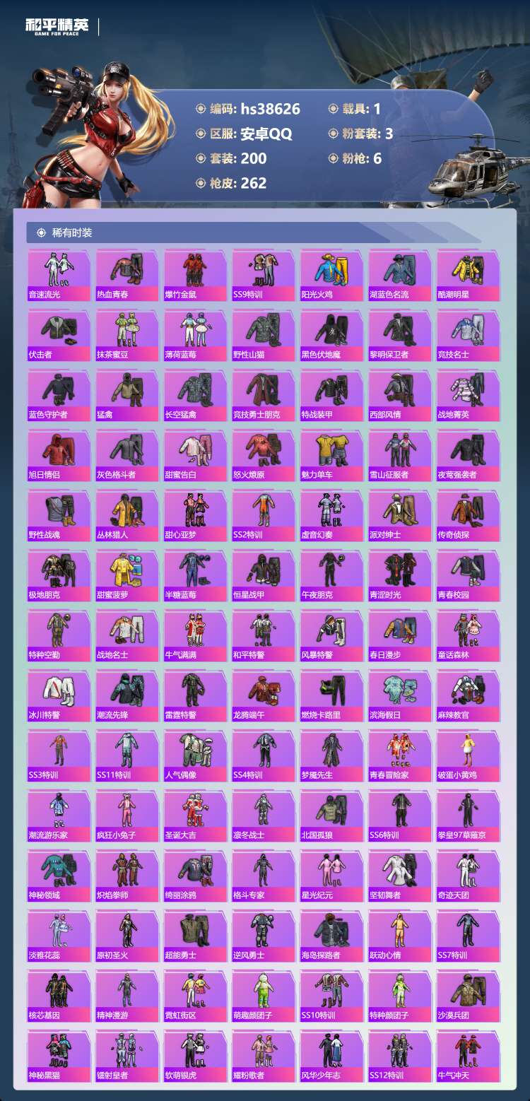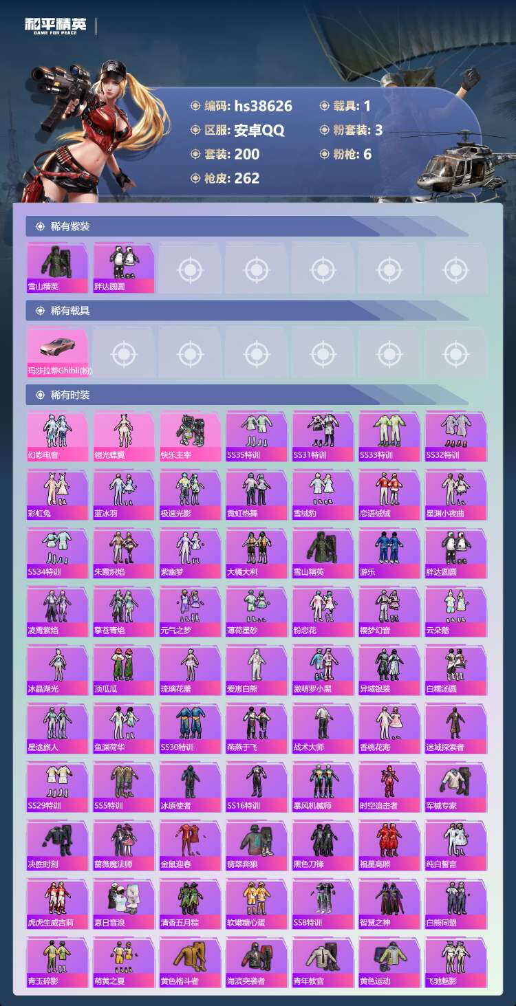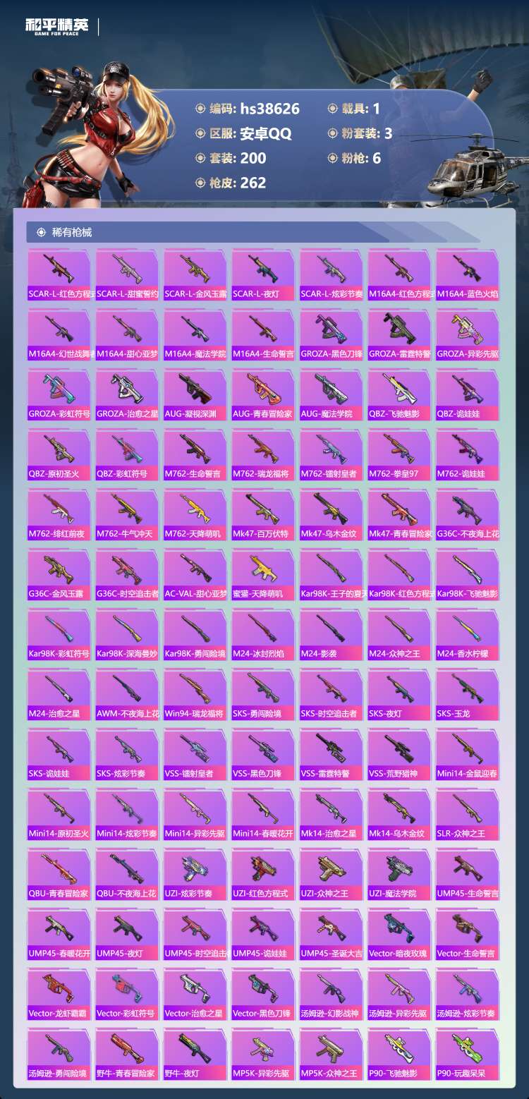 hs38626 安卓手Q-11王牌印记-3粉装-6特效枪-1载具-81129热力值-200套装-26