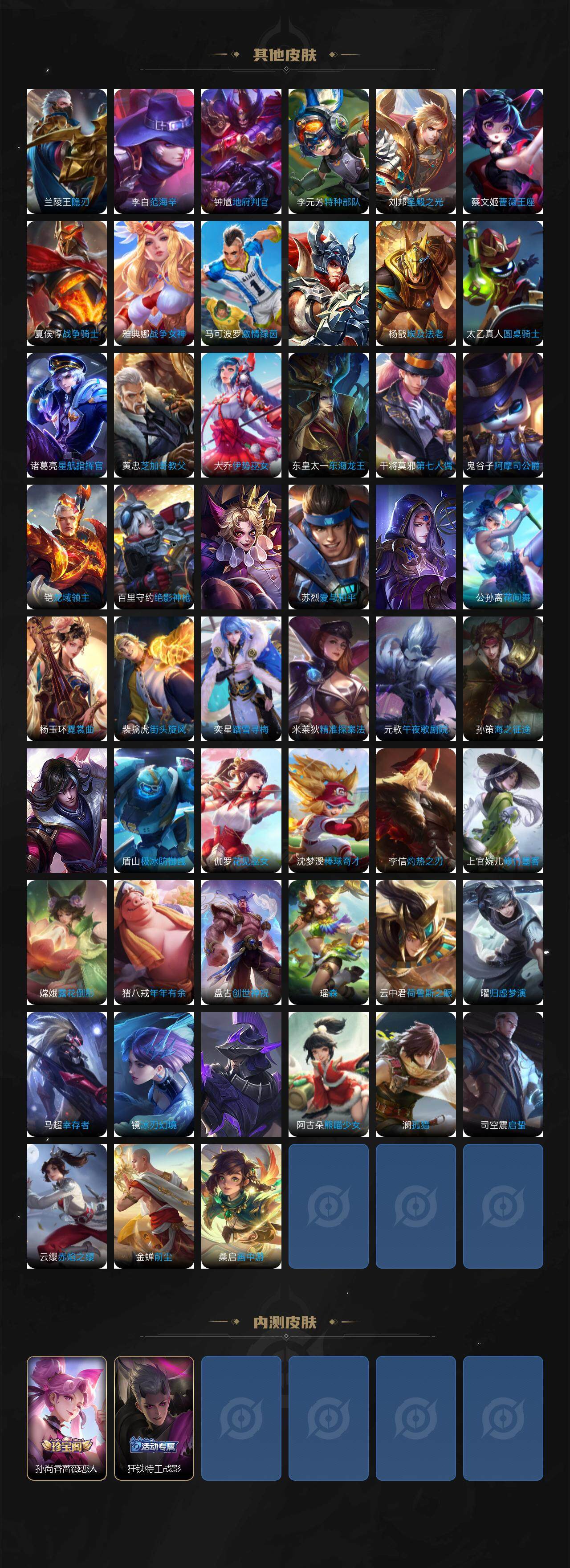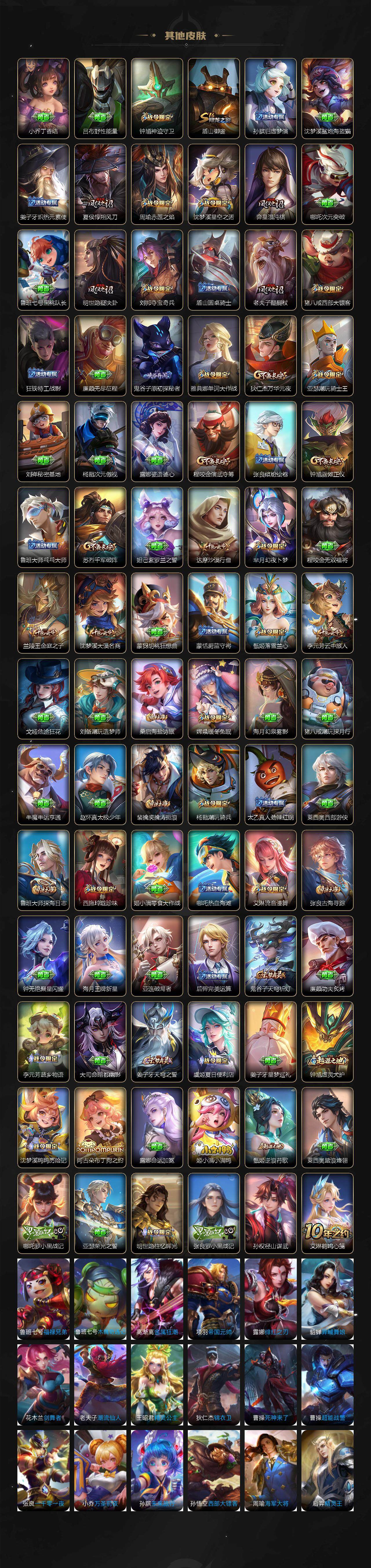 【传说皮肤】:杨戬纵目迁山,后羿神树通天,曹操万灵伏威,孙尚香乘龙问璇玑,马超无双飞将,王昭君乞巧织情,镜炽阳神光,虞姬启明星使,孙悟