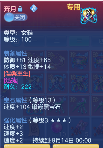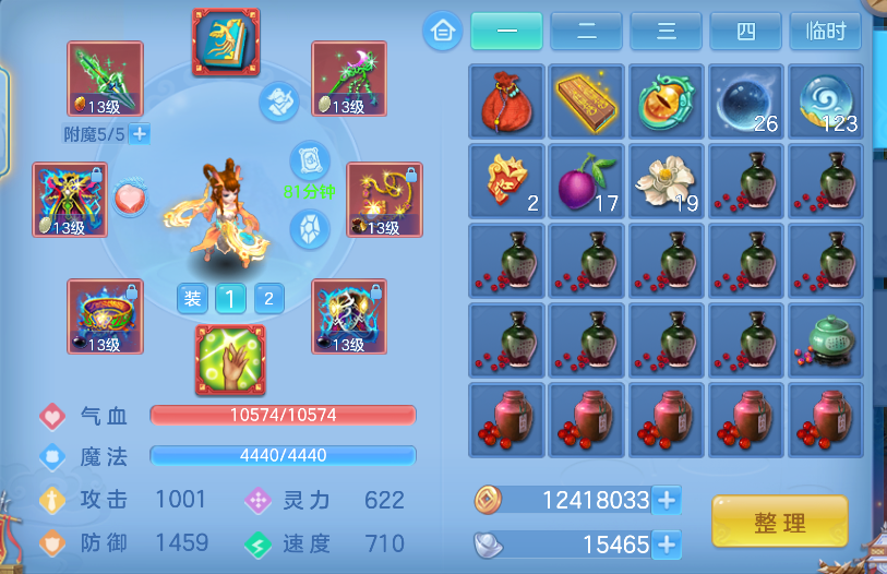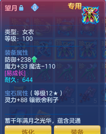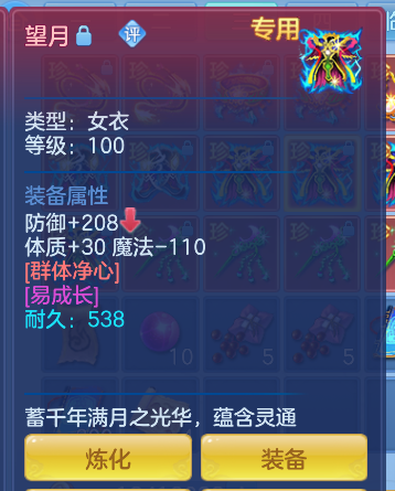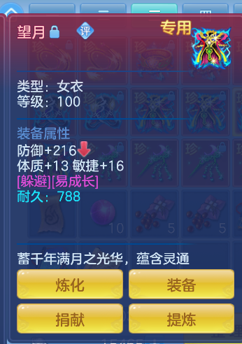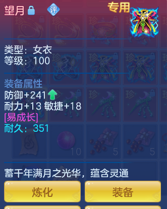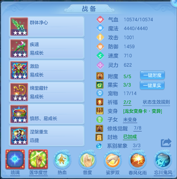 今年勇109女普陀,2仙兽2强化,13段,可转法封,激励易成长衣服,愤怒易成长腰带,疾速易成长帽子,笑里易成长项链。2只内丹强化神,迅捷慈航鞋子,26只满兽魂宝宝,14个专属天赋,庄园,2980邮箱,无双重