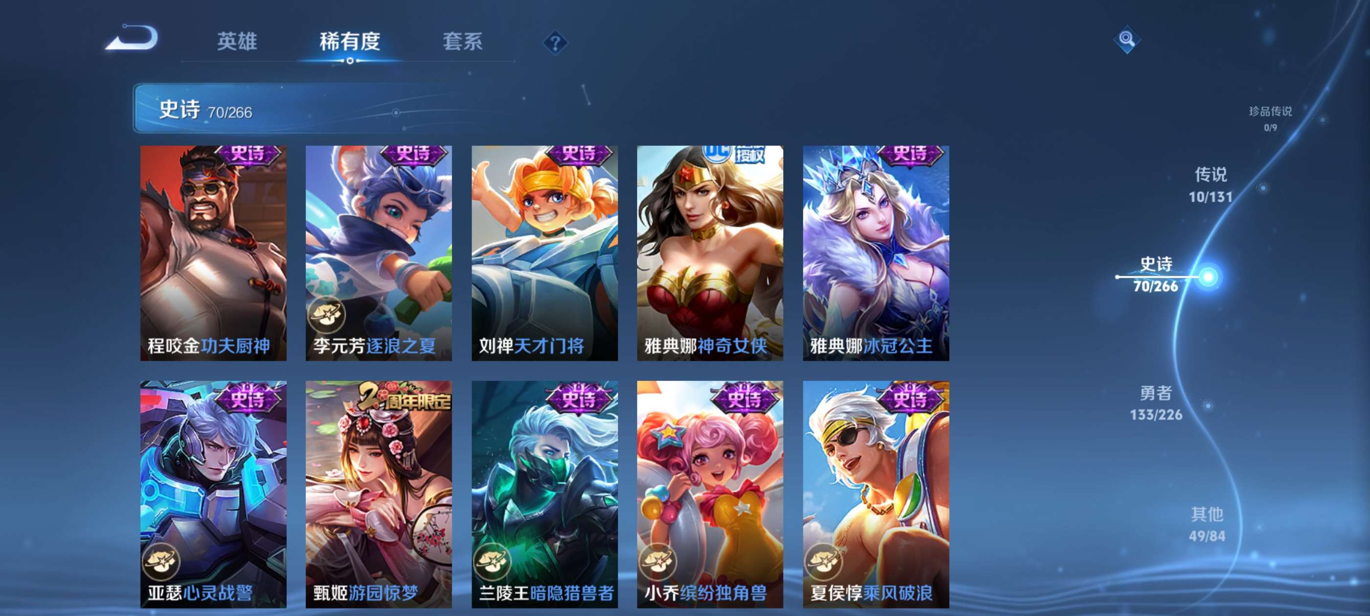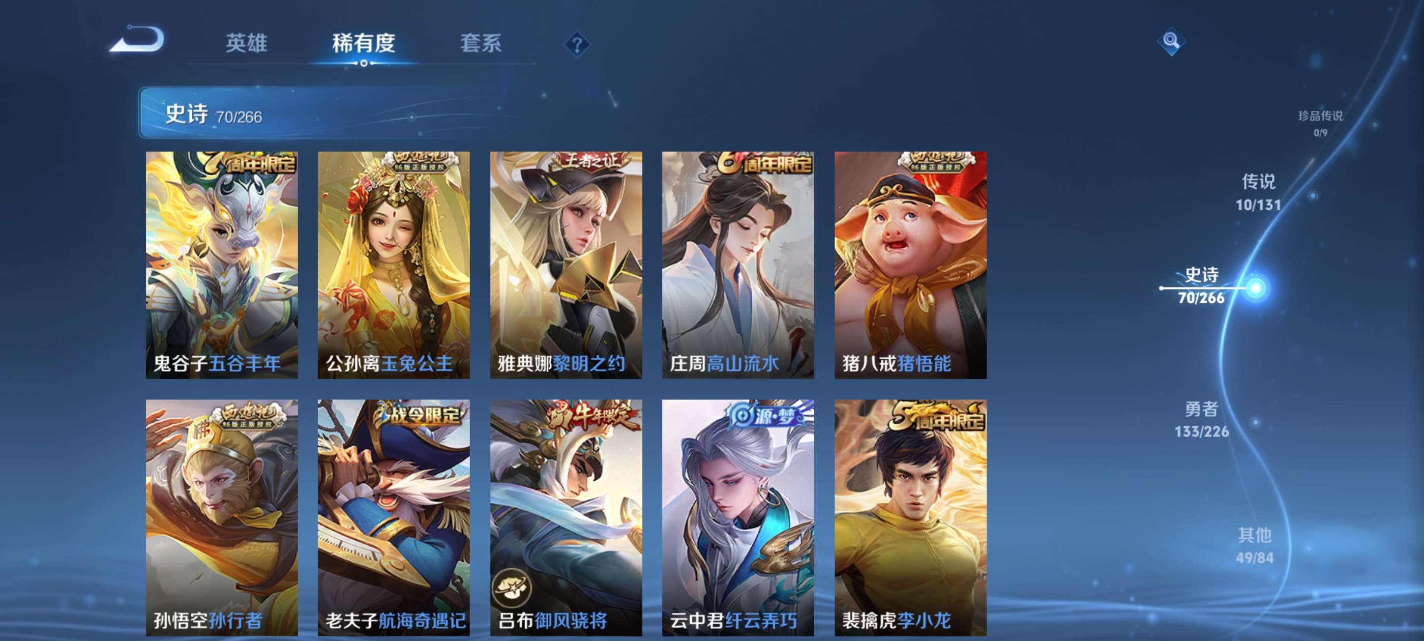 一典藏,10传说,70史诗,雅典娜全皮,猪八戒全皮,吕布差一个限定和一个6元