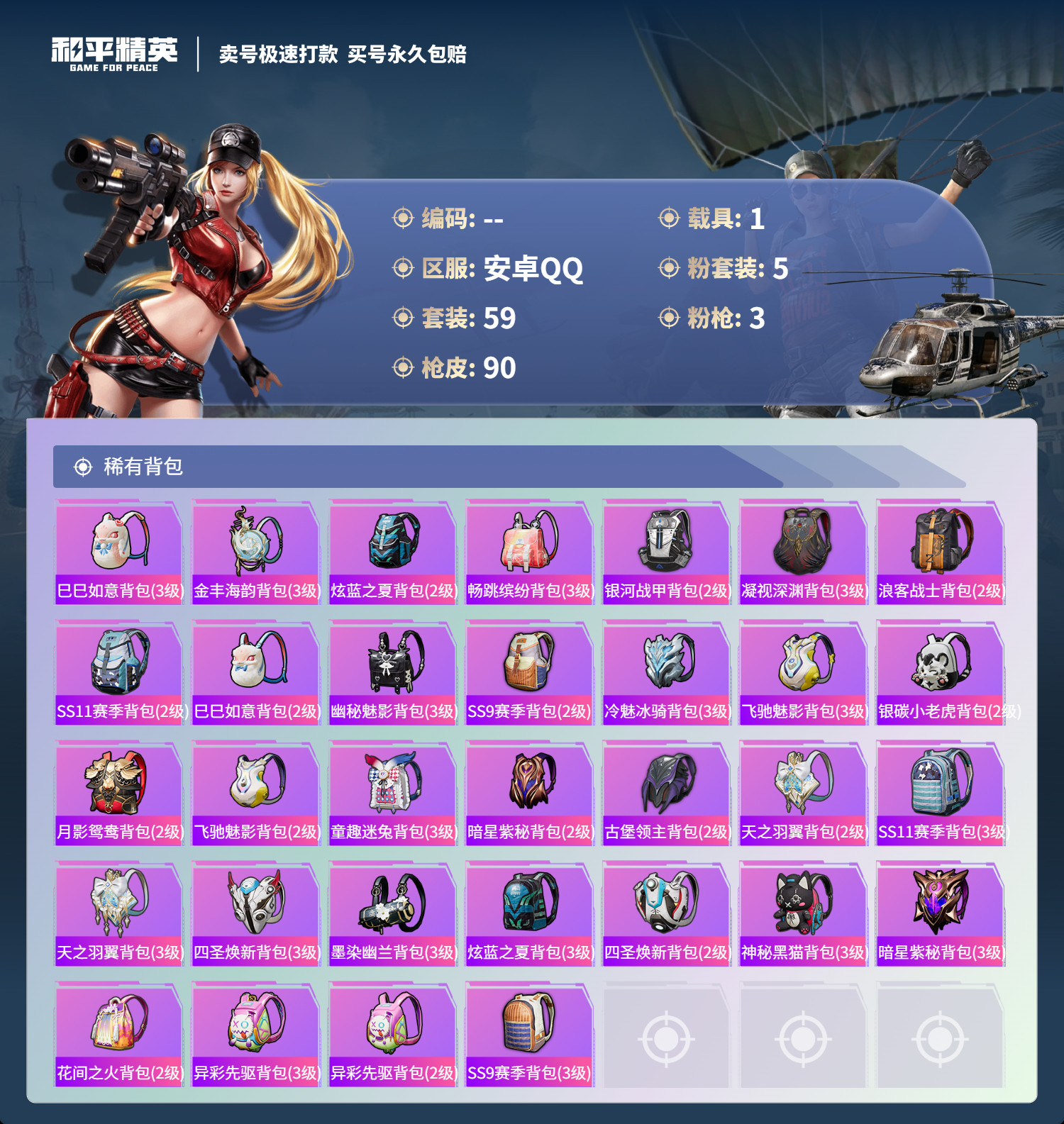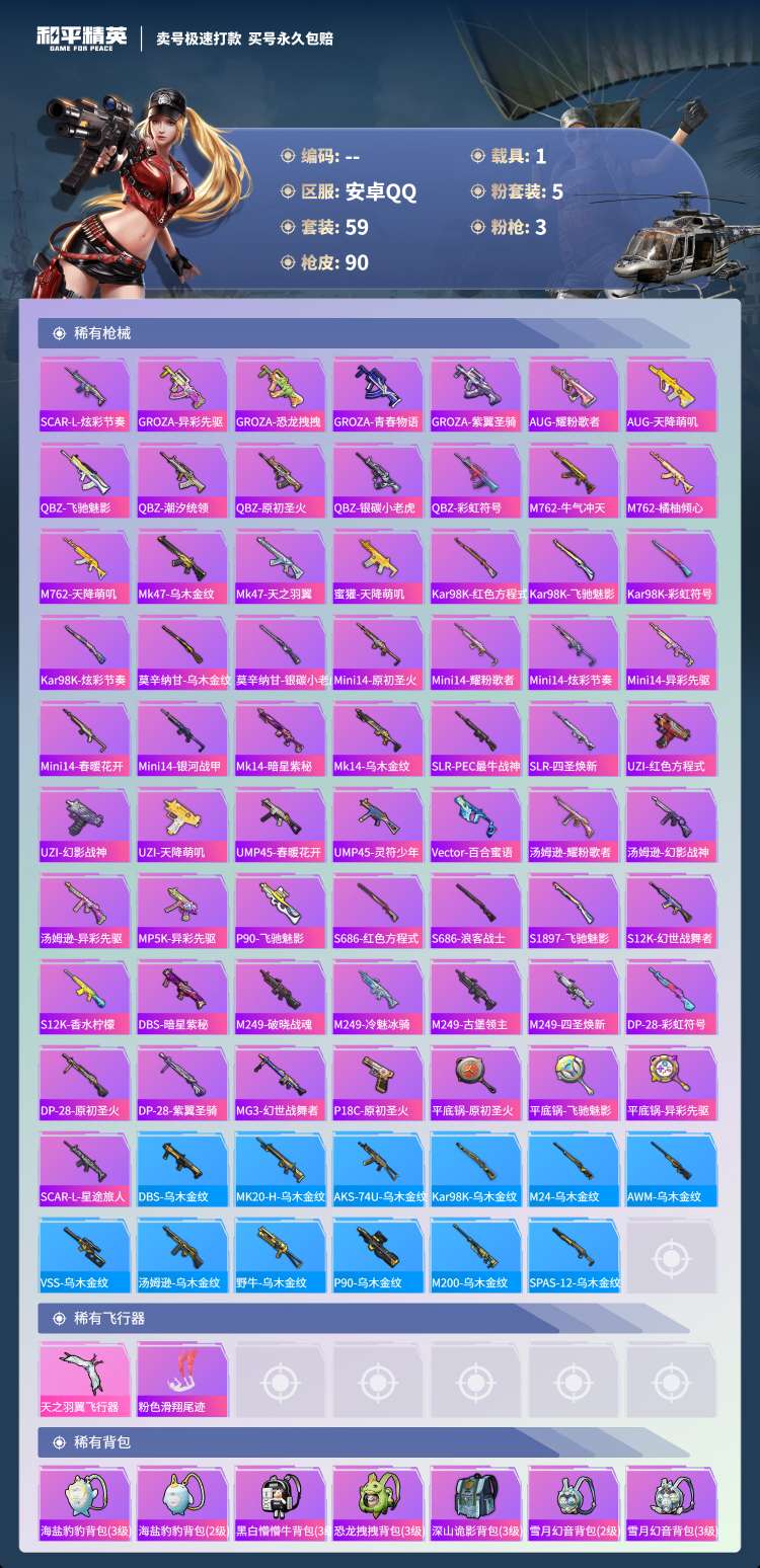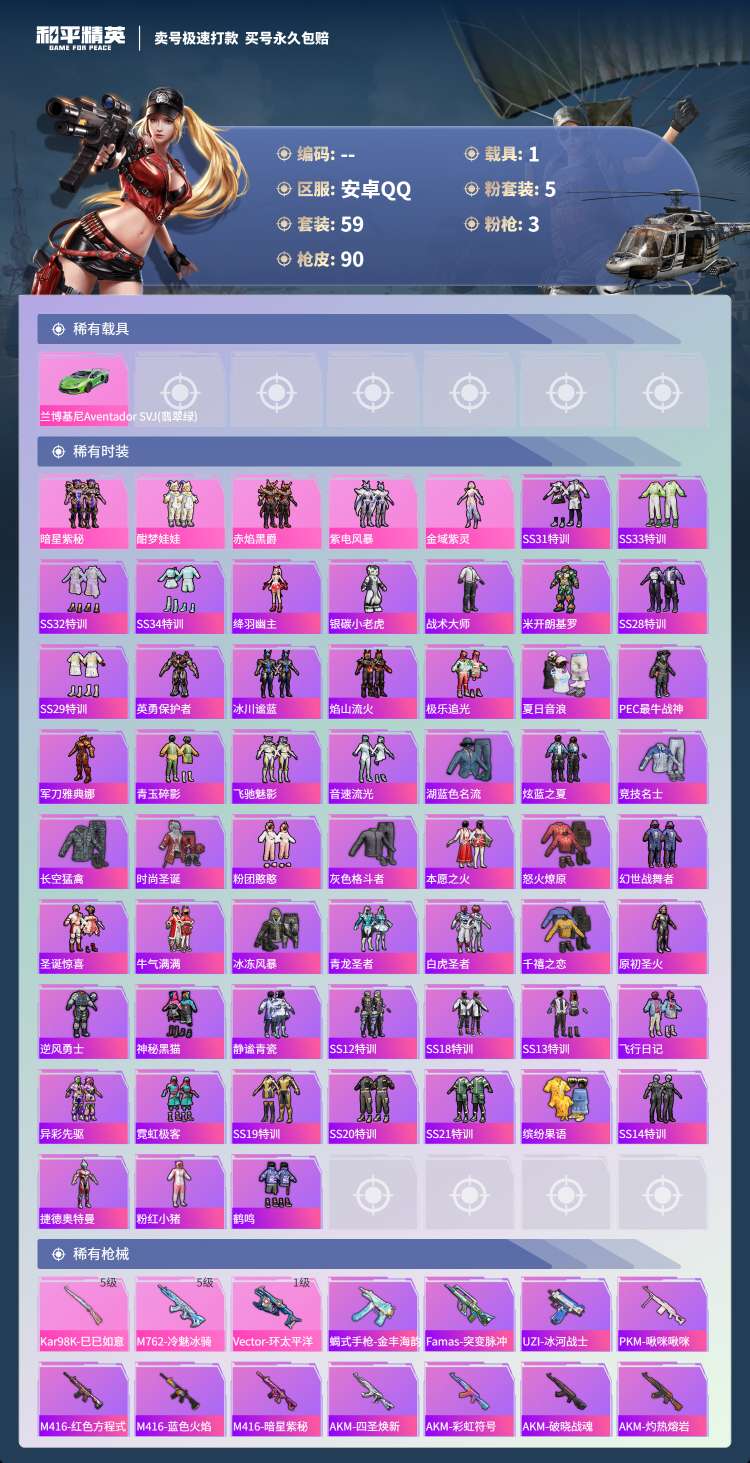 hs47177 安卓手Q-0王牌印记-5粉装-3特效枪-1载具-30209热力值-59套装-90枪皮