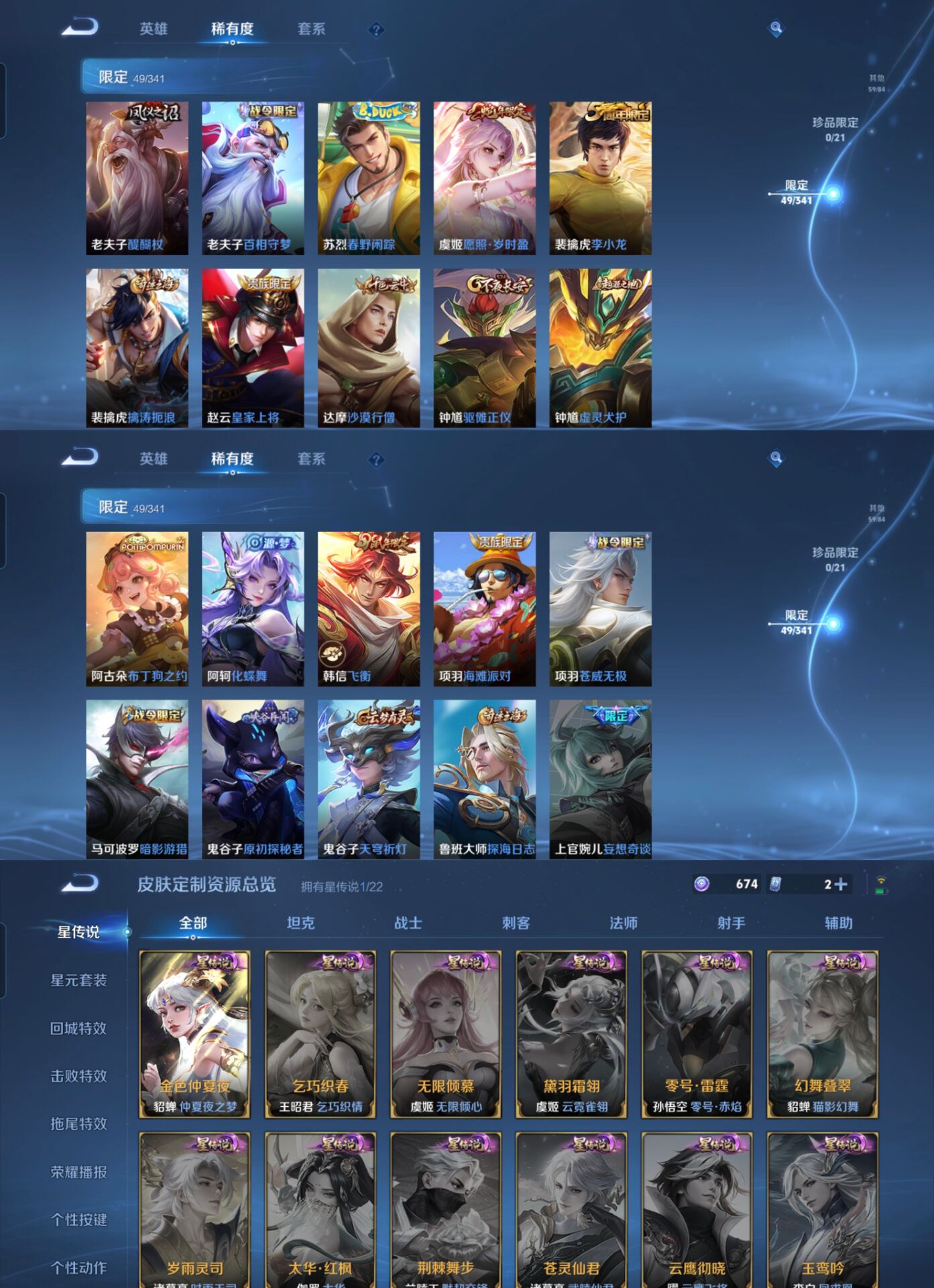 【史诗皮肤】 百相守梦 飞衡 如梦令 布丁狗之约 谧流熔炉 电玩小子 天狼绘梦者 至尊宝 龙之律动 玄嵩 百相守梦 苍威无极 化蝶舞 魅语 舞动绿茵 幽灵船长 功夫厨神 魅力维加斯 魔术师 鹰眼统帅 圣诞恋歌 暗隐猎兽者 逐浪之夏 银河之约 地狱岩魂 德古拉伯爵 绅士熊喵 暗影游猎 金属风暴 李小龙 水果甜心 时之恋人 乘风破浪 缤纷独