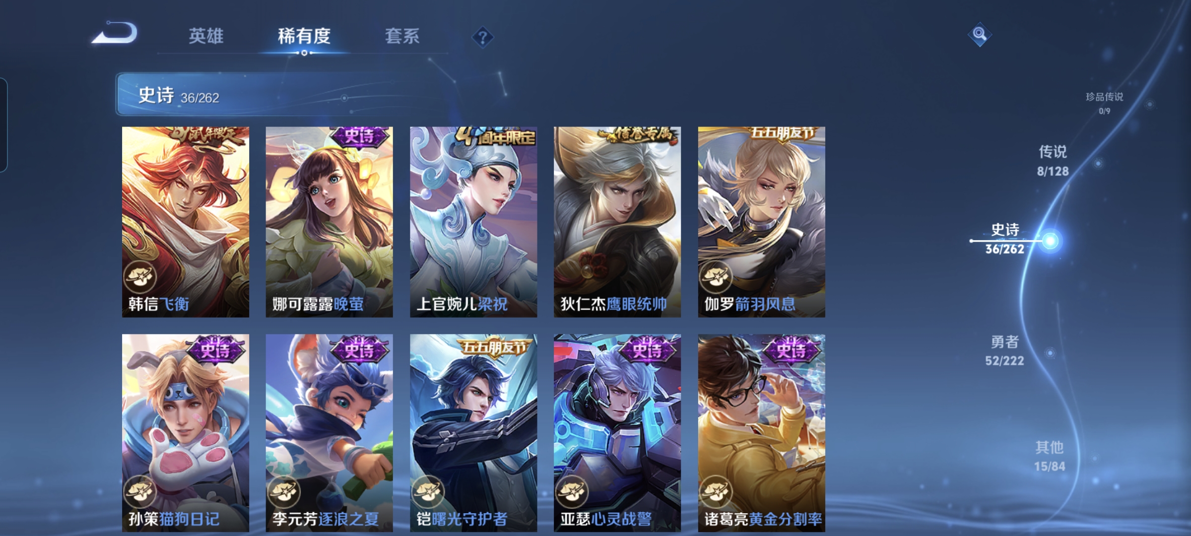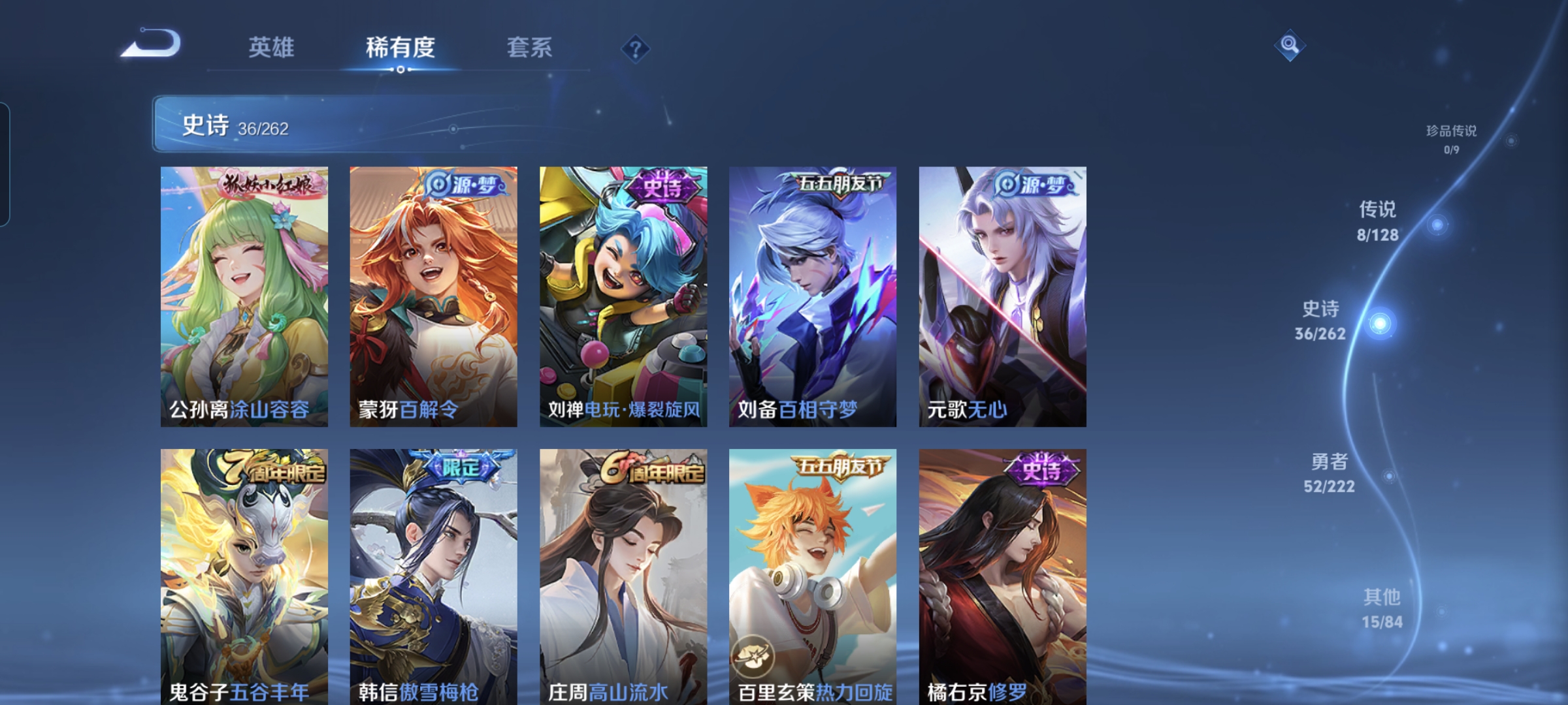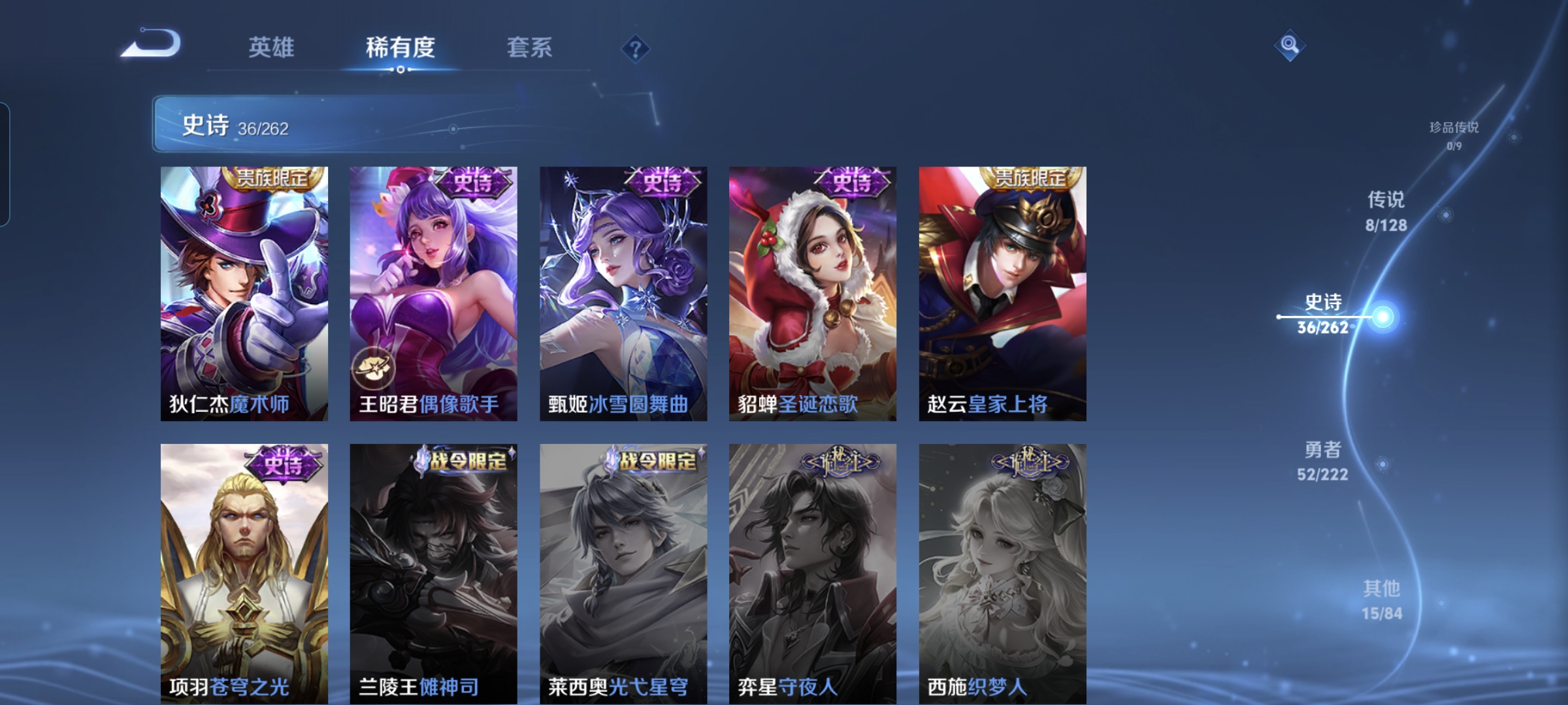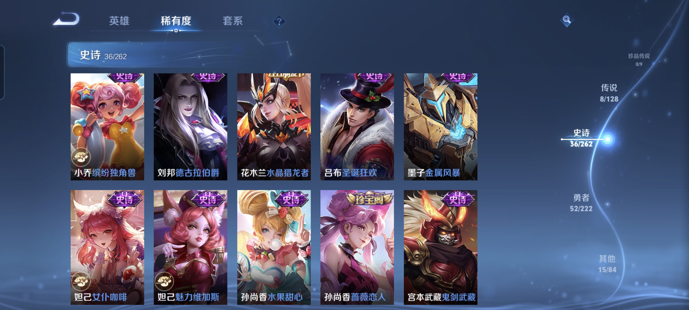 【史诗皮肤】 飞衡 傲雪梅枪 谧流熔炉 涂山容容 聚星闪耀 百解令 热力回旋 女仆咖啡 魅力维加斯 魔术师 鹰眼统帅 圣诞恋歌 箭羽风息 鬼剑武藏 水晶猎龙者 修罗 曙光守护者 逐浪之夏 德古拉伯爵 圣诞狂欢 金属风暴 晚萤 梁祝 猫狗日记 水果甜心 蔷薇恋人 偶像歌手 苍穹之光 缤纷独角兽 心灵战警 皇家上将 冰雪圆舞曲 黄金分割率