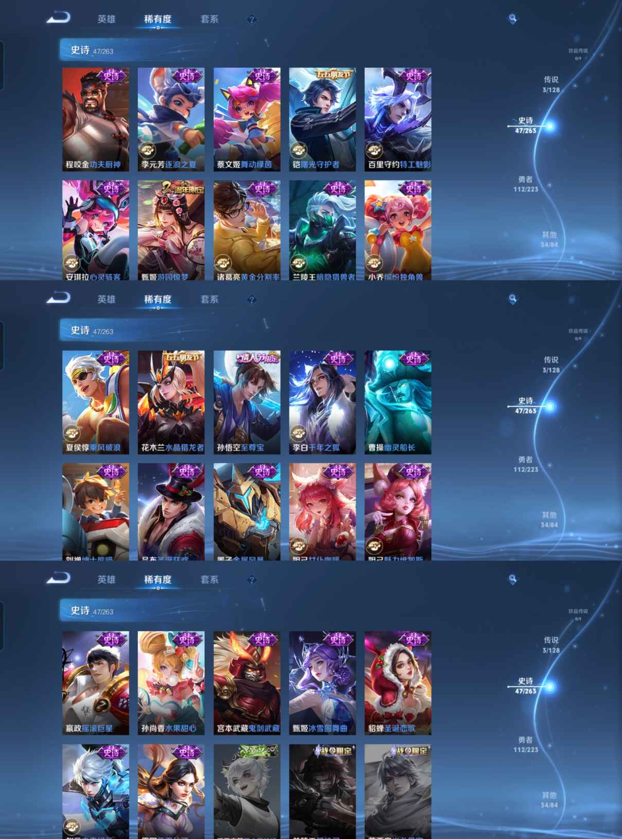 【史诗皮肤】 谧流熔炉 至尊宝 踏浪烽翎 聚星闪耀 江河有灵 百相守梦 漠中幻影 顽岩魄 化蝶舞 魅语 舞动绿茵 幽灵船长 繁星吟游 功夫厨神 女仆咖啡 魅力维加斯 鹰眼统帅 圣诞恋歌 箭羽风息 鬼剑武藏 水晶猎龙者 曙光守护者 暗隐猎兽者 千年之狐 逐浪之夏 绅士熊喵 紫霞仙子 圣诞狂欢 金属风暴 梁祝 李小龙 月团寄思 猫狗日记 水果甜心 时之恋人 乘风破浪 缤纷独角