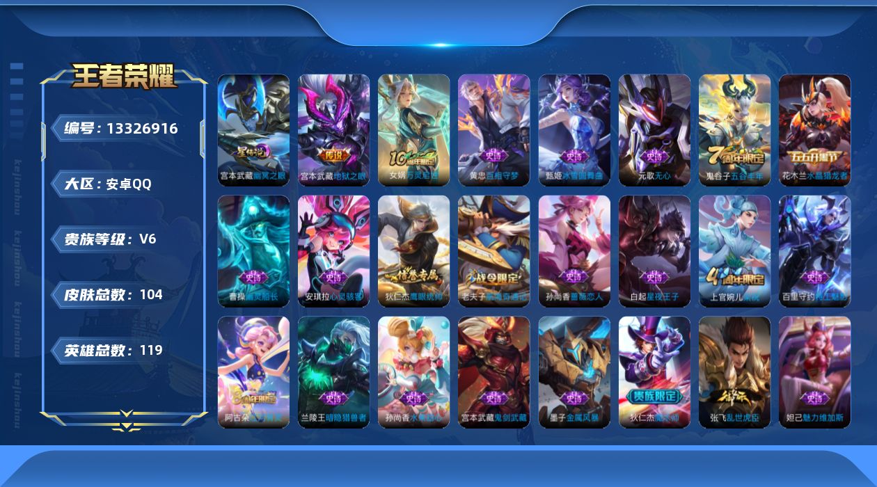 王者荣耀【安卓QQ】【13326916】[13326916]贵族等级: V6 英雄数: 119 皮