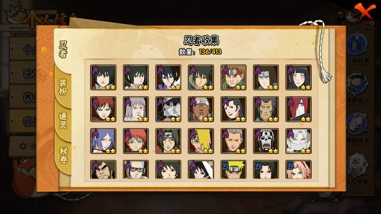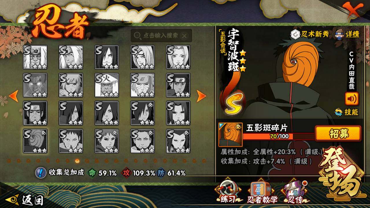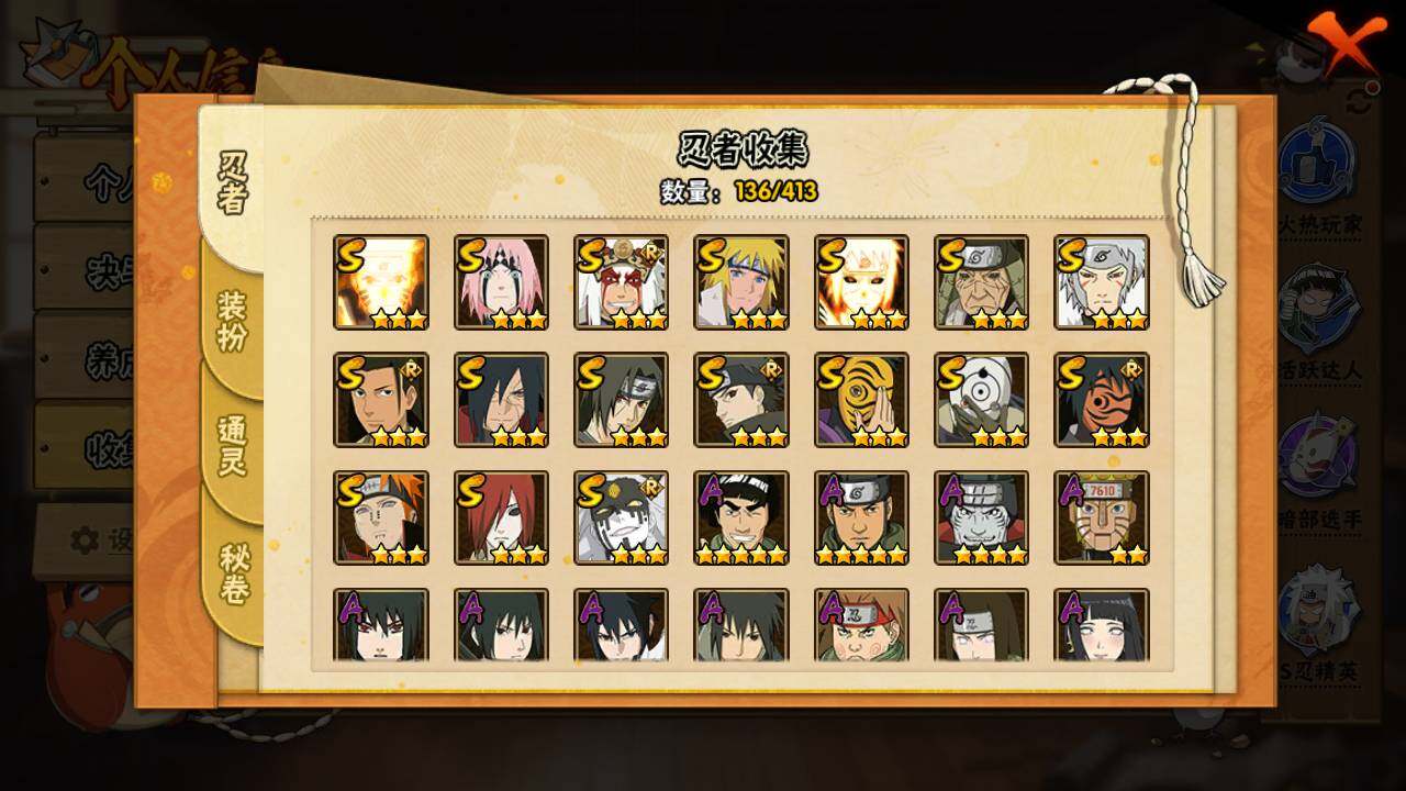 【S级忍者】:长门「秽土转生」(3星),猿飞日斩「秽土转生」(3星),宇智波斑「秽土转生·解」(3星),春野樱「忍界大战」(3星),宇智波鼬「须佐能乎」(3星),宇智波止水「须佐能乎」(3星),千手柱间「木叶创立」(3星),自来也「舞之豪杰」(3星),千手扉间(3星),波风水门(3星),神秘面具男(3星),神秘面具男「红夜