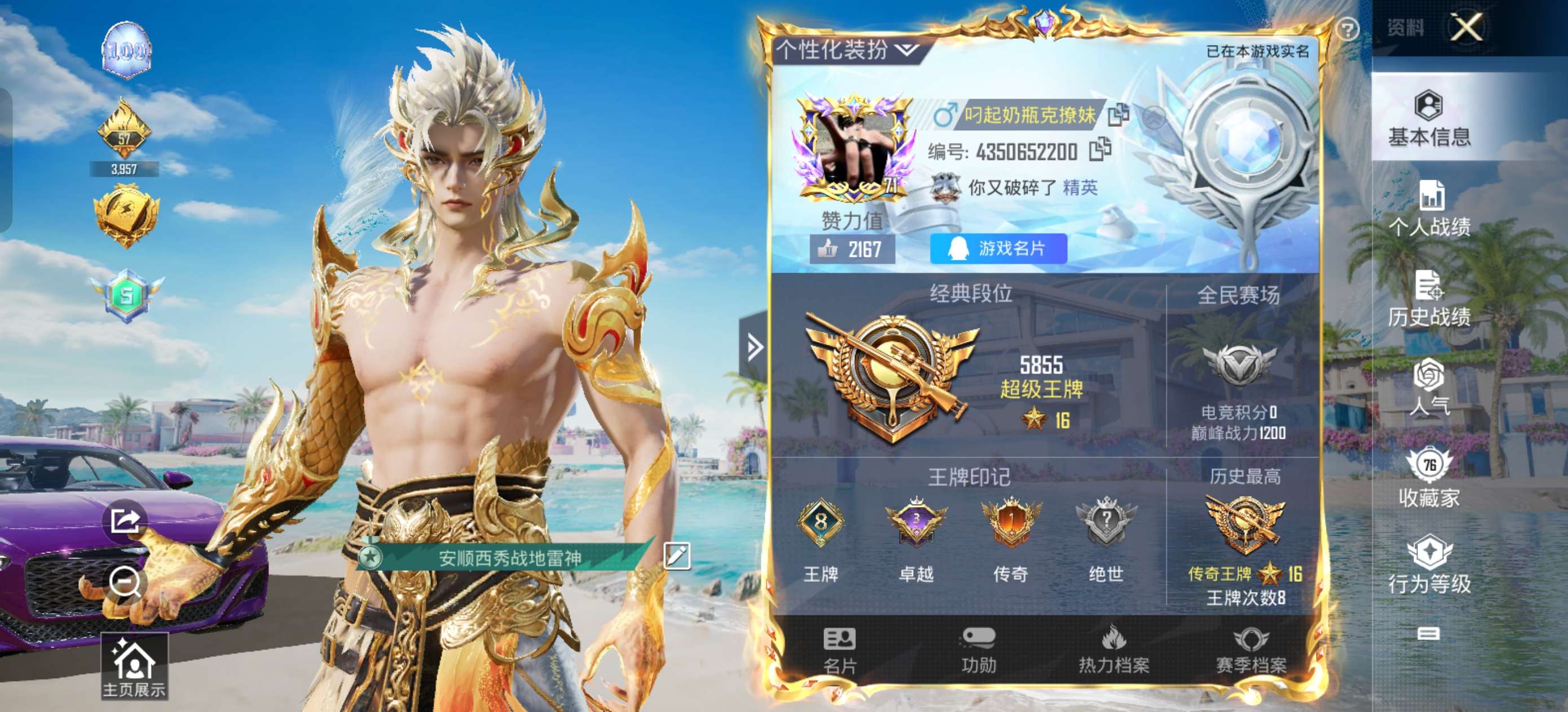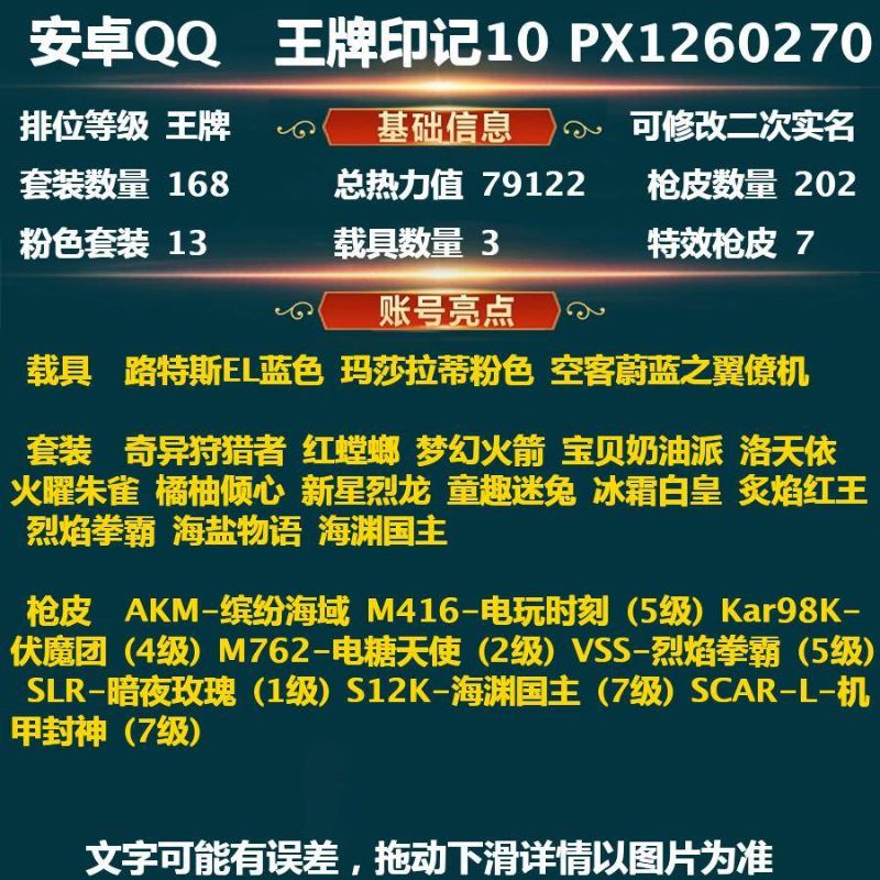 和平精英【安卓QQ】精品号,衣服多 12把升级枪,五辆载具,10王牌印记,传奇印记