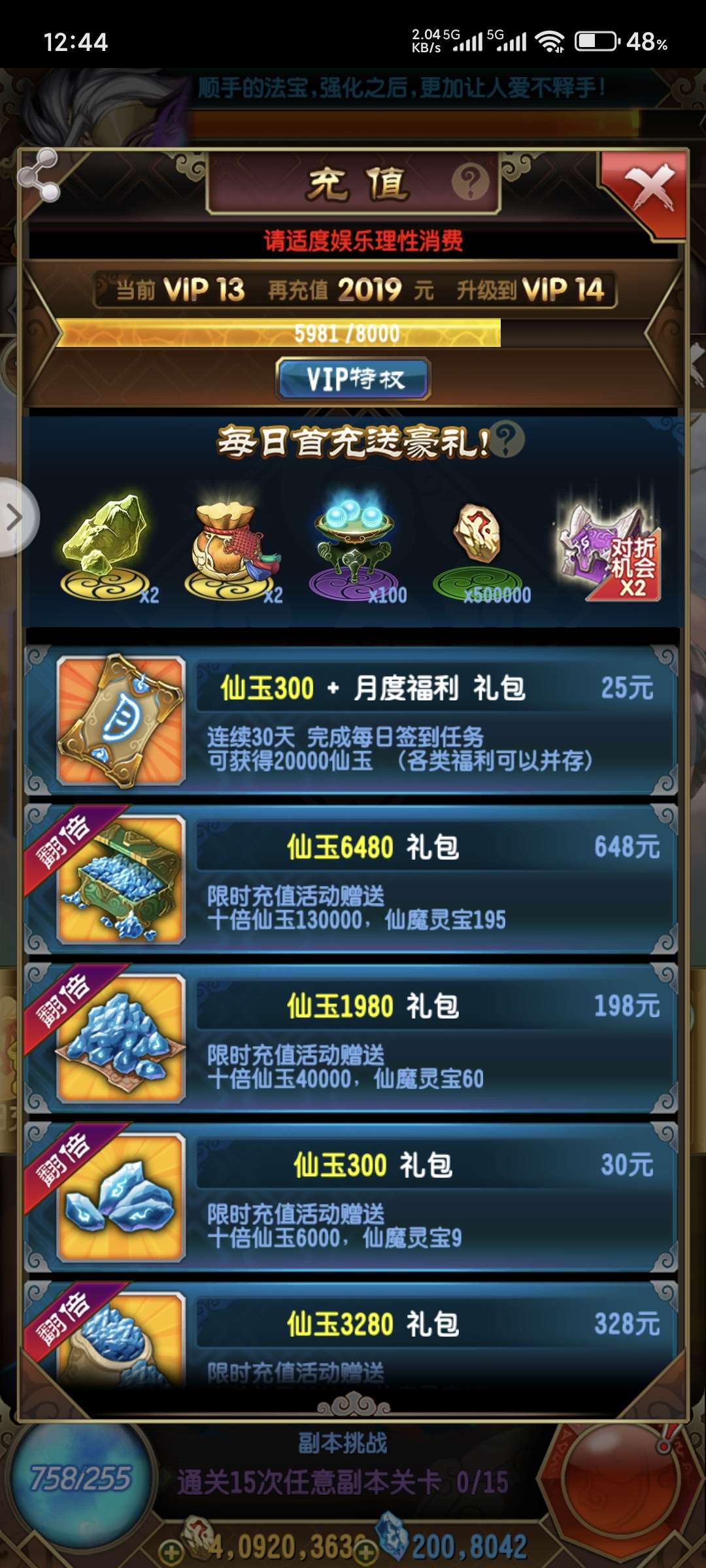 大乘境界每月月底可以领十万仙玉,目前200万,还可以继续做法宝。