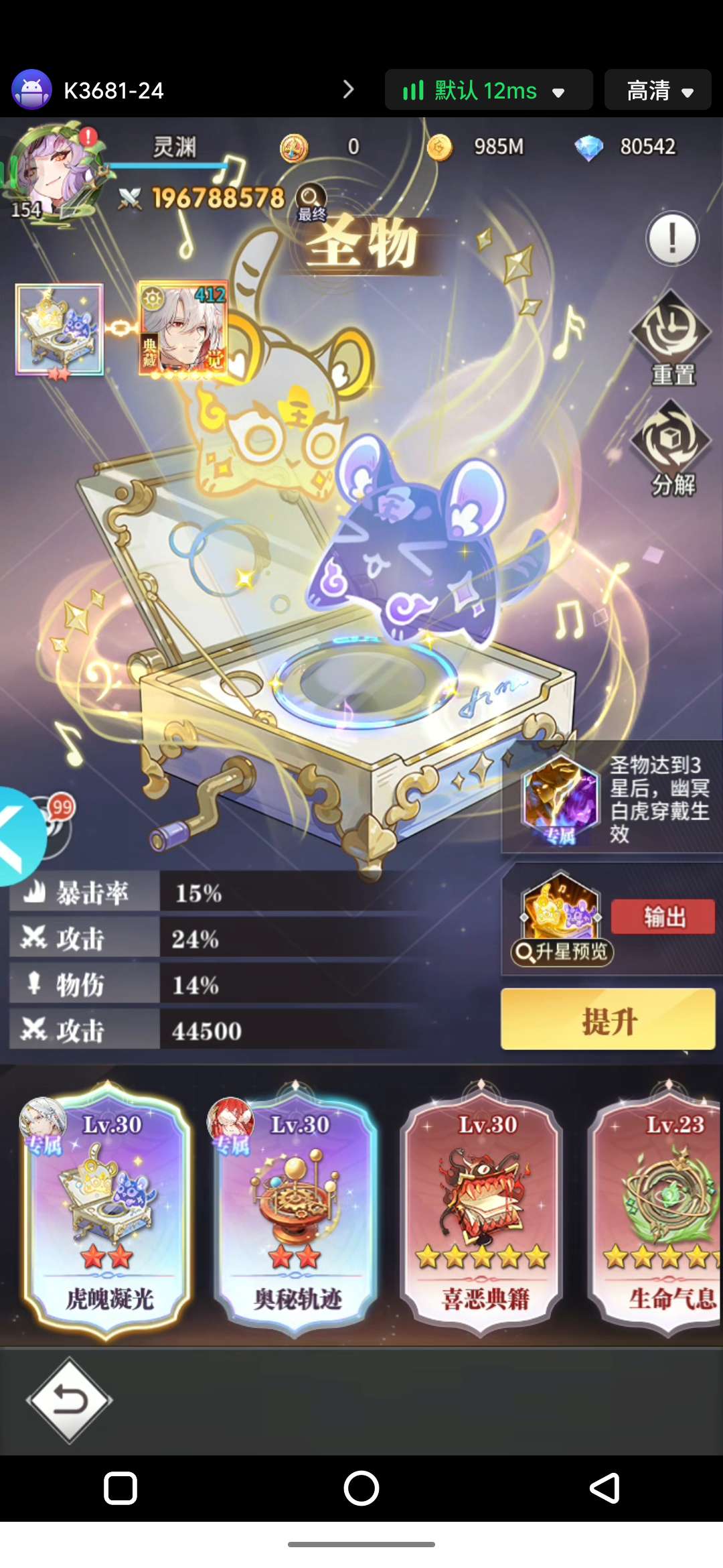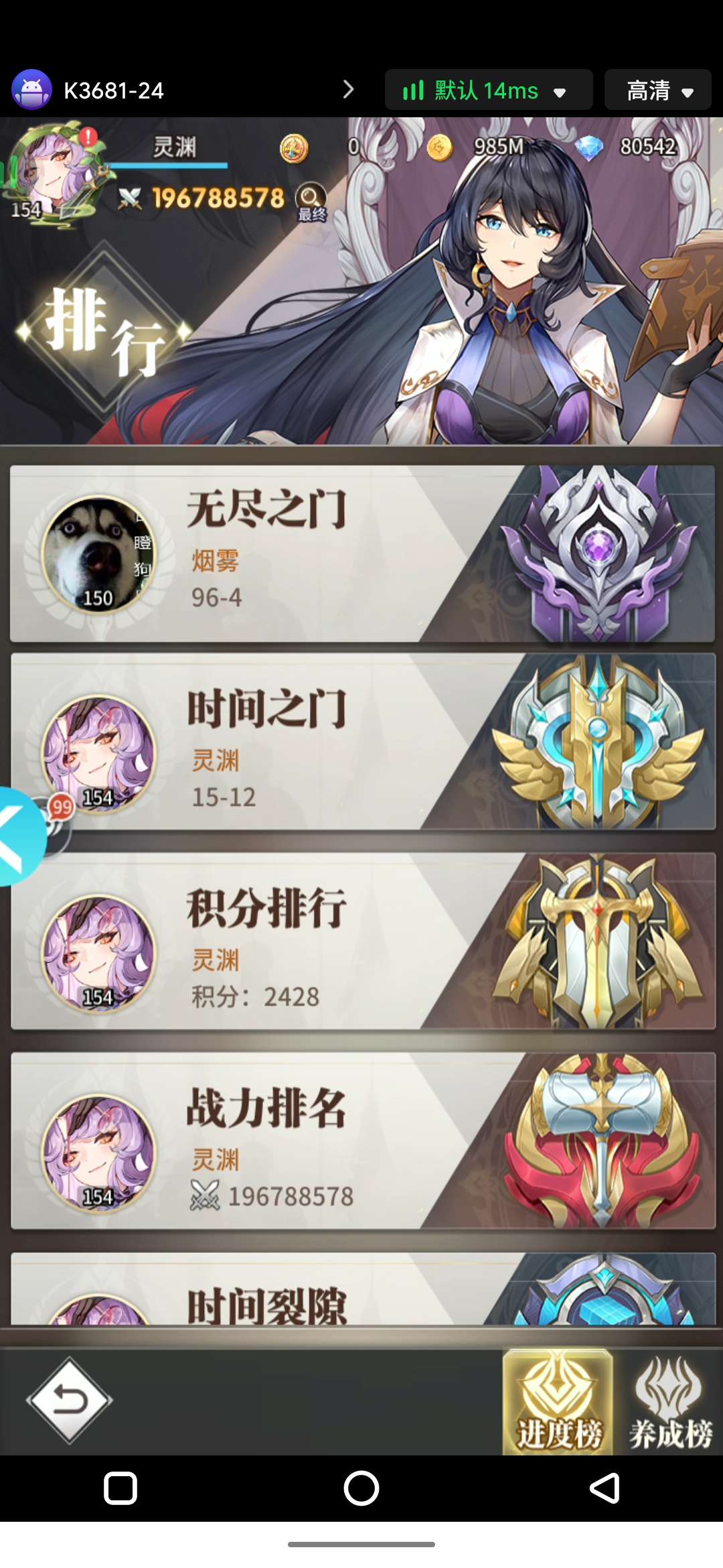 V15准2两亿,8级头,五觉虎,五觉天使唐晨准觉3,无双暗器五星。基本孔位全开,续充2.7