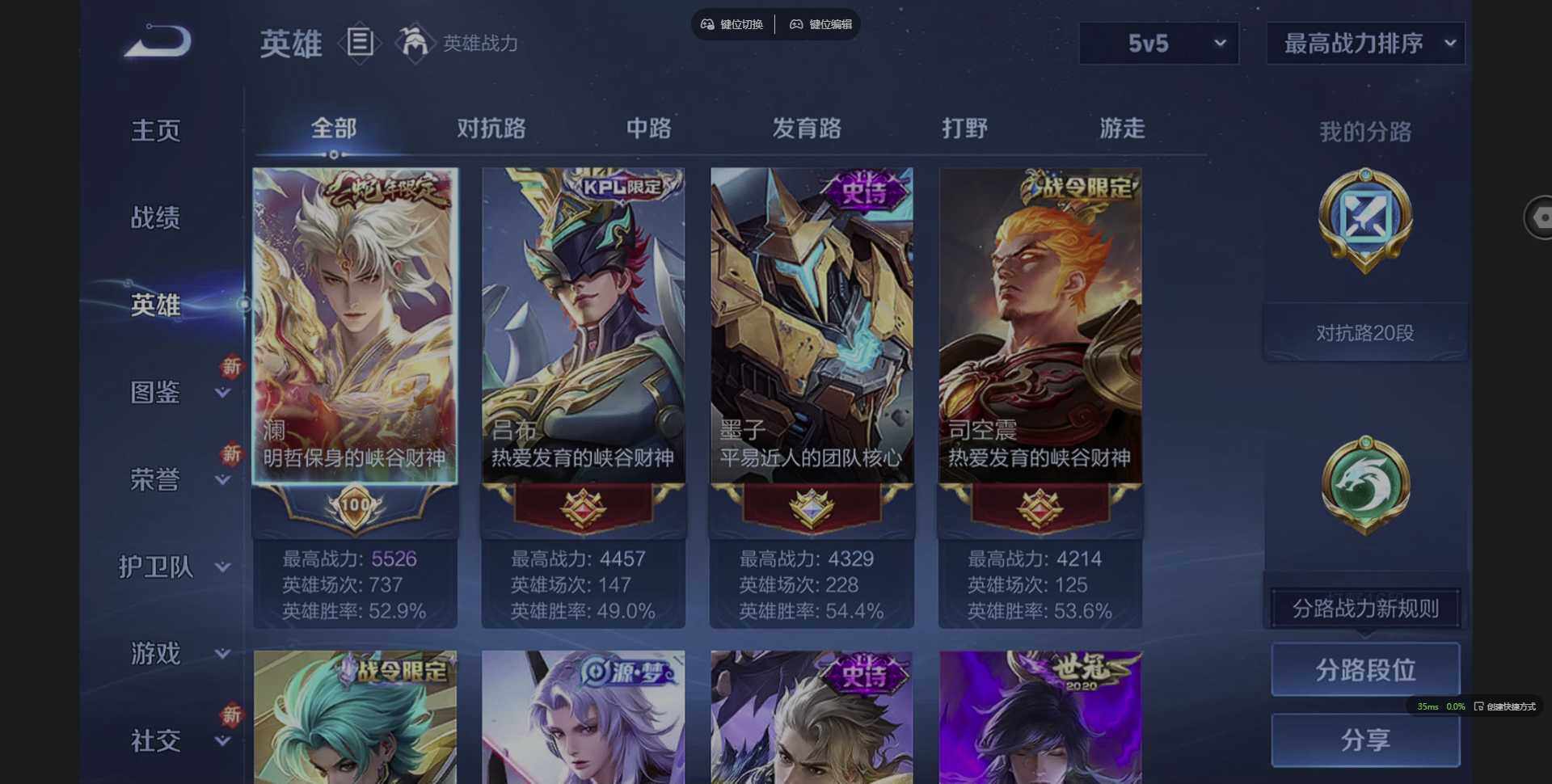 贵族等级: V7 英雄数: 125 皮肤数: 191 珍品传说: 朽木白哉 传