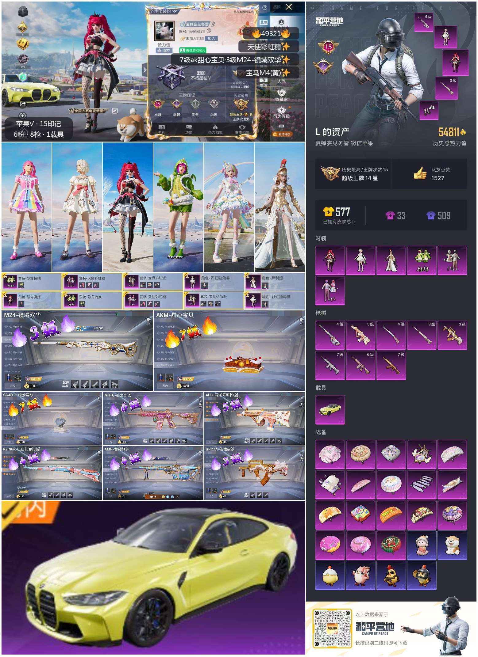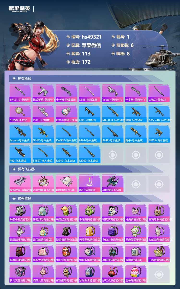 和平精英【苹果微信】hs49321 苹果v-15王牌印记-6粉装-8特效枪-1载具-54811热力值-113套装-17