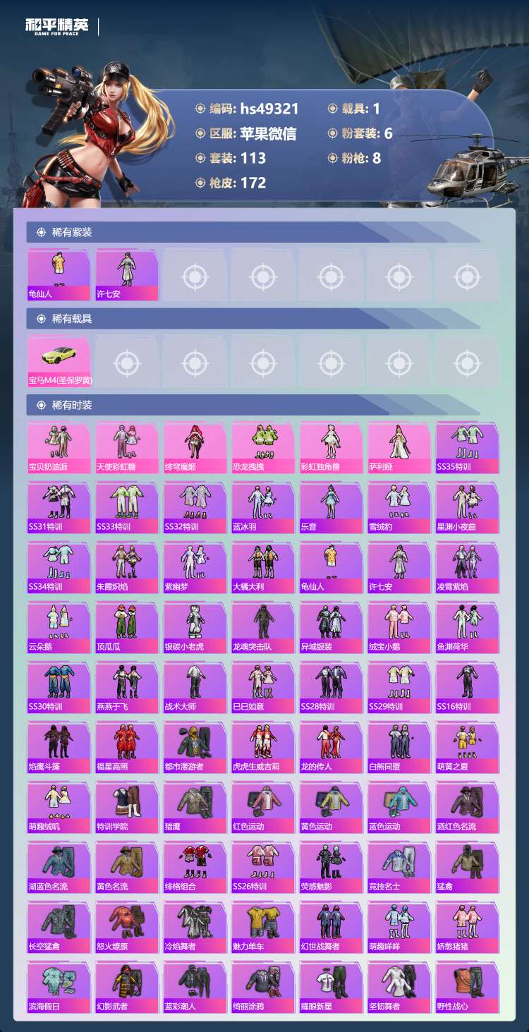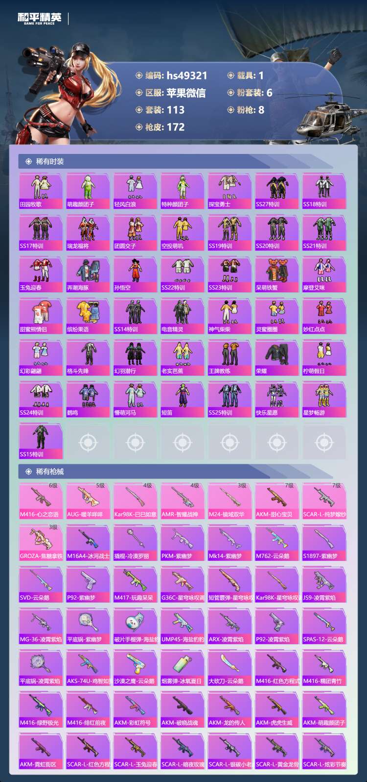 hs49321 苹果微-15王牌印记-6粉装-8特效枪-1载具-54811热力值-113套装-17