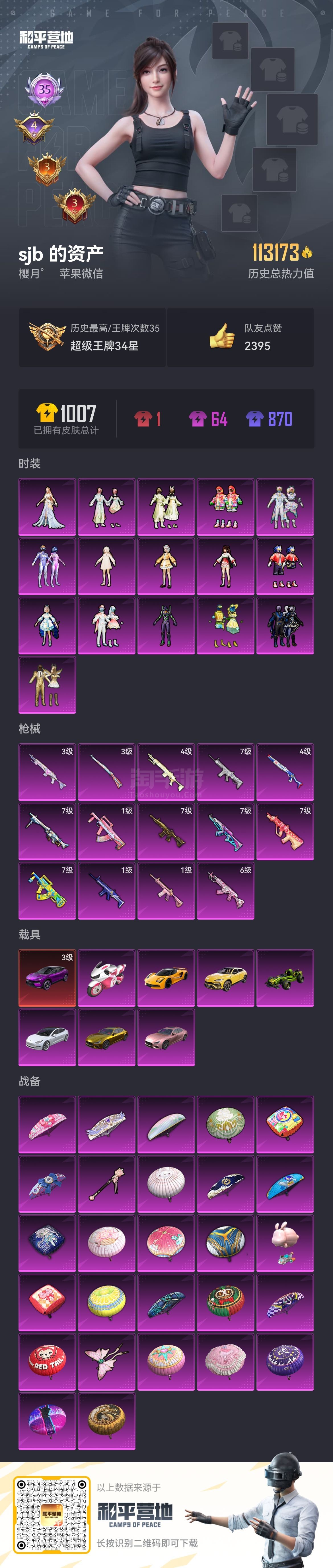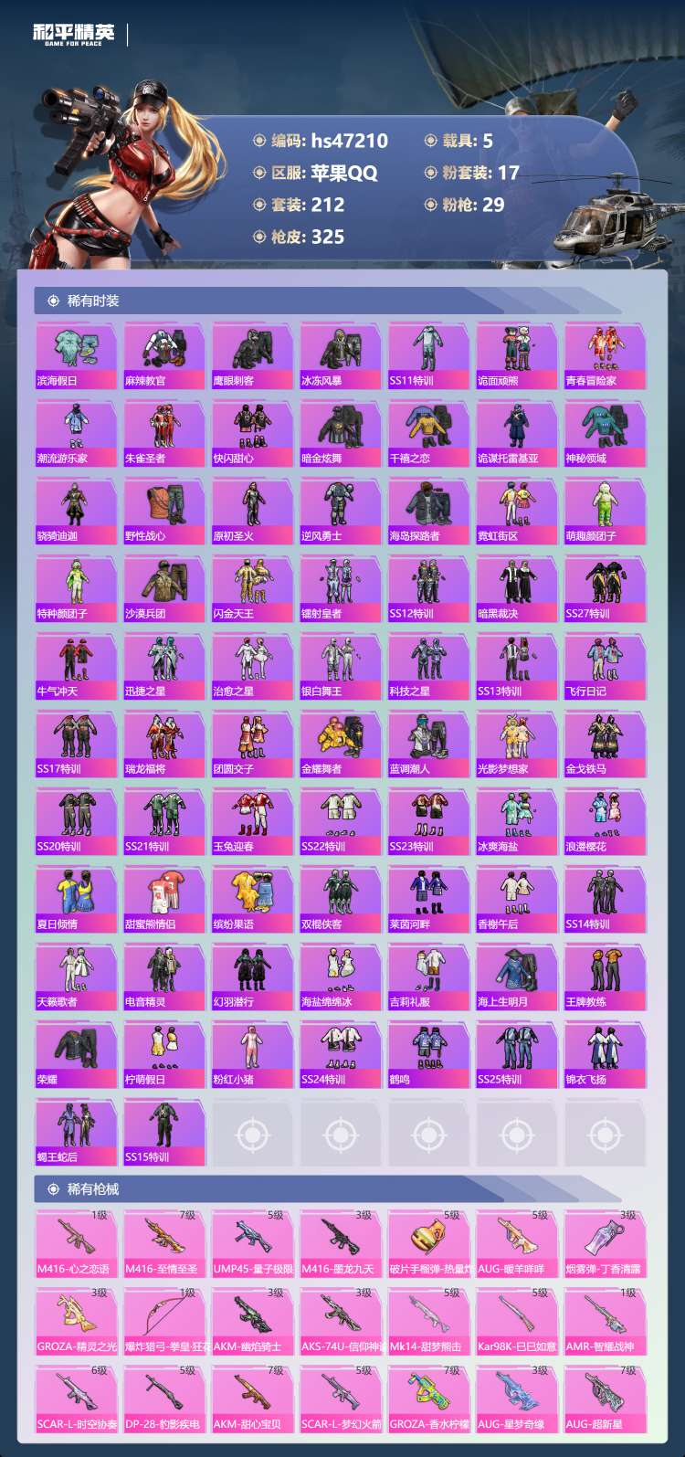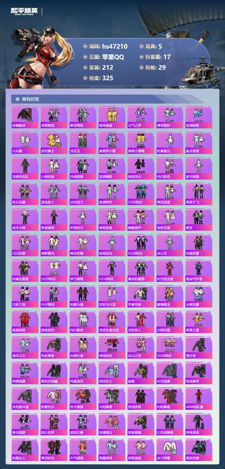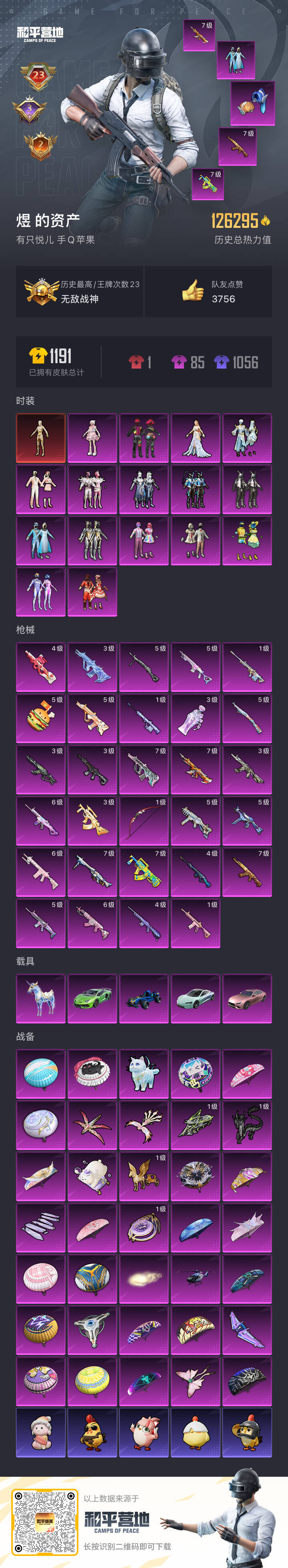 苹果手Q-23王牌印记-有战神框-1红装-17粉装-29特效枪-5载具-128335热力值-212套