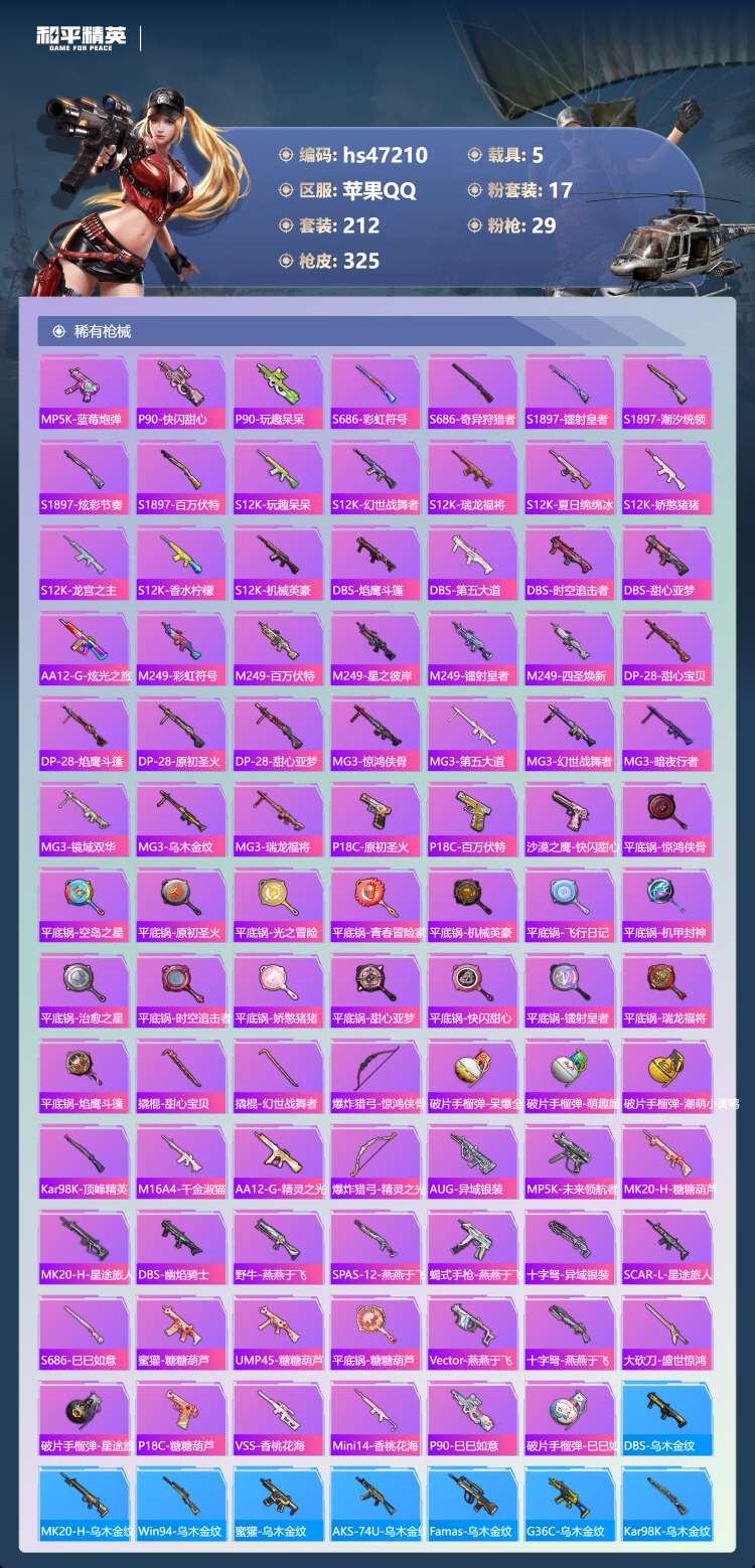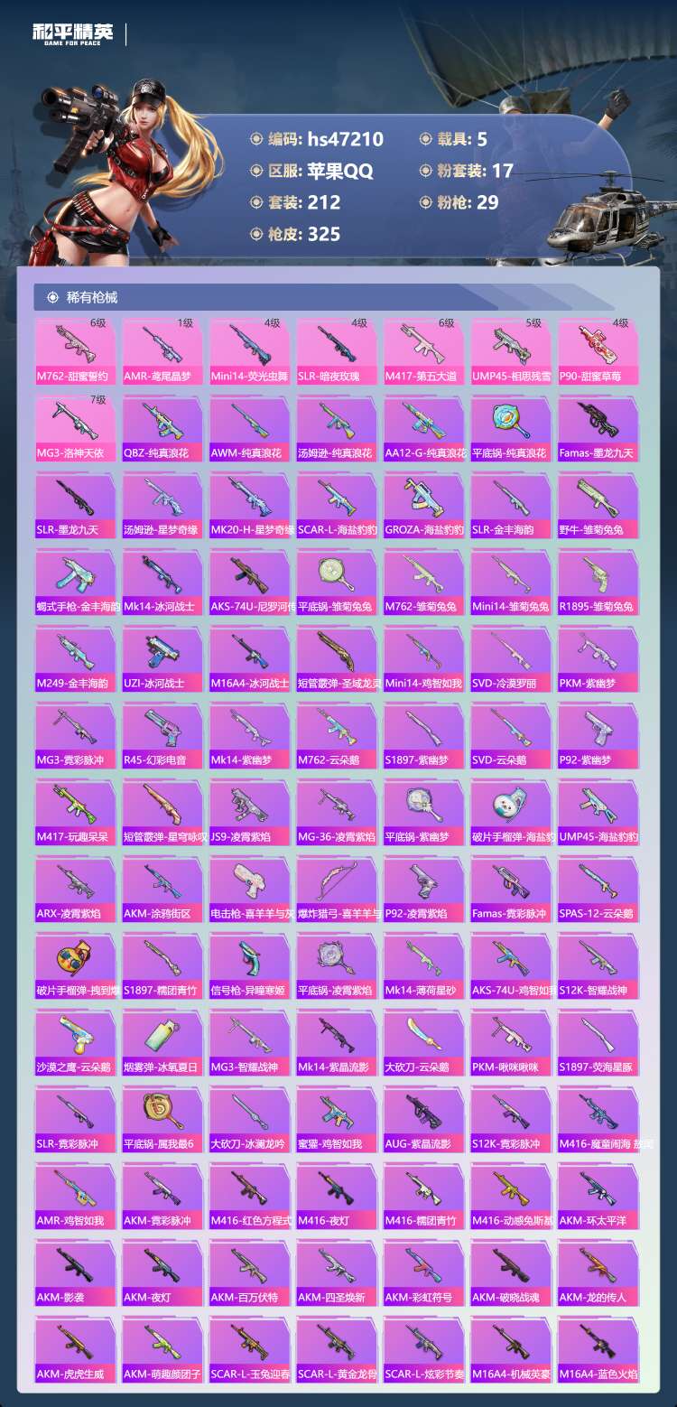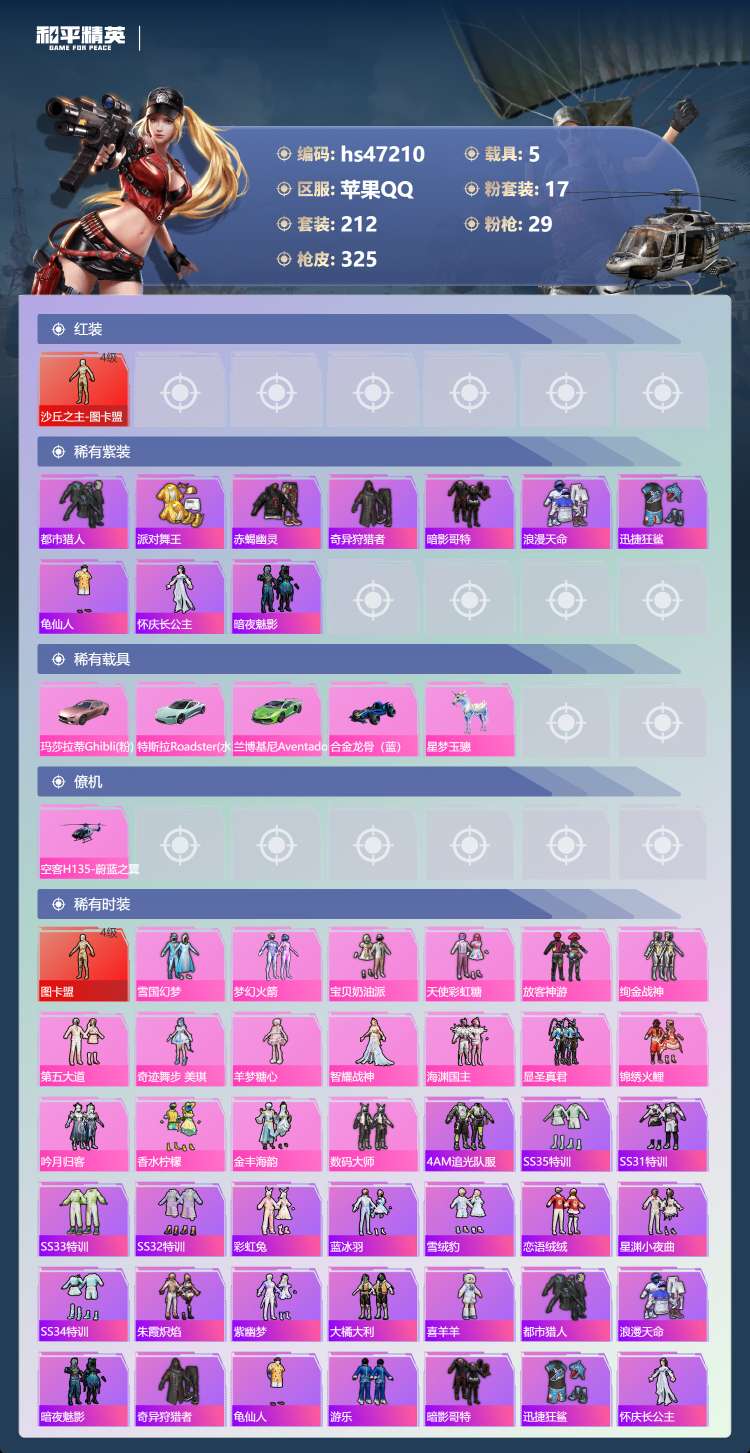 和平精英【苹果QQ】苹果手Q-23王牌印记-有战神框-1红装-17粉装-29特效枪-5载具-128335热力值-212套