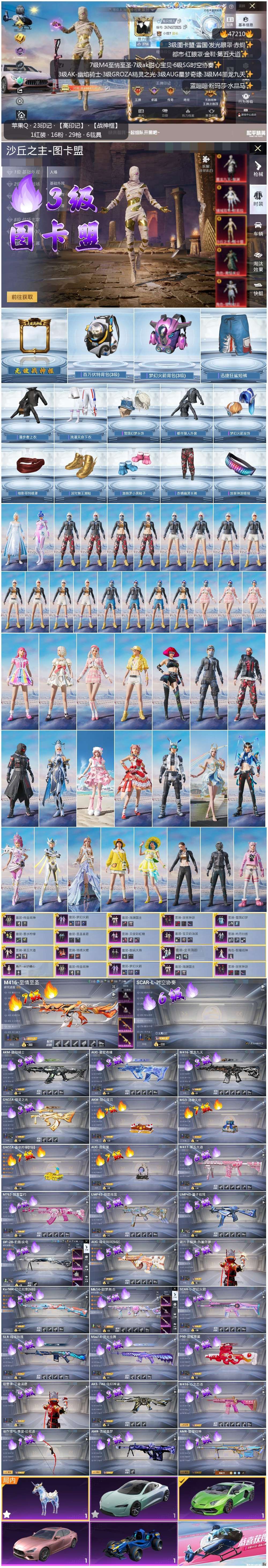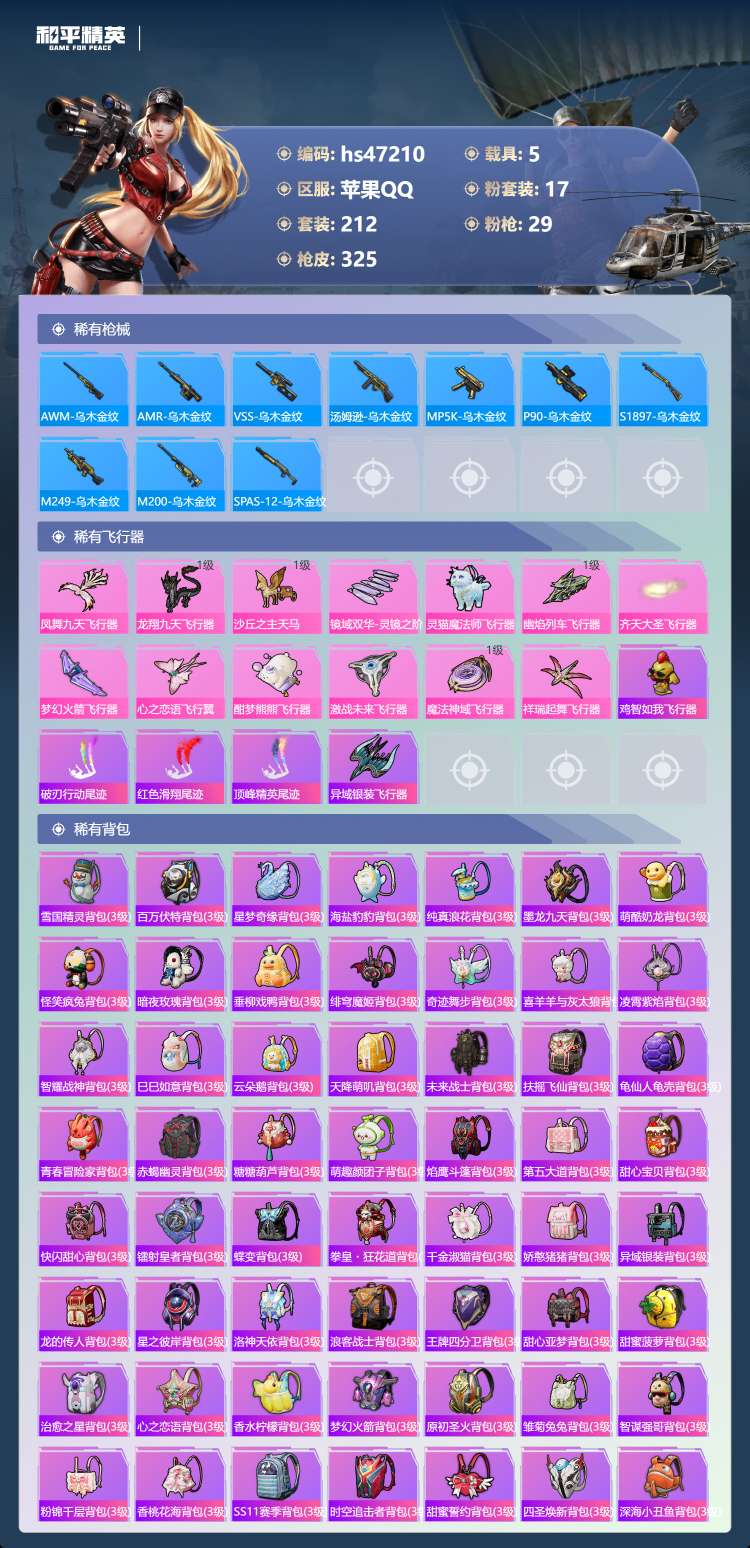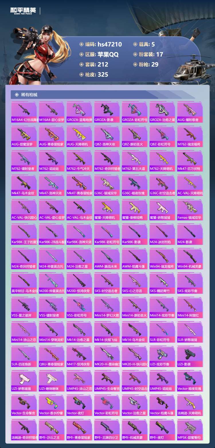 和平精英【苹果QQ】苹果手Q-23王牌印记-有战神框-1红装-17粉装-29特效枪-5载具-128335热力值-212套