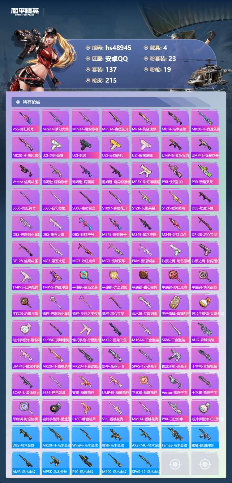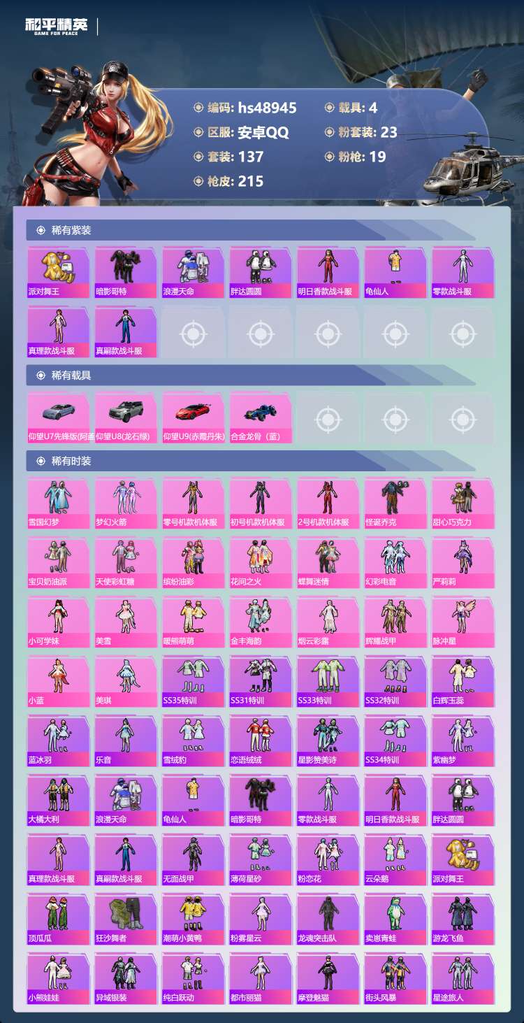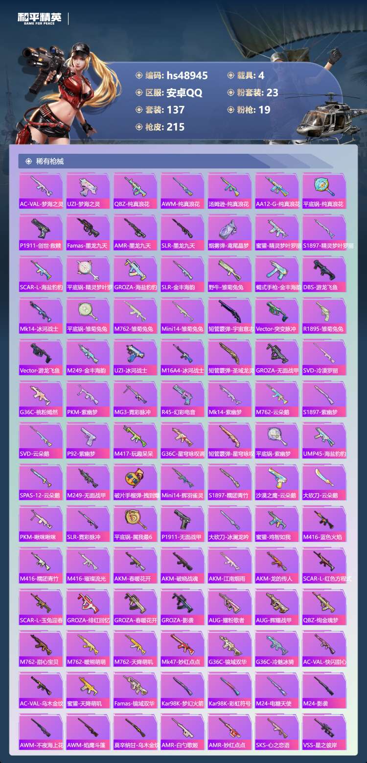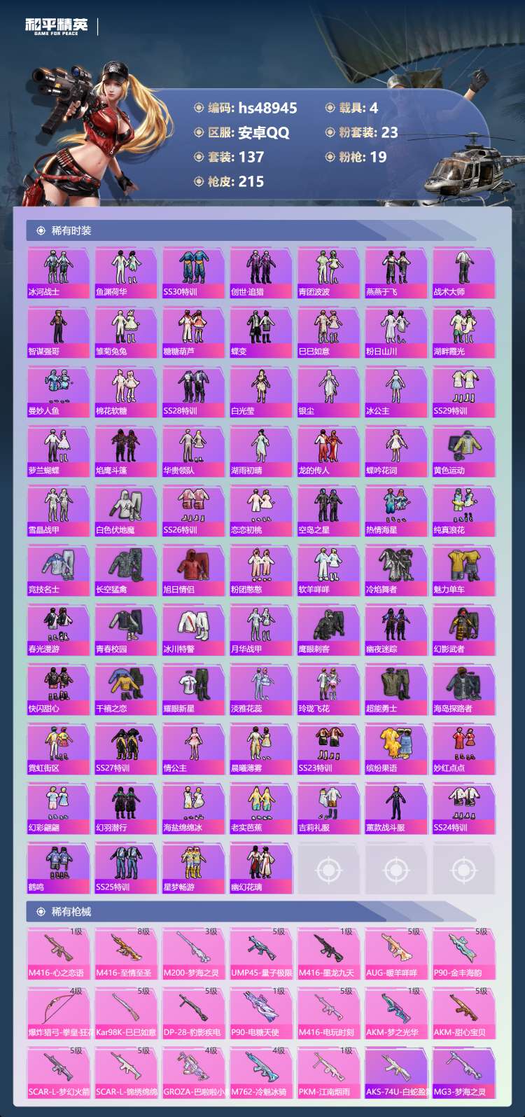 和平精英【安卓QQ】hs48945 安卓手Q-8王牌印记-23粉装-19特效枪-4载具-81025热力值-137套装-2