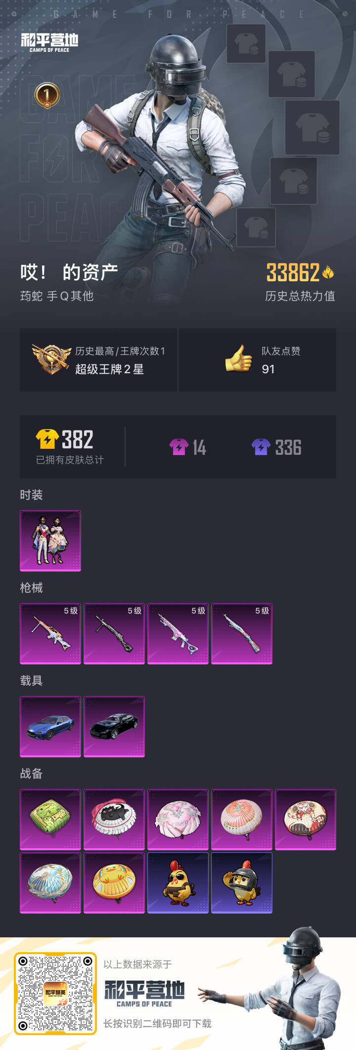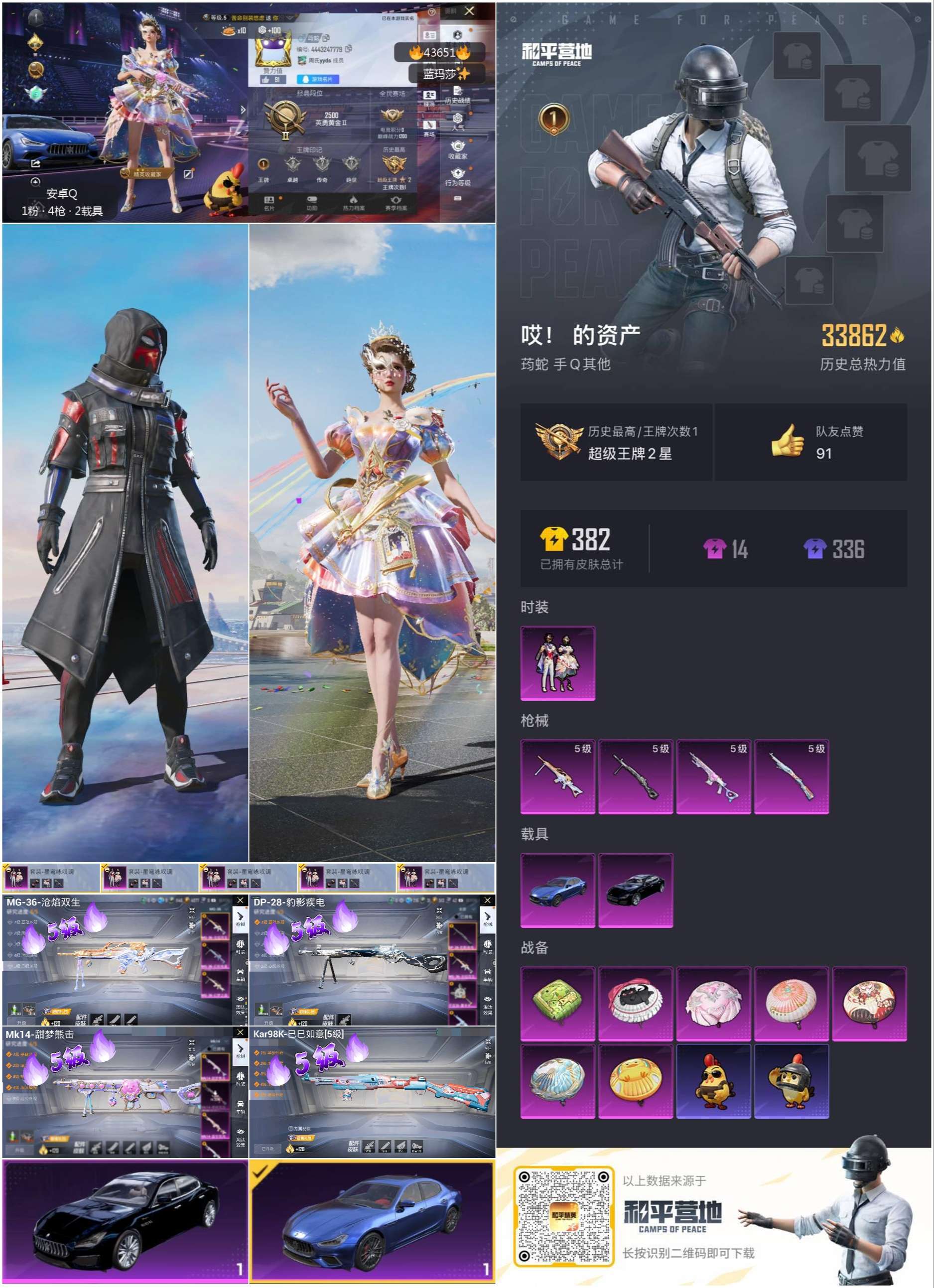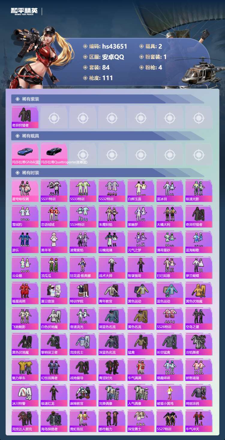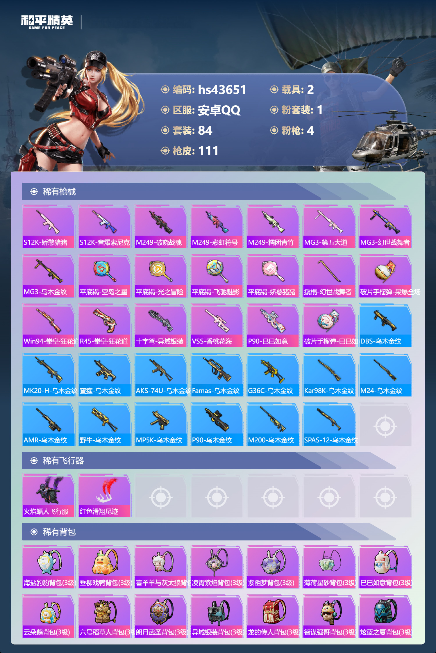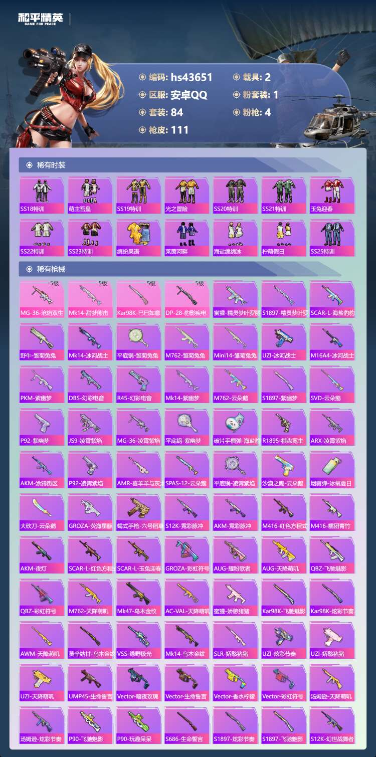 和平精英【安卓QQ】hs43651 安卓手Q-1王牌印记-1粉装-4特效枪-2载具-33862热力值-84套装-111枪