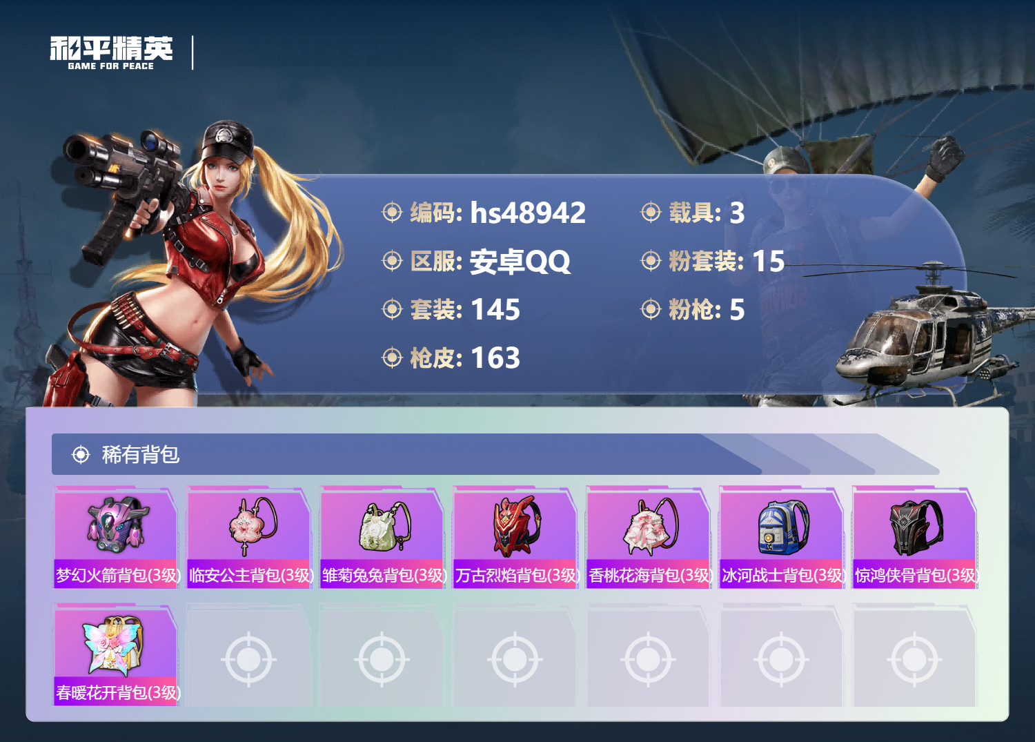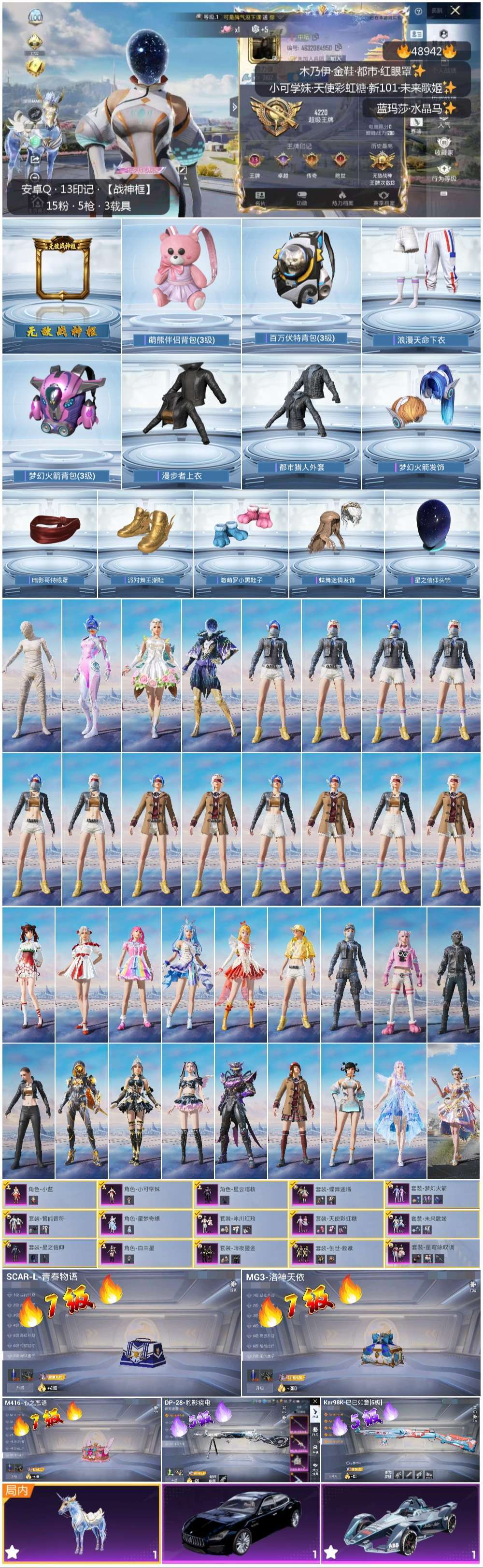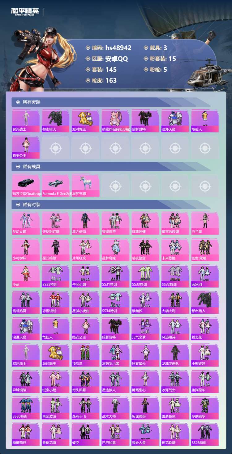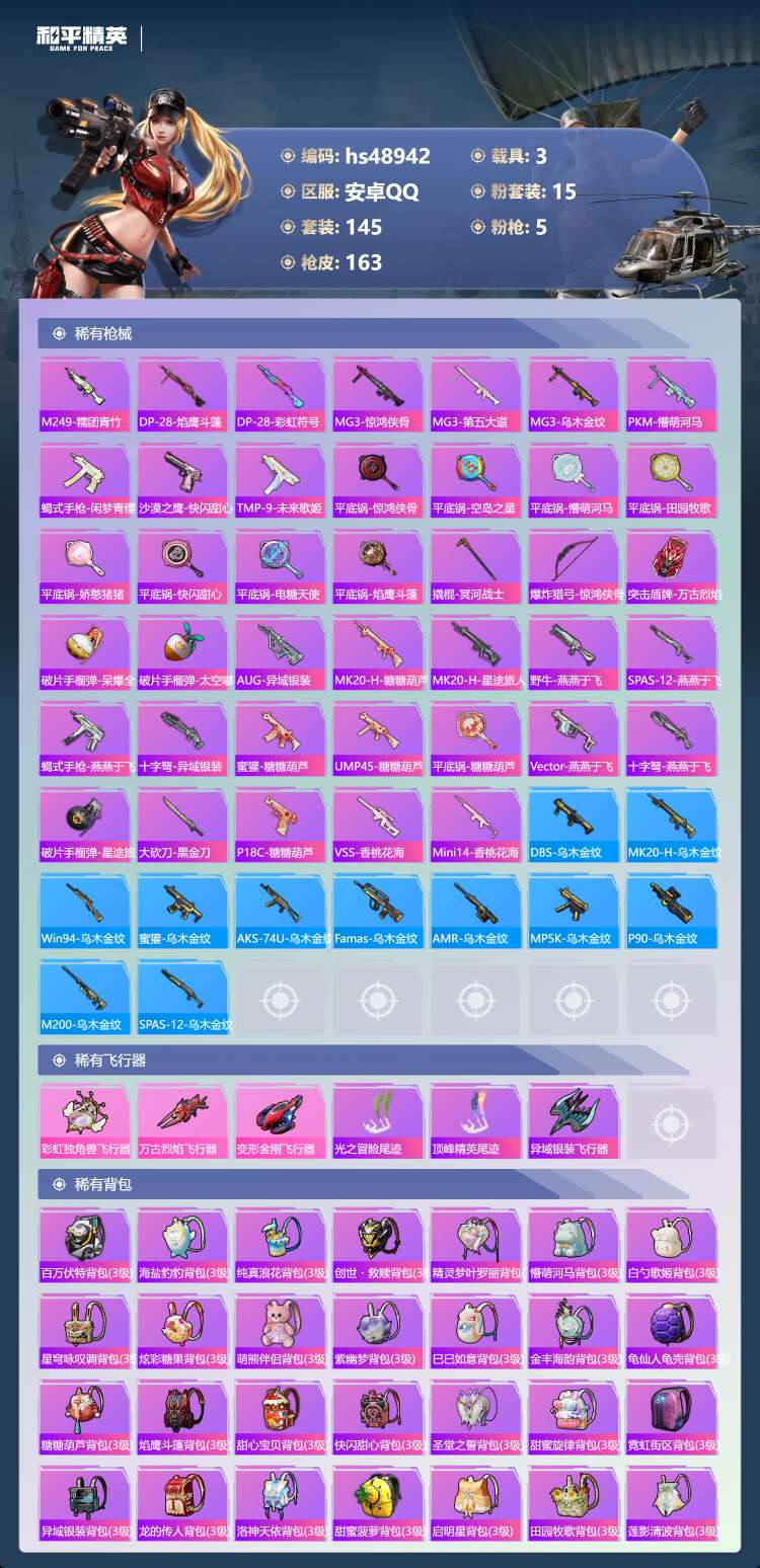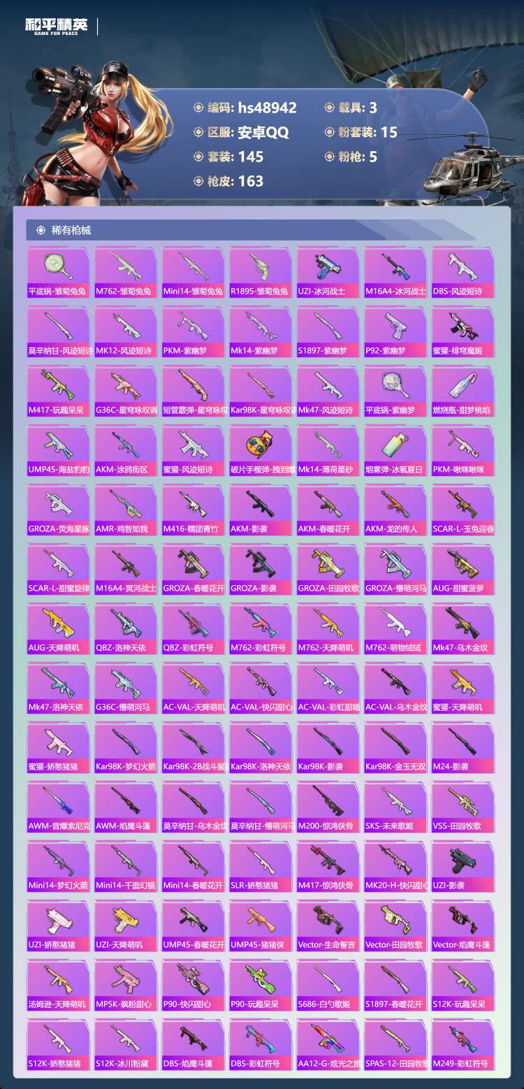 和平精英【安卓QQ】hs48942 安卓手Q-13王牌印记-有战神框-15粉装-5特效枪-3载具-64921热力值-14