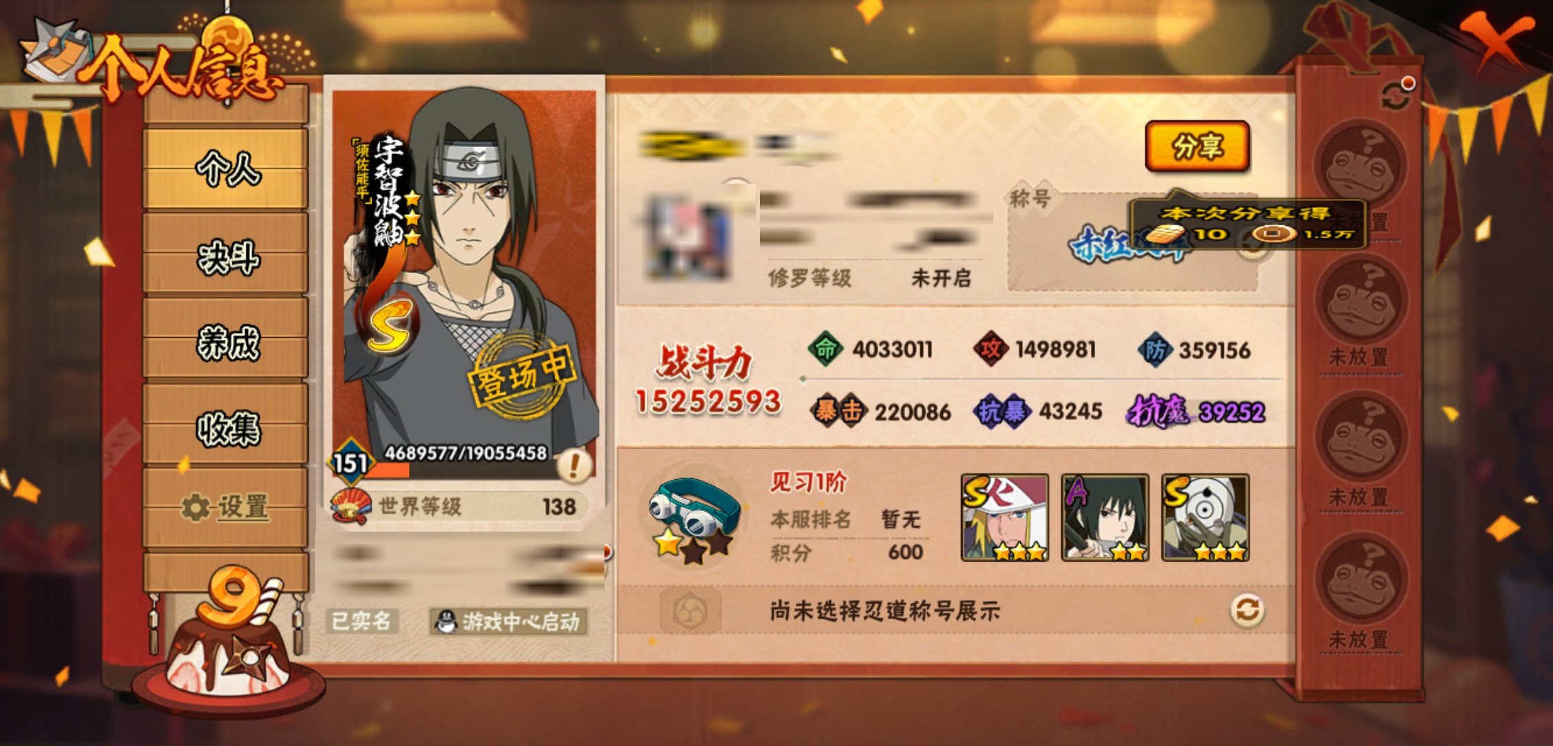 战斗力:1525W+;段位:见习1阶;本服排名:63;