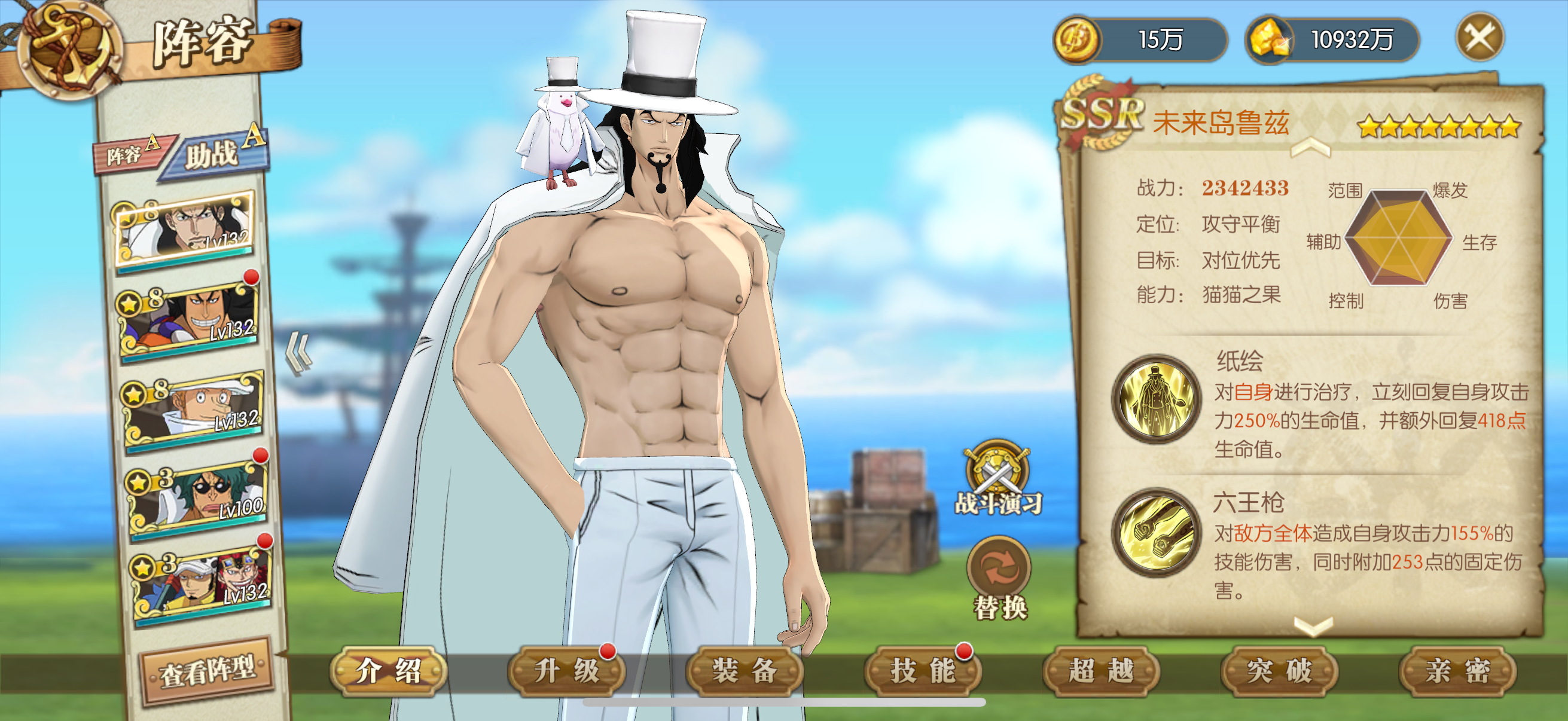 超多ssr,有月卡钥匙,两个通行证已开,资源丰富,高活跃公会,海岛已开,最新ssr都有拉满,终极,竞技,天梯,有ur装备,还有ssr自选,路飞,路奇等等都有时装,可兑换任意称号