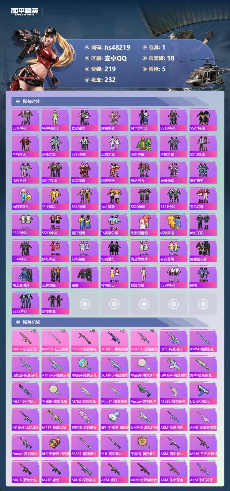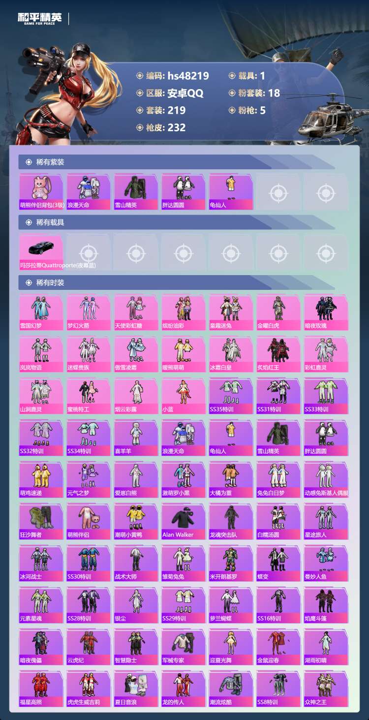 安卓Q-1稀有1载具18粉装5特效枪28热门219套装232枪皮 83628热力值 13印记 历史超