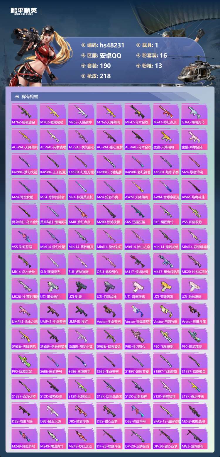 安卓Q-3稀有1载具16粉装13特效枪20热门190套装218枪皮 75780热力值 9印记 历史卓