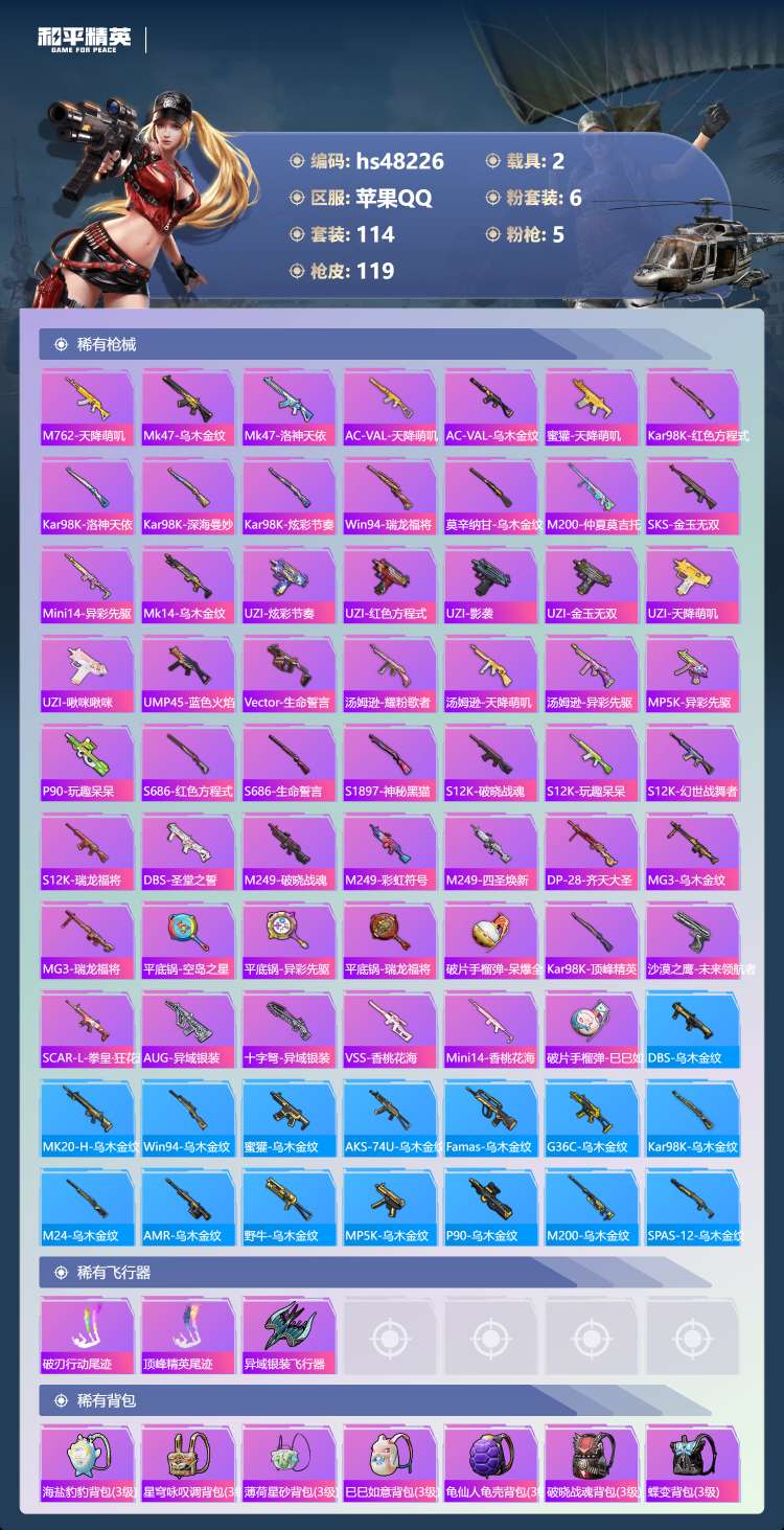 苹果Q-2载具6粉装5特效枪15热门114套装119枪皮 44330热力值 6印记 历史超级王牌7星