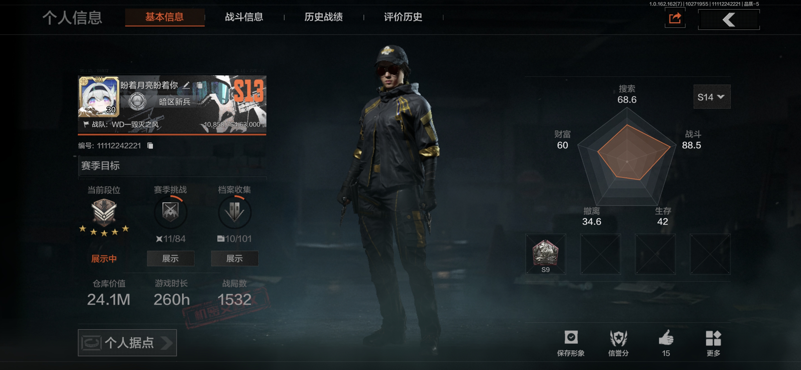 FY5669,总资产24m,近战武器:,赢家匕首,热能武器·补牢,寒牙手刺,角色装扮(紫):,王国卫队礼装,创伤小组·后勤工作服,都市夜影套装,金色枪皮:,利齿风暴·MPX,旧王圣谕·VSS,竞技·FAL,旧王圣谕·QBZ191,紫色枪皮:,棱光裂变·AKM,竞技·MDR,炎夏浪花·AR57,湖冰倒影·MP5,鱼跃丹青·M110,大金:,金狮子,盛宴雕像,古