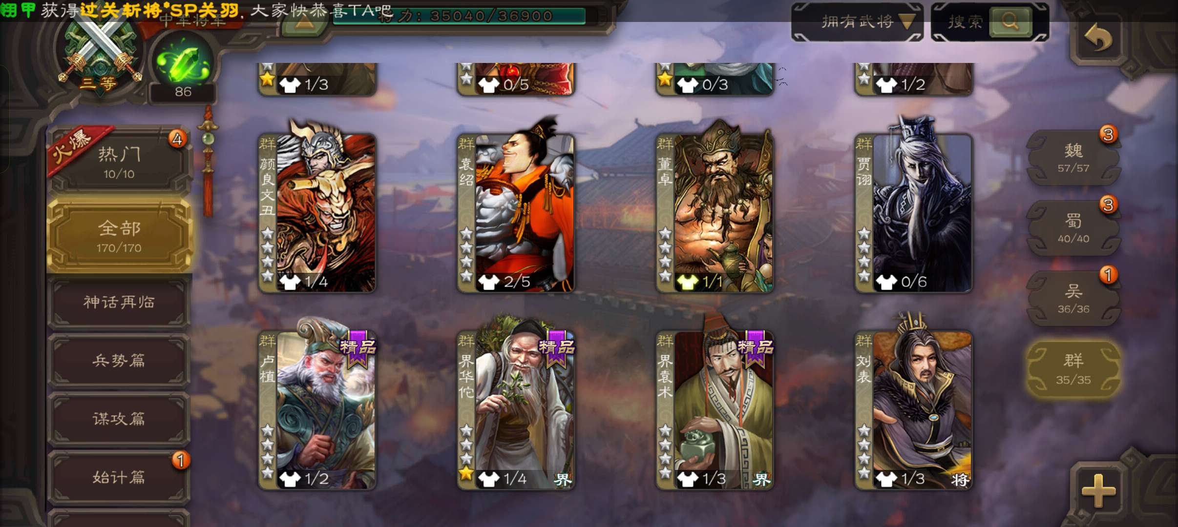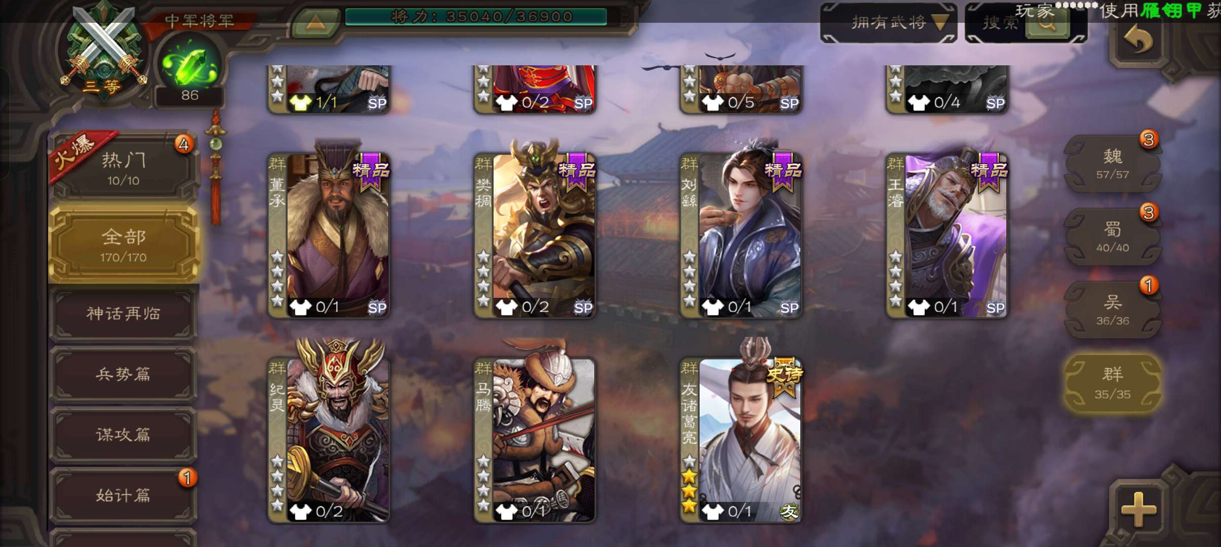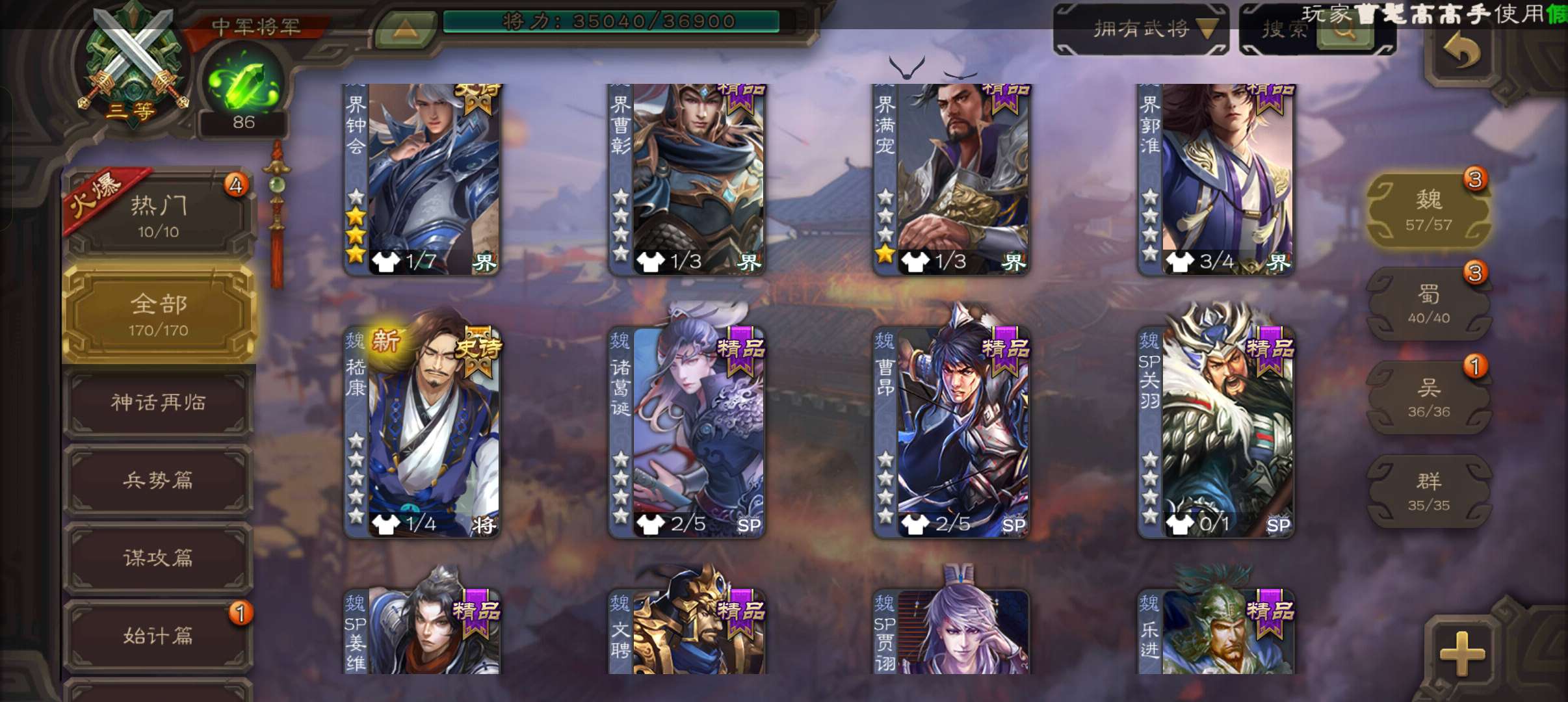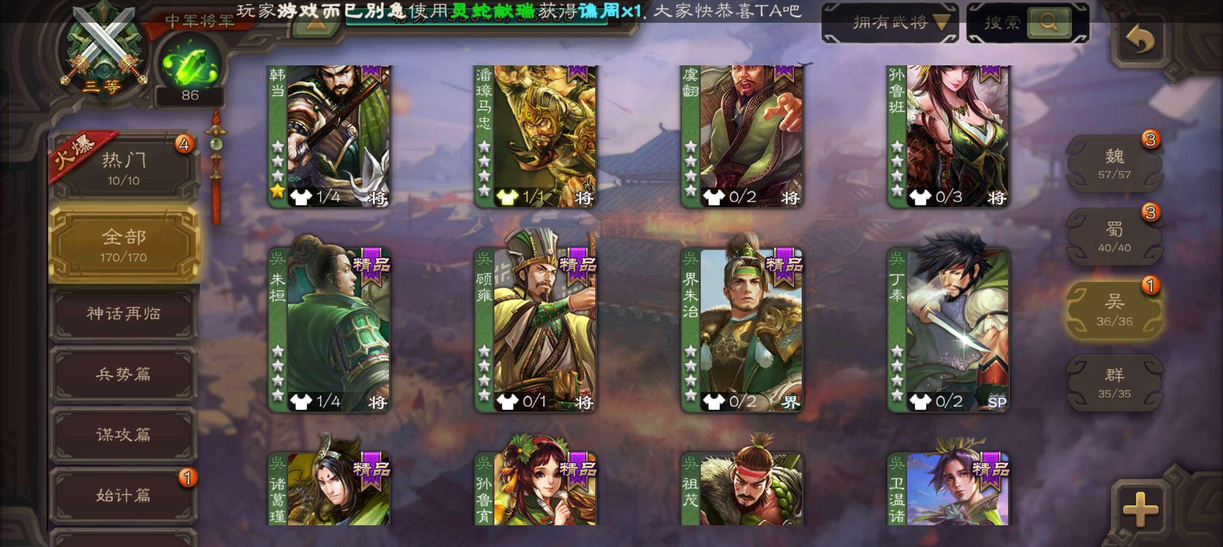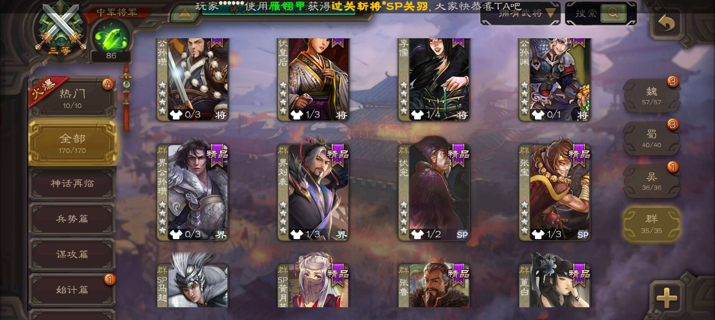 三国杀【安卓官方】7.9万羽毛7万豆,友诸葛亮神赵云神吕布戏志才界钟会界于禁牵招10史诗中军,谋周瑜界满宠170将