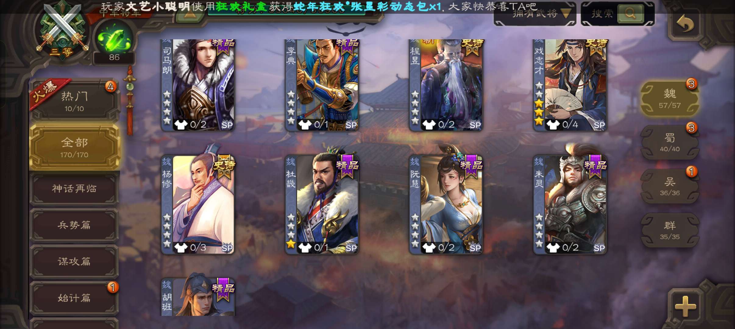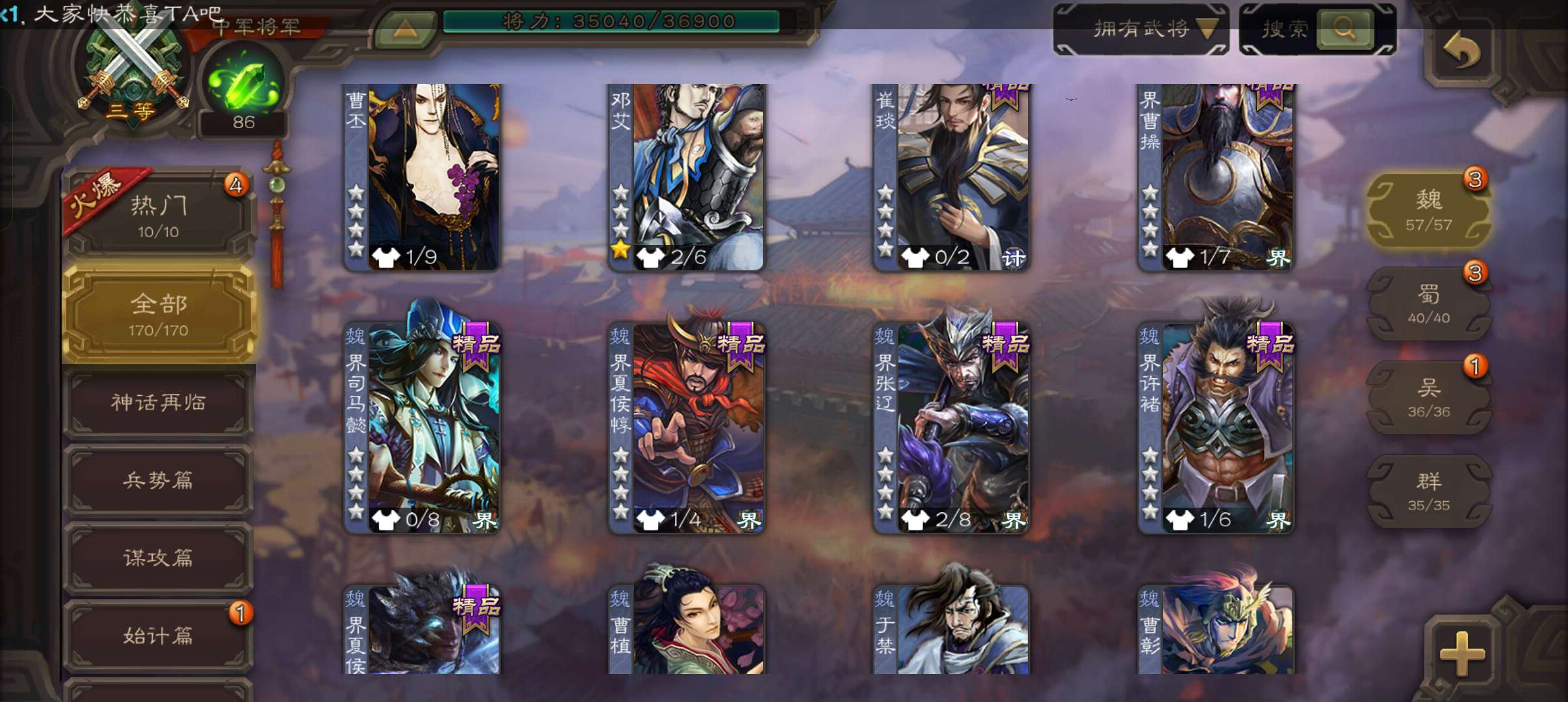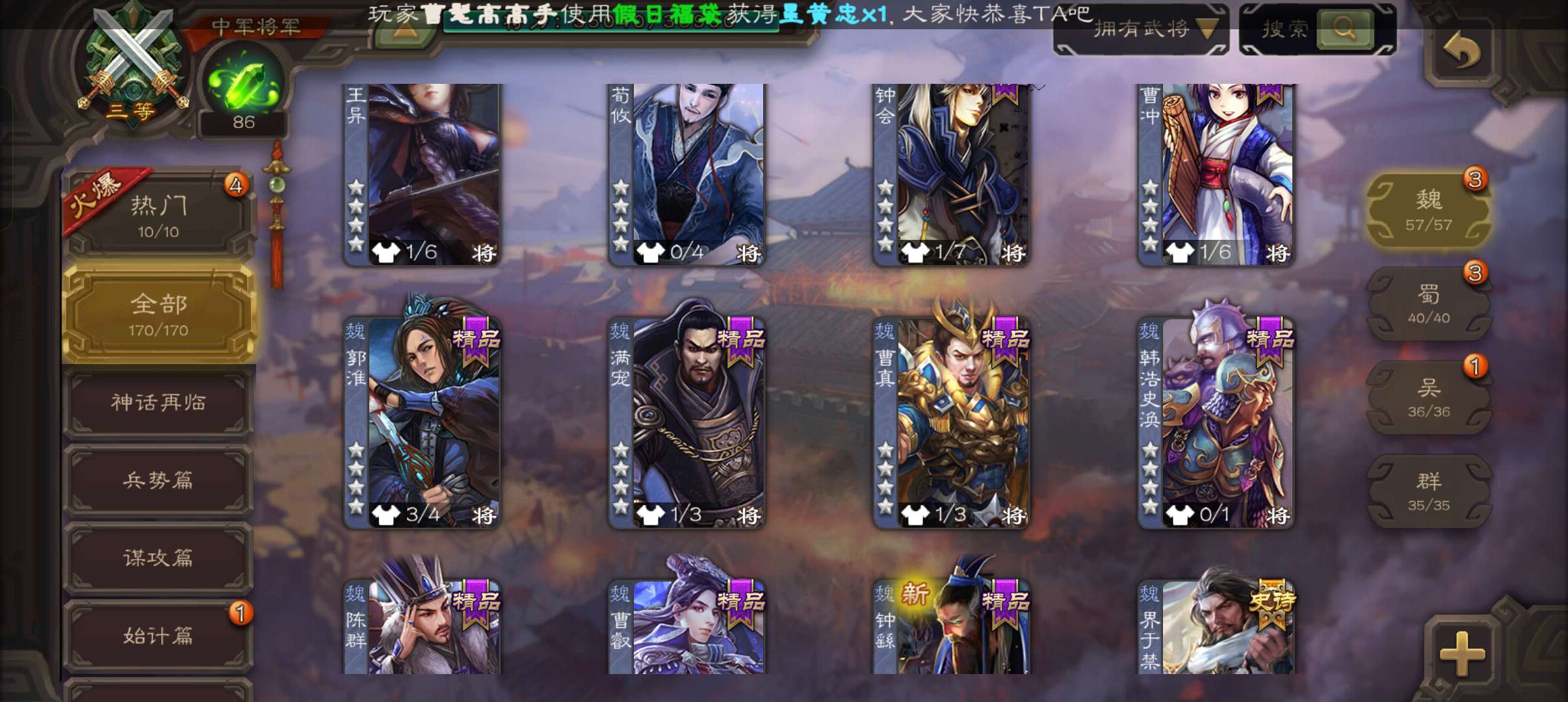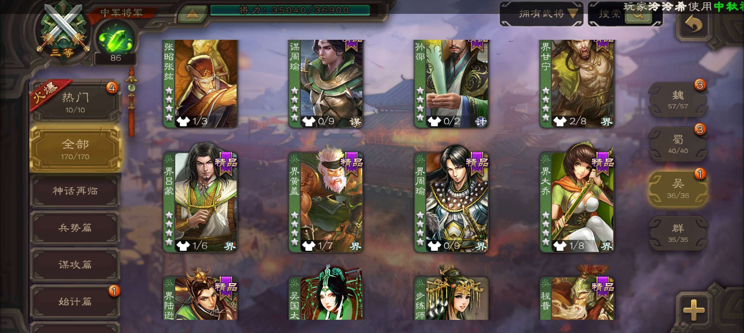 三国杀【安卓官方】7.9万羽毛7万豆,友诸葛亮神赵云神吕布戏志才界钟会界于禁牵招10史诗中军,谋周瑜界满宠170将