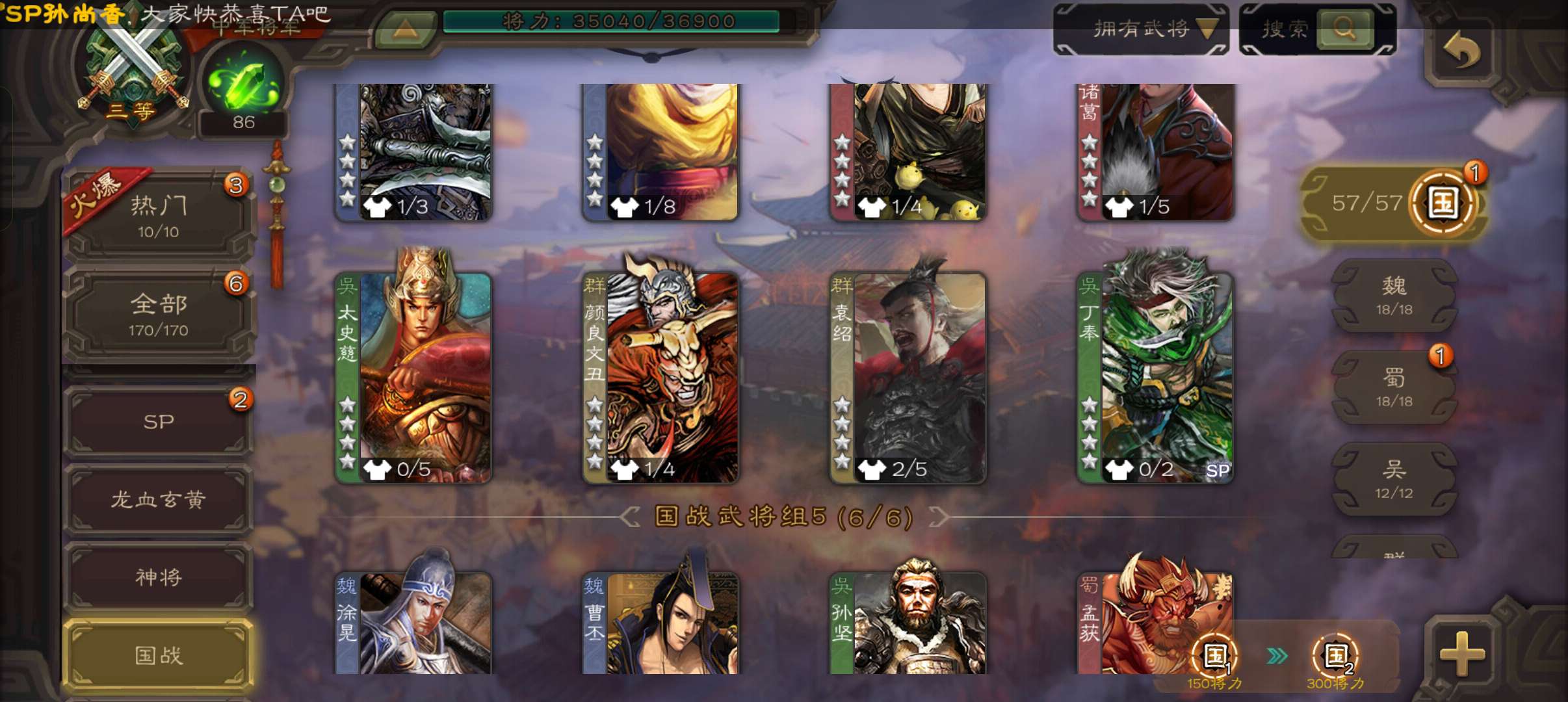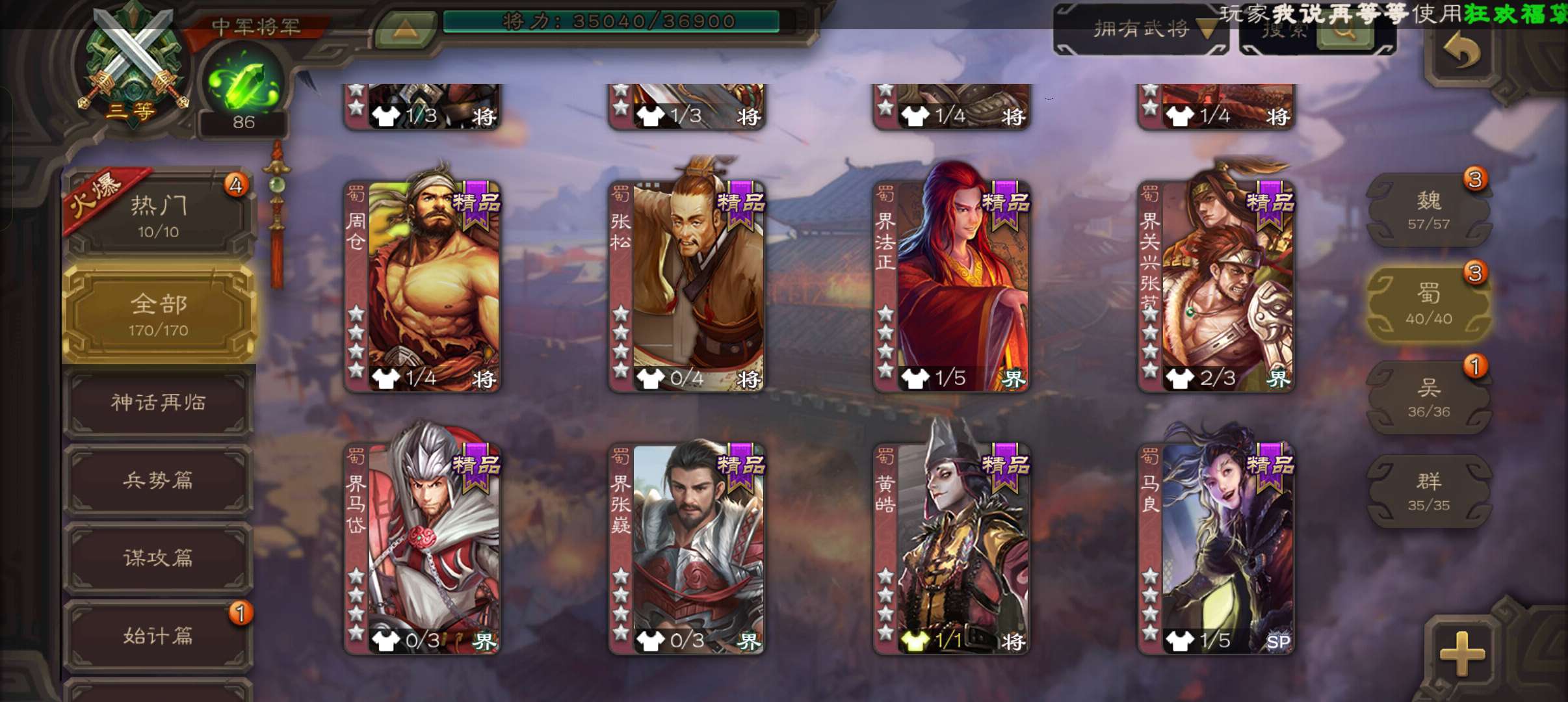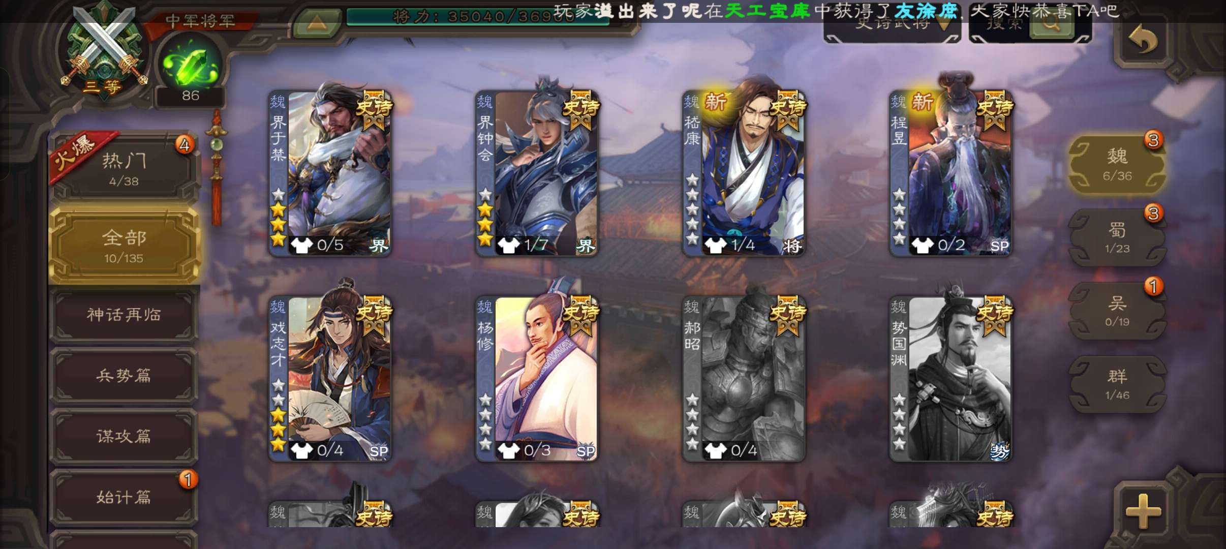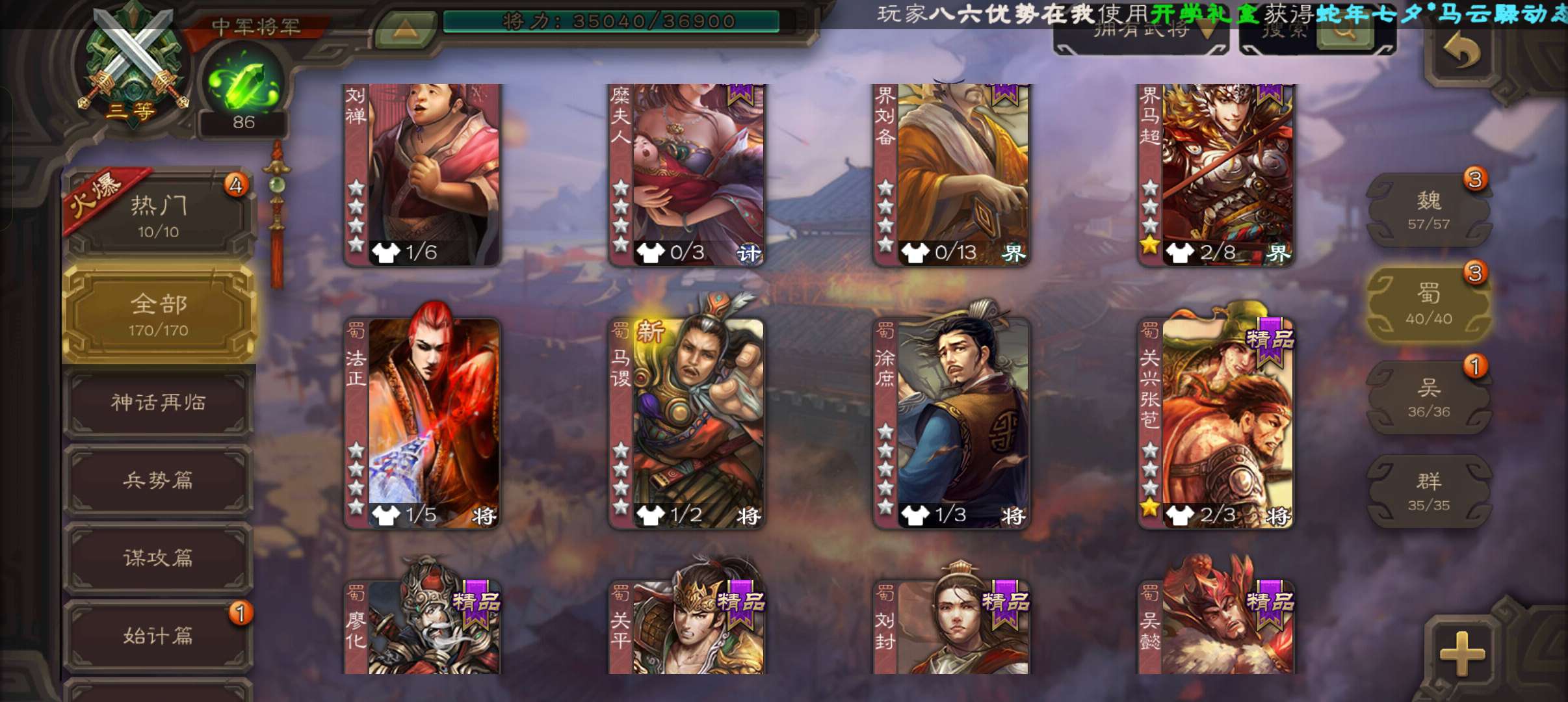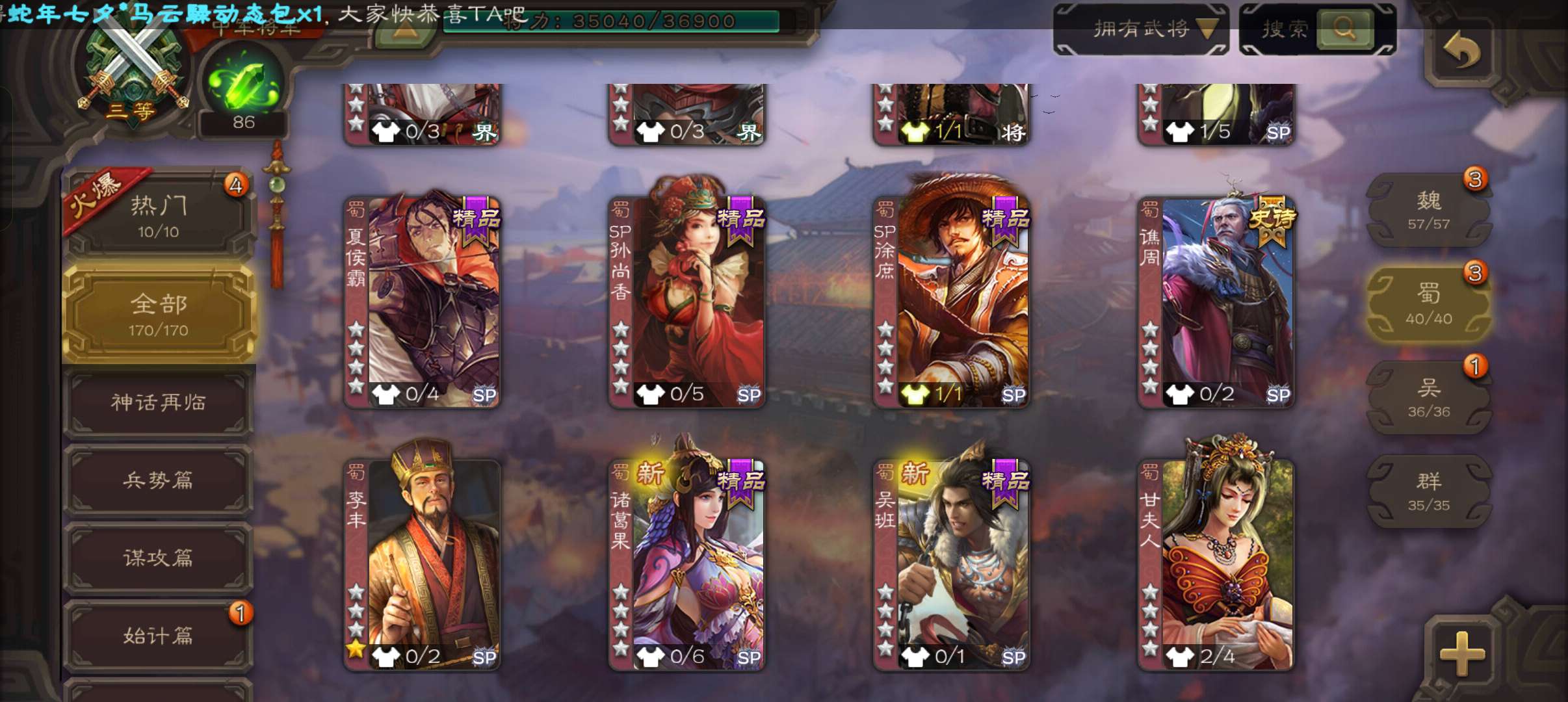三国杀【安卓官方】7.9万羽毛7万豆,友诸葛亮神赵云神吕布戏志才界钟会界于禁牵招10史诗中军,谋周瑜界满宠170将