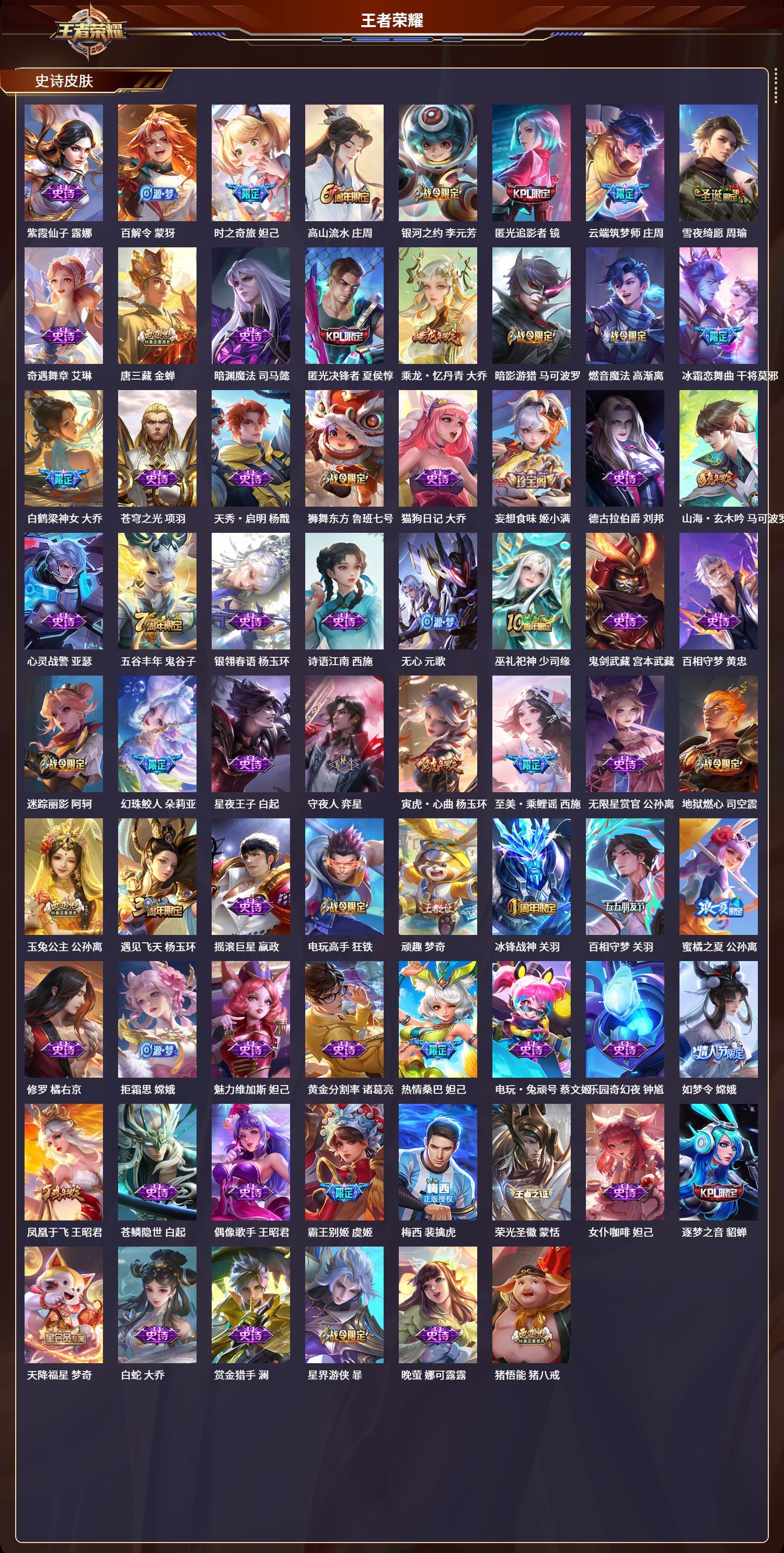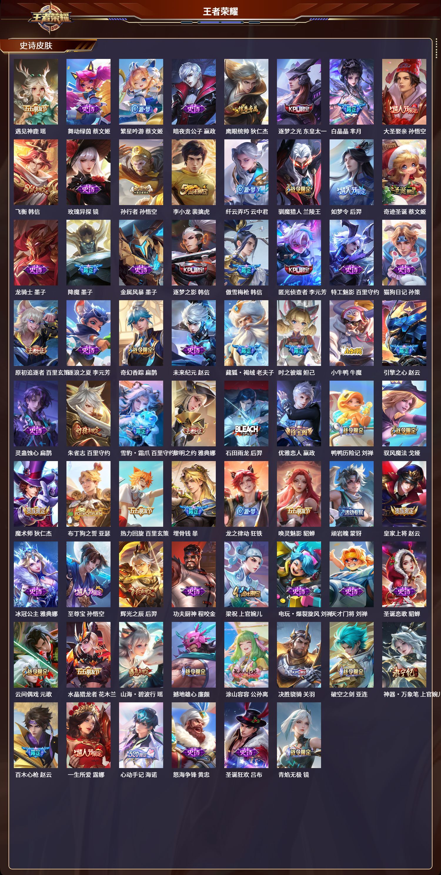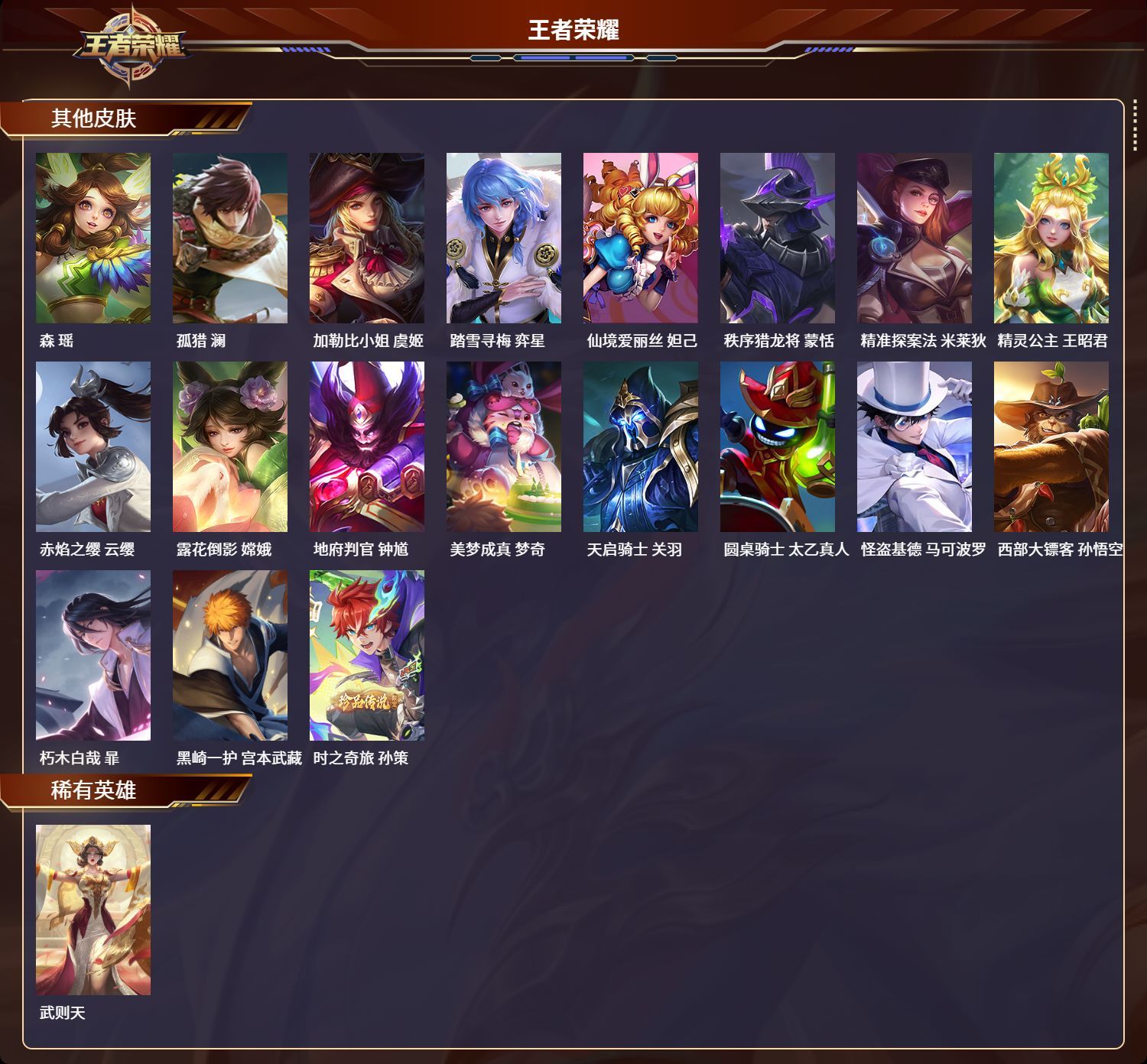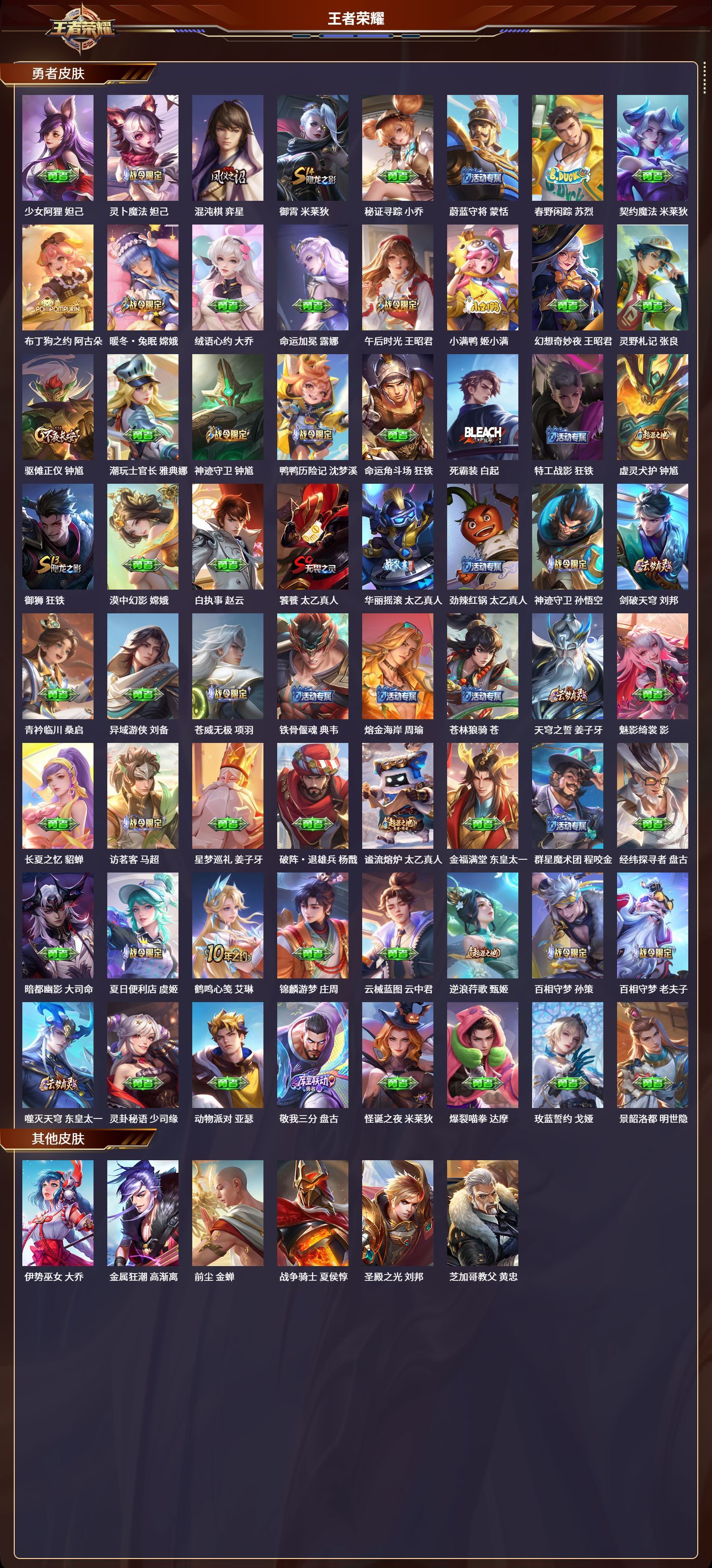 安卓QQ/无双王者/638皮肤/128英雄/5典藏/1珍品无双/6无双/7珍品传说/112传说/21